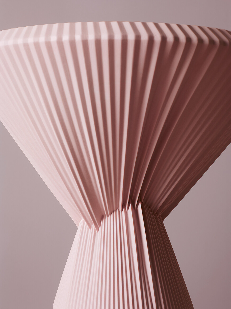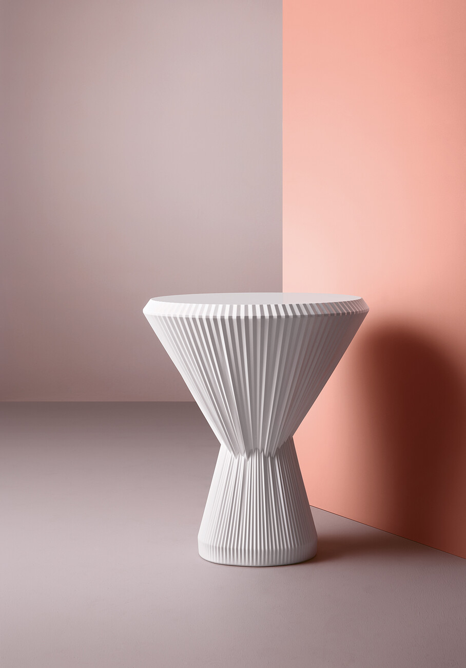 And there is always a twist to their work – as with the unusual “MOA” baskets for kkaarrlls: With an unusually large diameter of 130 centimeters the baskets consist entirely of elastic thread in various colors and resin – making them both sturdy and lightweight. Besau Marguerre love experimentation yet this is not immediately apparent in their designs, which do not appear coarse or unfinished but are inherently consistent. “Plisago” for Fürstenberg is a hybrid made entirely of porcelain and featuring two stacked intertwining cones. The surface top is diamond-cut which ensures it is very sturdy. Given a pleated look and a matt glaze “Plisago” toys with what we are accustomed to seeing, the porcelain appears soft and fabric-like. “In this project we explored the boundaries of the material,” says Eva Marguerre. The next step was to translate “Plisago” into wall shelves; other projects with Fürstenberg are to follow.