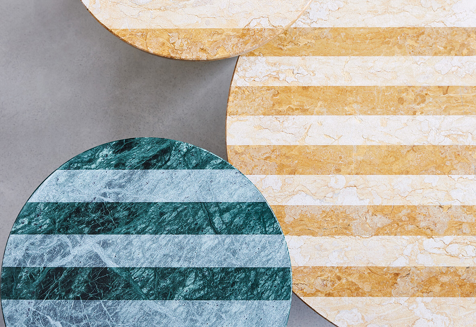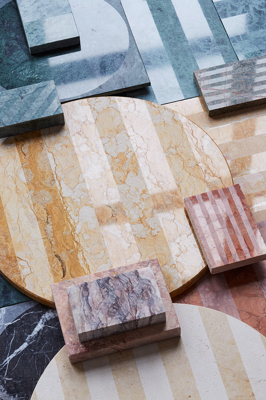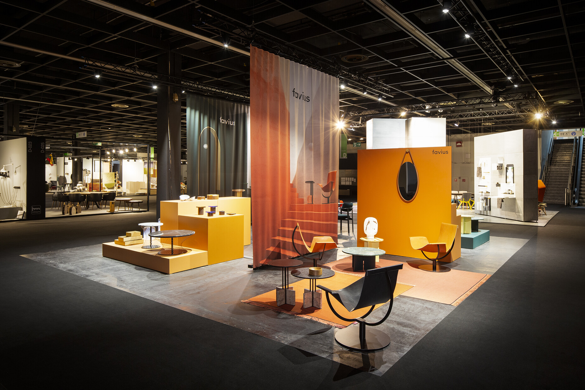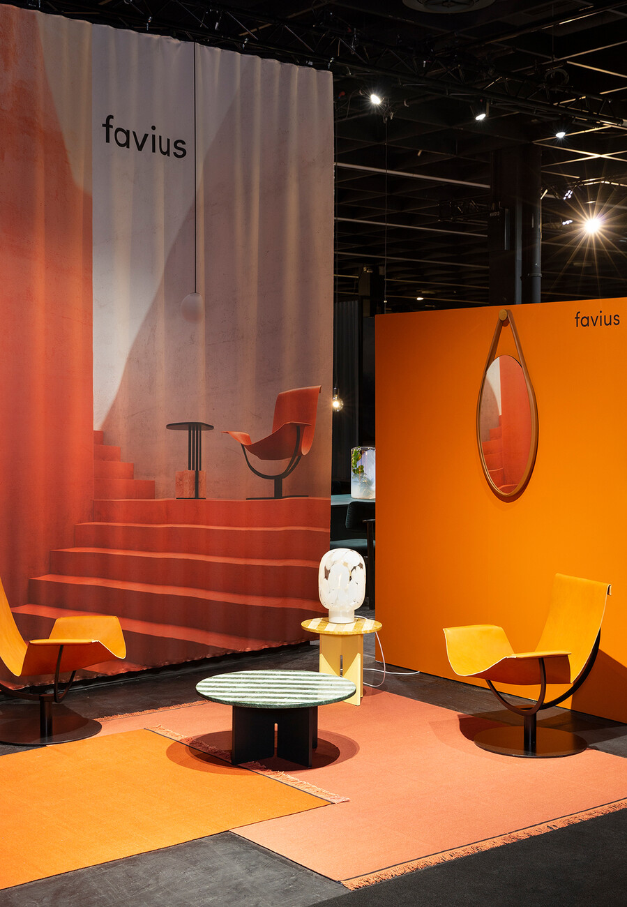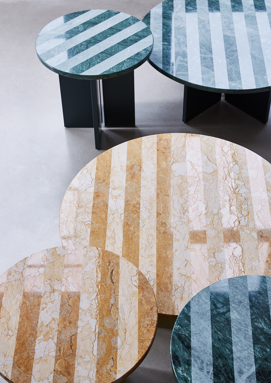 For imm cologne 2020 Besau Marguerre designed the open exhibition stand concept for the new “favius” design brand. Just a few elements were used in the installation to underscore how the manufacturer interfaces between art and architecture: Printed curtains divided the area into sections for new items, living, sales and shop presentation. Two color scenarios in cognac and dark green and the elegant presentation of the products offered many different perspectives. “Through our contribution we can be involved in shaping the route ‘favius’ takes, and we find that really exciting,” related Eva Marguerre. A product of their own design was also showcased on the platforms, namely the marble “Sediment” side and coffee table, the title alludes to the surface’s resemblance to precisely such a layer name. It visualizes Besau Marguerre’s exploration of the possible surface treatments of the material marble. Smooth and rough sections of the marbles “Giallo Reale” and “Verde Guatemala” in green and golden yellow alternate and form tops in two sizes resting on straight bases of lacquered oak. “We were given a very general briefing and the freedom to experiment to our heart’s content,” says Eva Marguerre.