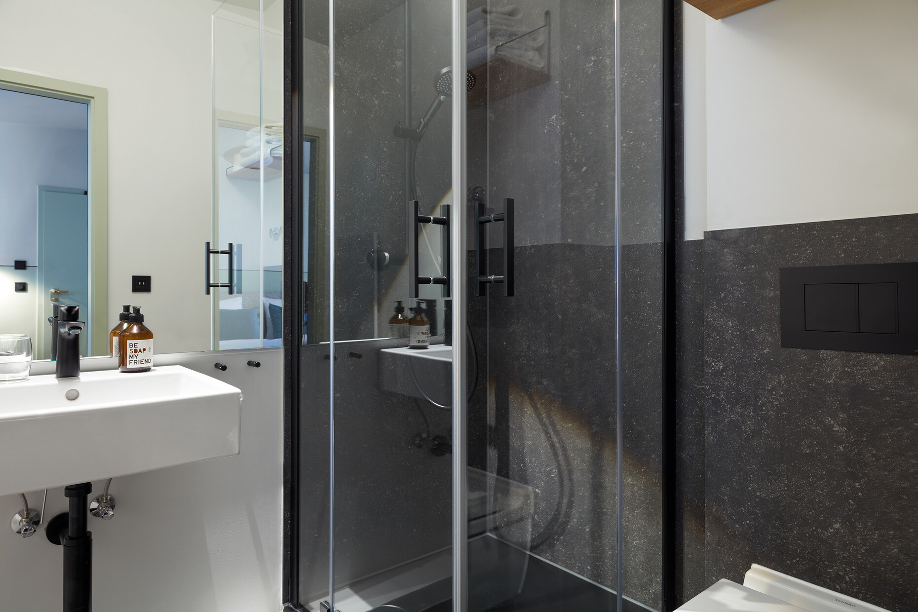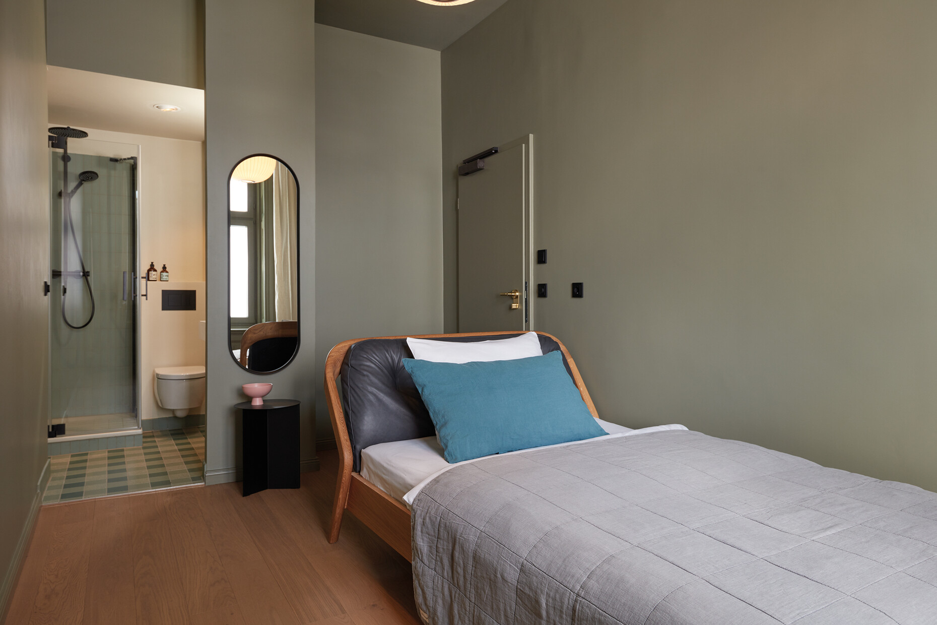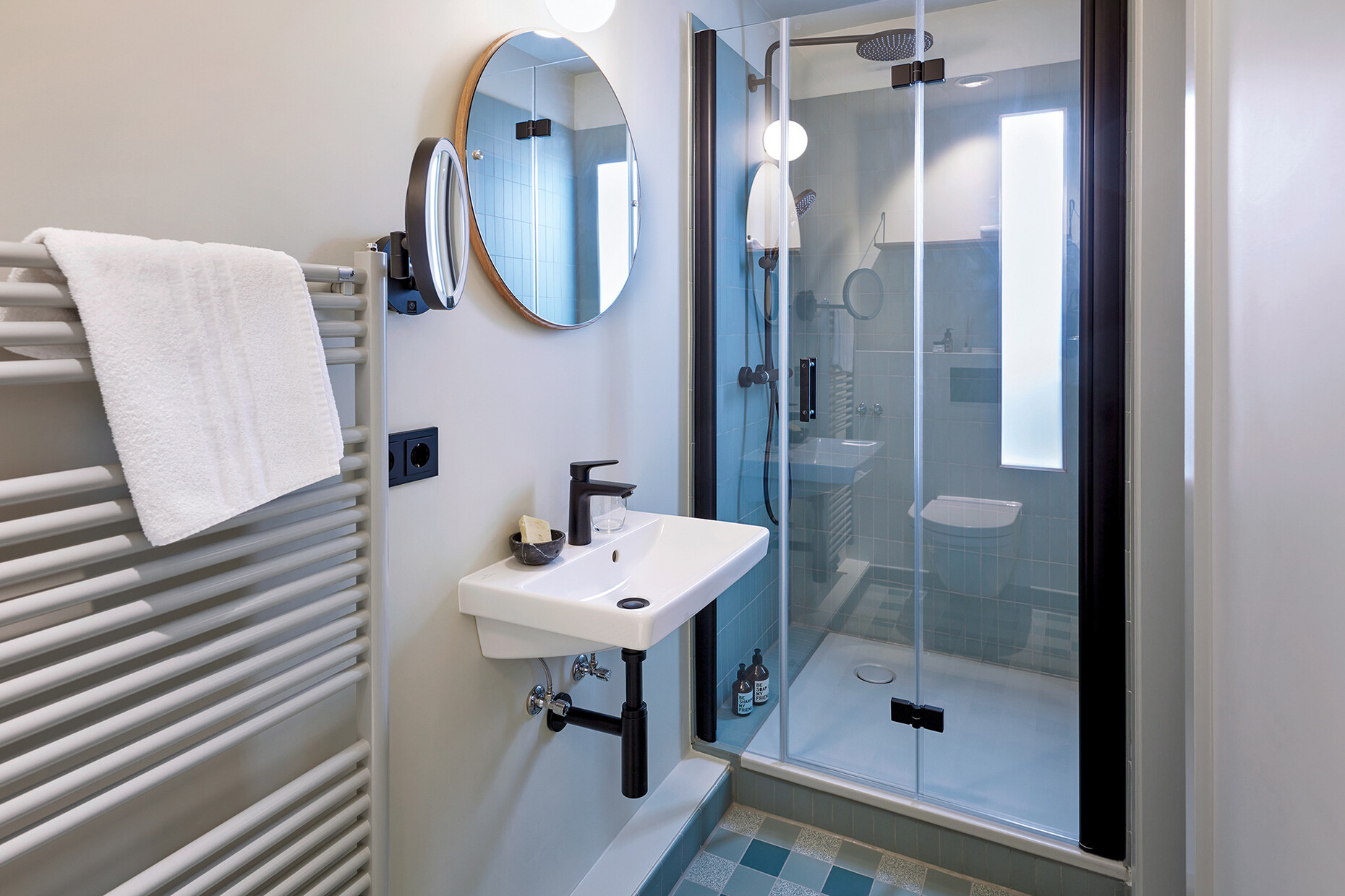 A highlight for the guests are the cozy feel-good bathrooms in pleasant shades of green and anthracite. In a contemporary touch the open bathrooms are integrated into the hotel room and the extraordinary shower trays of manufacturer Bette make a decisive contribution to the feeling of wellbeing guests experience: So that showering guests do not disturb the people in the next room Bette shower trays have integrated sound proofing and come fitted with anti-drone mats. “What made us choose Bette shower trays was the attractive design, the minimalist formal language, the matt finish and simple care,” stresses the stilwerk owner. In particular, the choice of color at Bette – in this case mint green “Flint” and anthracite “Raven” harmonizes perfectly with the color concept of the bathroom so that the open transition between sleeping and bathing area merges smoothly with the overall appearance. The fact that the classic shower tray “BetteUltra” with its tight R10 corner radiuses fits perfectly into the grouting pattern heightens the desired look. Even the drain covers finish flush with the tray surface and thanks to their form and matching coloring they create a uniform appearance.