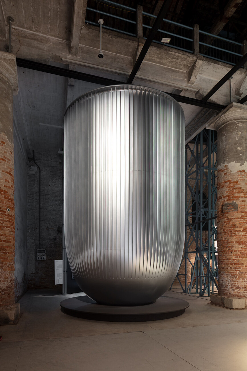 The ‘Natural’ section remains the most exciting with a series of mock-ups and approaches to renewable, resource-saving natural materials. Anyone thinking of wood and clay will be amazed at what else research has to offer. Algae, fungi and bacteria can be seen here, which will soon find their way into the industrial construction industry. Biomaterials are currently both a magical substance and a hope for the future, sometimes the result of research and then again surprisingly down-to-earth. What looks like bricks in the beautiful large installation of the Elephant Chapel is produced naturally using significantly less energy. The bricks of the 1:1 model by Booserm Premthada, founder of Bangkok Project Studio, are made from elephant dung – the project was honoured with a well-deserved Special Mention. The international jury, which included Swiss curator and art historian Hans Ulrich Obrist, Paola Antonelli from the Museum of Modern Art New York and South African architect Mpho Matsipa, professor at the Bartlett School of Architecture in London, awarded the Golden Lion of the main exhibition to the Canal Cafe by Diller Scofidio + Renfro with Natural Systems Utilities, Sodai, Aaron Betsky and Davide Oldani. ‘A demonstration of how the city of Venice can become a laboratory for the idea of new ways of living on water,’ reads the citation. The four large, transparent water cylinders of the open-air installation on the harbour basin of the Arsenale can be seen from afar. The water from the lagoon is filtered in them and then processed into a café for visitors to enjoy. A bar as a laboratory for the future of the lagoon city.