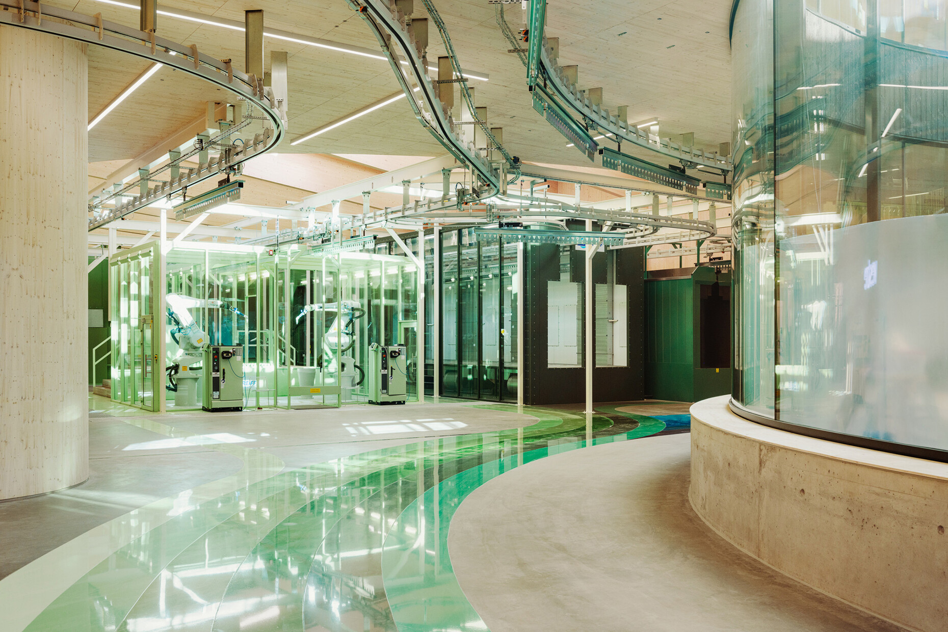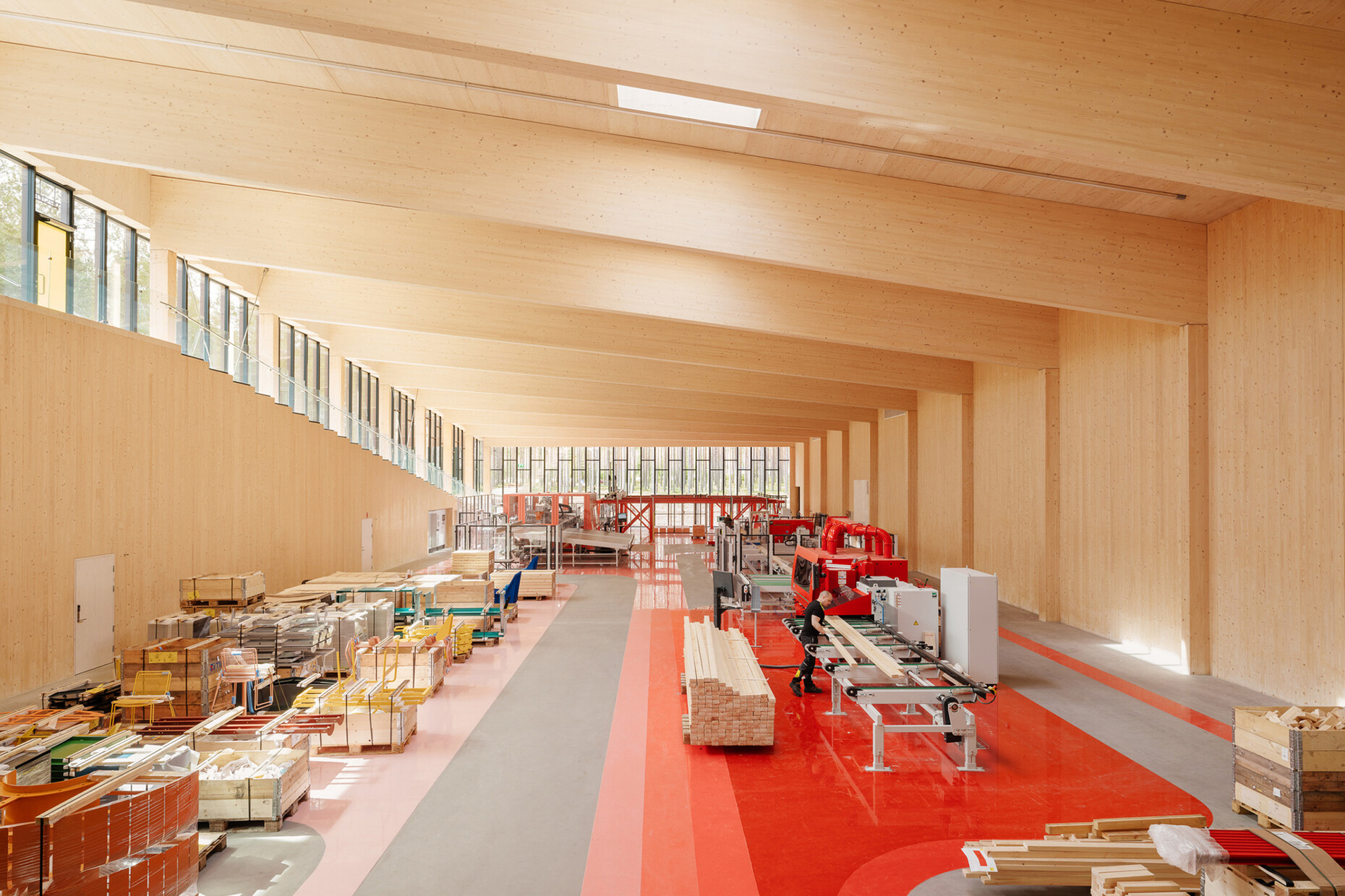 Kai-Uwe Bergmann: The building is made of indigenous solid wood, low-carbon concrete, and recycled steel and is destined to be the very first industrial building to meet the highest ecological benchmark, the BREEAM Outstanding. To meet it, all factors that characterize sustainable architecture have to play a role, from grey energy for the construction materials used to the actual furniture production. In the process, we also tried to involve as small a footprint for the building as possible.