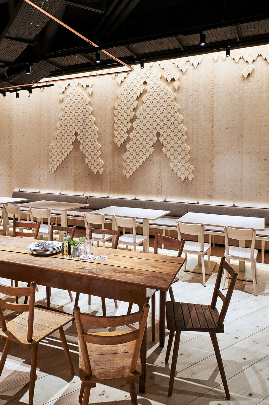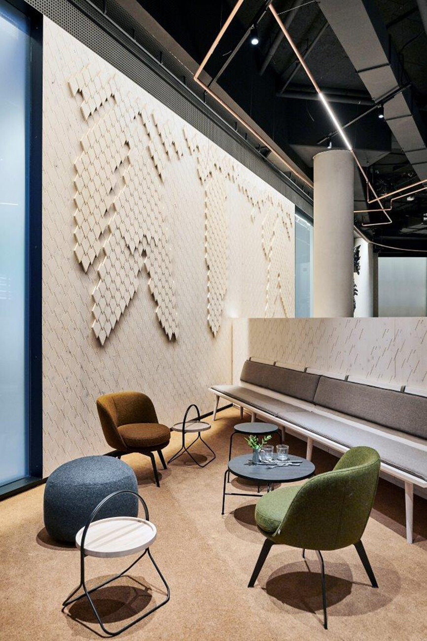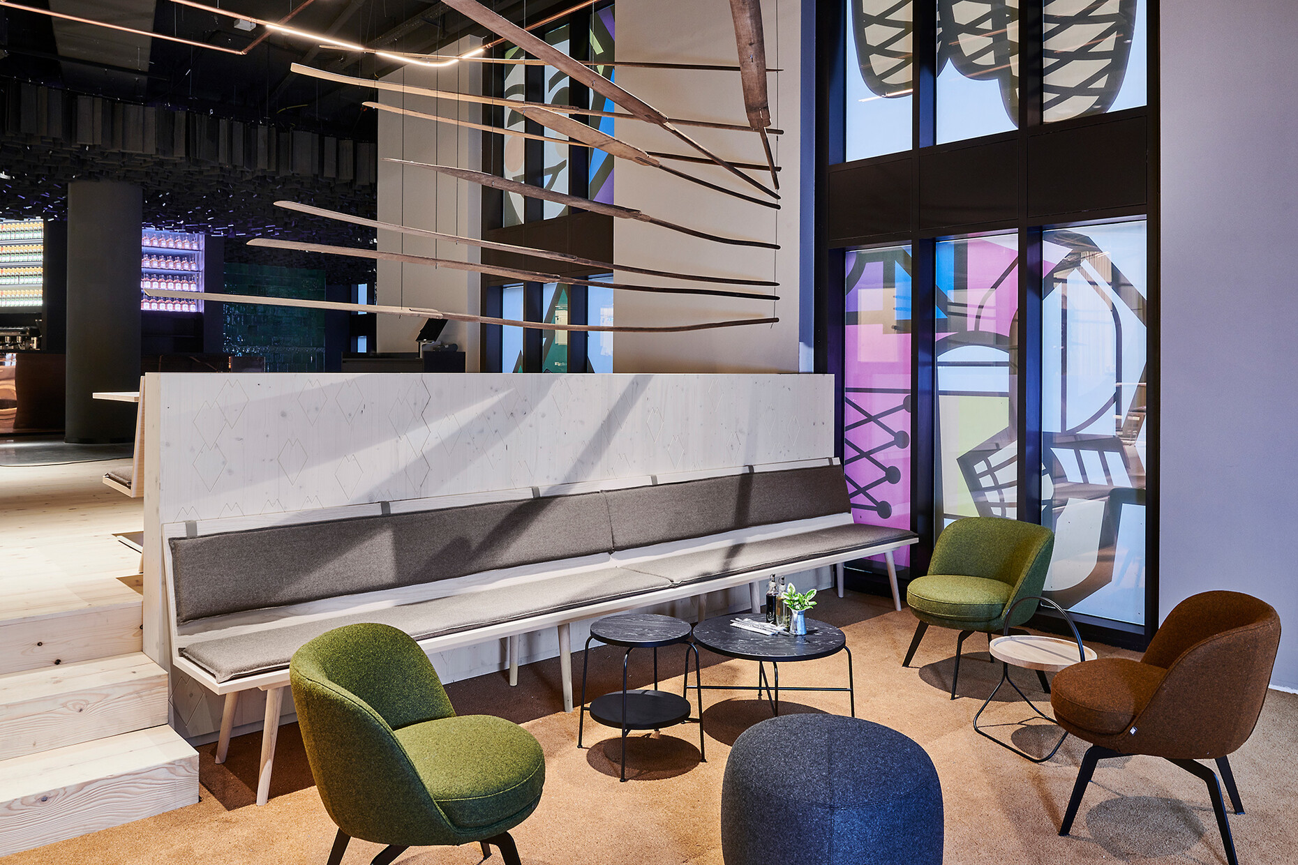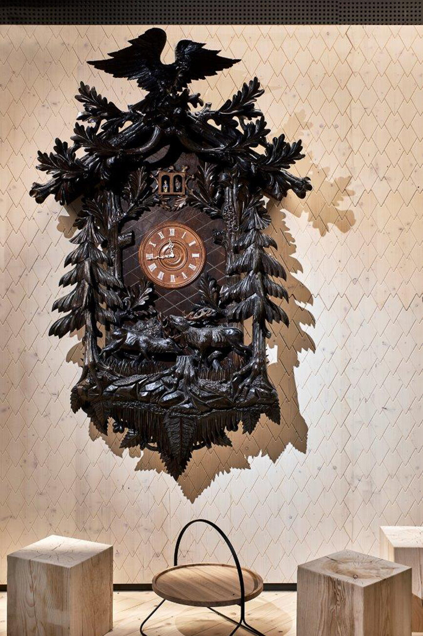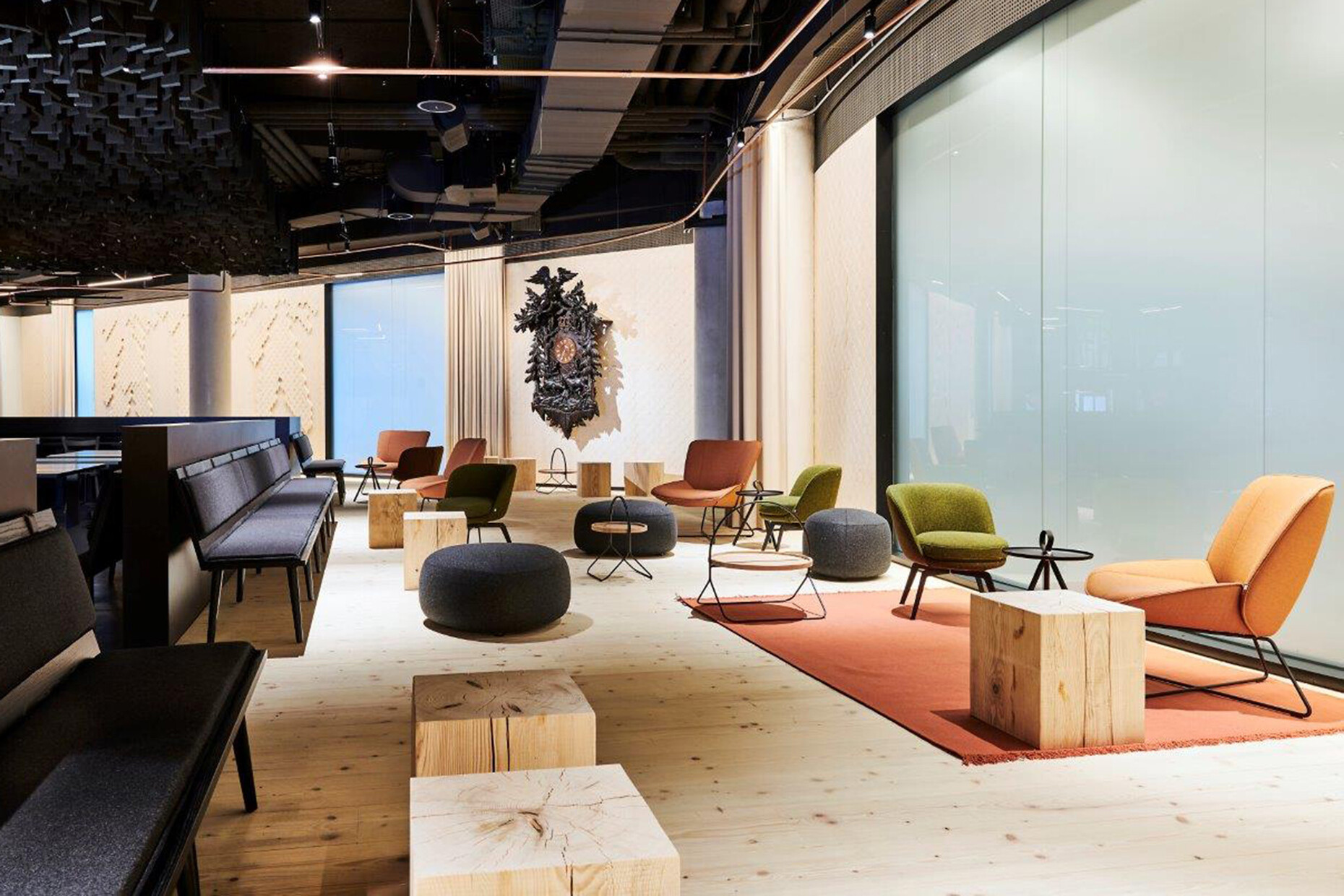 The architectural concept was purpose-created by the specialists at blocher partners in Stuttgart. The architects divided the interior space (which spans a total of 760 square meters) into different zones. The most striking feature of these is the sub-division into a light and a dark area. The “light” area is dominated by conifer wood furniture, floors and wall paneling. The impression conveyed here is one of a tavern in a modern yet homely rustic style which nevertheless is firmly contemporary. Stylized pine cones adorn the walls in a reference to the Black Forest and the famous “Tannenzäpfle” beer emblem. An eye-catching oversize cuckoo clock hangs on the wall in the adjacent lounge area. Here, guests can relax in the comfortable Rolf Benz 383 and Rolf Benz 562 armchairs. These are upholstered in Kvadrat fabrics in copper, green and anthracite. The armchairs are complemented by freistil 158, Rolf Benz 947 and Rolf Benz 973 tables.