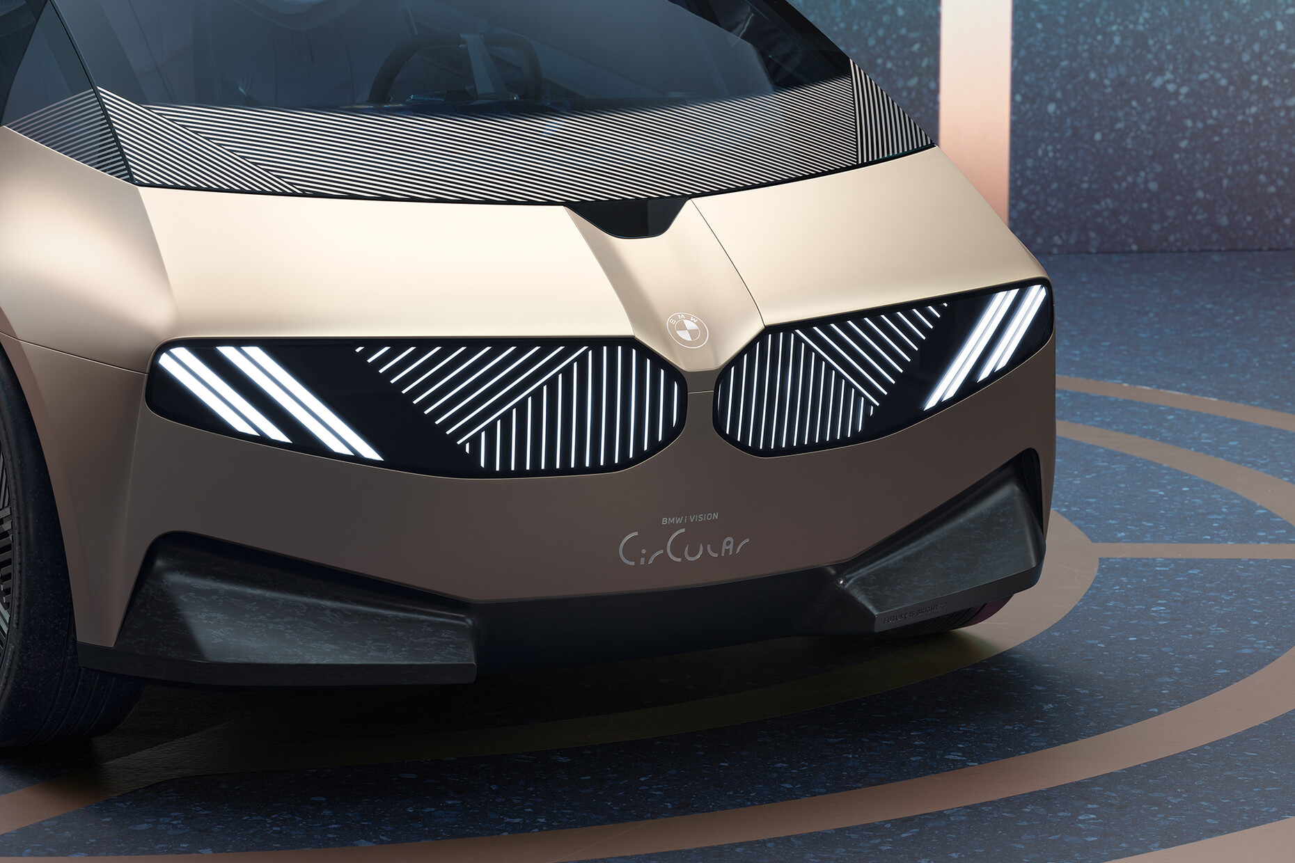 This is why the Bavarian automobile virtuoso has designed the "BMW i Vision Circular" according to the principles of the circular economy. Alongside bio-based, certified raw materials other materials are used that have already run through a product lifecycle. The same goes for the energy employed which is why the solid-state battery is 100 percent recyclable and is manufactured almost entirely from recycled materials. Here the four guiding principles are "Re:Think", "Re:Use", "Re:Cycle" and "Re:Duce". The latter refers among other things to the reduction of components, material groups, and surface finishes – forgoing exterior varnishes, leather and chrome. Instead, there are tires made of natural rubber with a terrazzo-effect, a 3D-printed steering wheel rim of bio-based materials, and a fender area with a marbled surface of recycled plastic. In place of a varnish the "BMW i Vision Circular" boasts a gold-bronze colored anodized surface of secondary aluminum. The most radical stylistic changes are the engraved brand emblem and the reinterpretation of the characteristic BMW kidney grille as well as the headlights at the front that now emit digital light.
