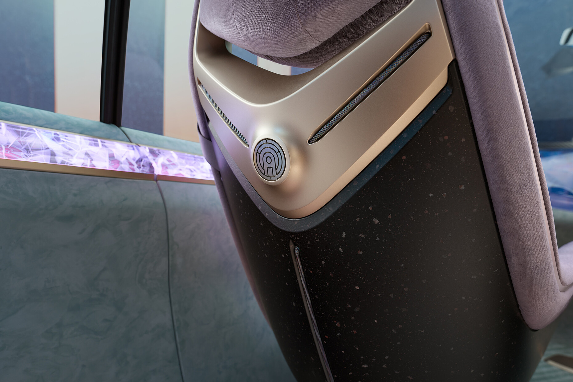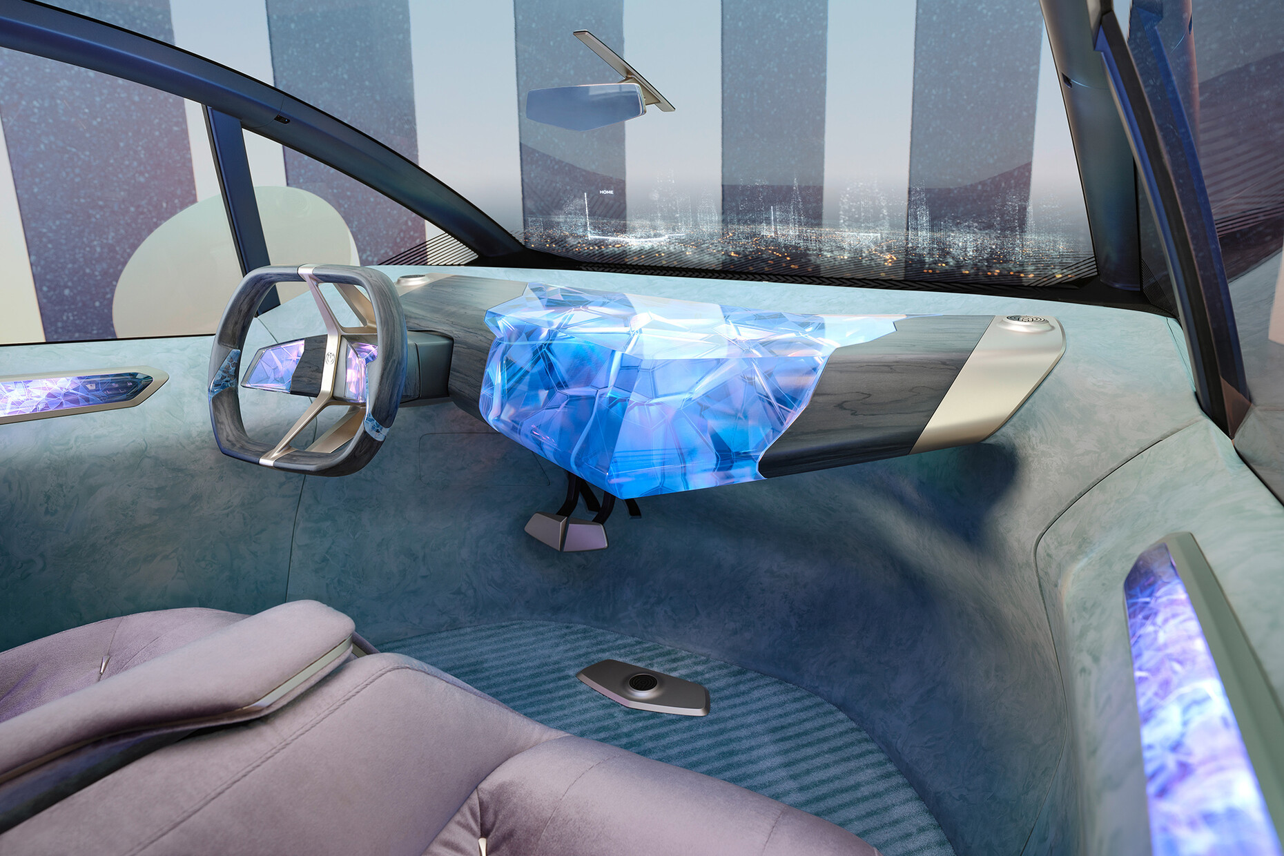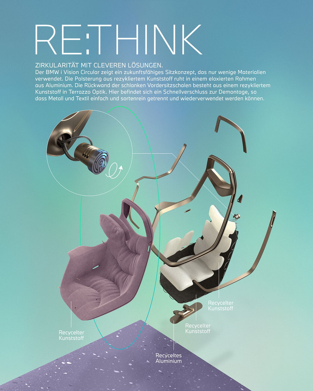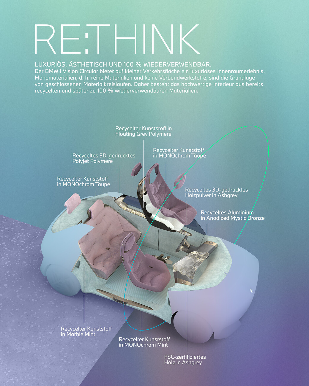 In other words the "Re:Duce" aspect of the "BMW i Vision Circular" also refers to its minimalist-futuristic design; in fact, the monolithic shape really does make you think of the year 2040 and beyond. This also involves minimizing the volume yet despite its smaller footprint the car still has a roomy feeling to it. It’s an impression created in part by the two front seats resting on a slender base that are somewhat evocative of executive office chairs. Moreover, the restrained rearview mirror produces a spacious feeling. The seat upholstery is made of recycled plastic and is embedded in a pale gold aluminum frame. Unfortunately, pastel shades with a mixture of mint green and taupe with gray and violet as well as golden bronze are favored for the color concept, something somewhat at odds with the sculptural, futuristic exterior.