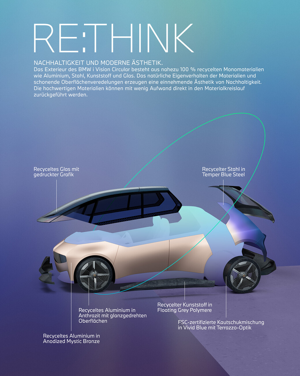 Sustainability is the buzzword of the current age. That is hardly surprising given that the climate crisis has been making itself felt for some time and is forcing industry to reconsider and recalibrate. This also holds true for carmaker BMW which is presenting its "BMW i Vision Circular" at this year’s IAA International Automobile Show. It’s a roughly four meter long, fully electric, four-seater car. The idea is to look ahead to 2040 and to explore options for a sustainable and simultaneously luxurious BMW. The "BMW i Vision Circular" is one of five concept cars with which the company wants to reimagine the topic of urban mobility taking into account electromobility, digitization, and sustainability.