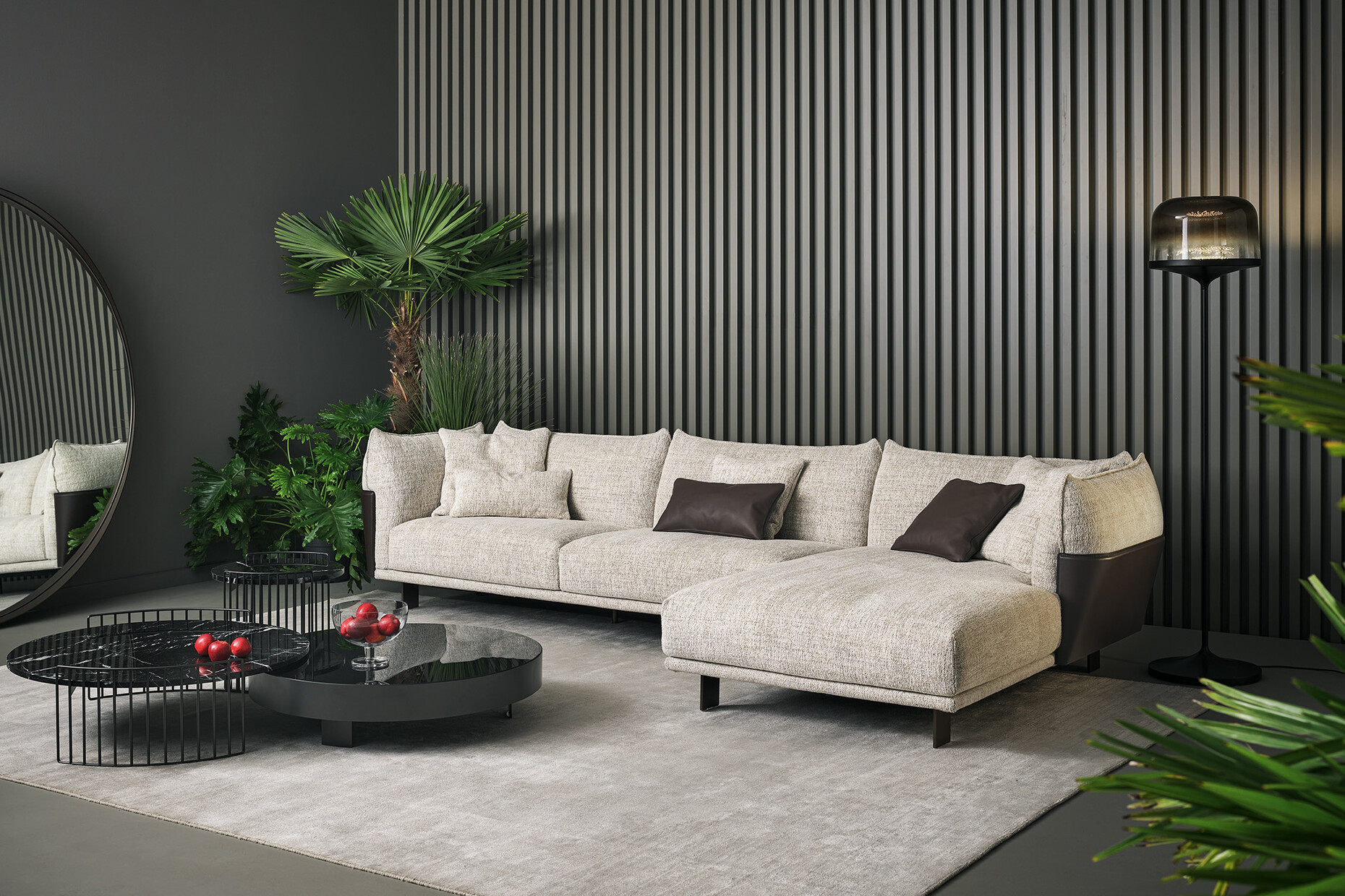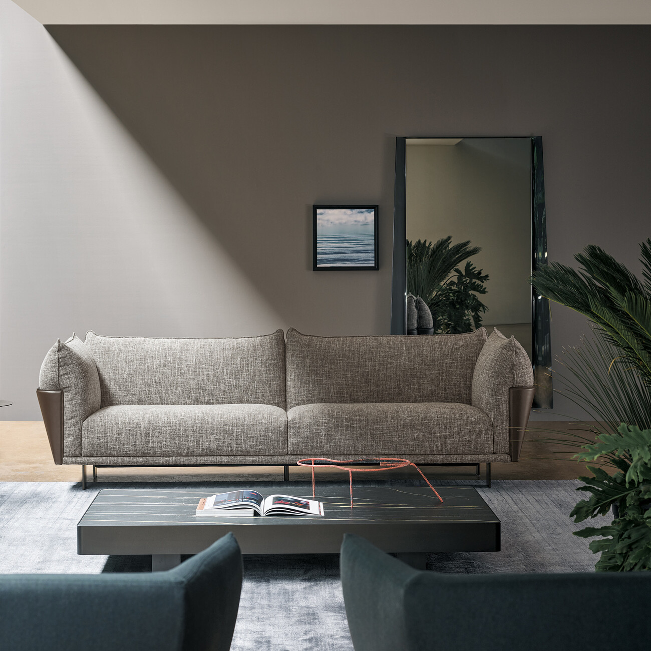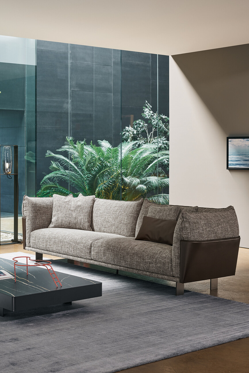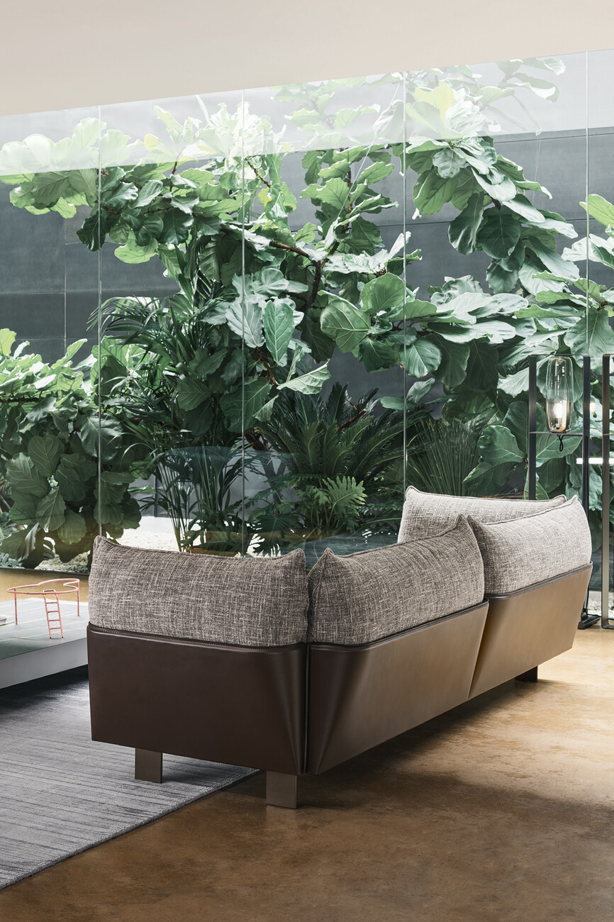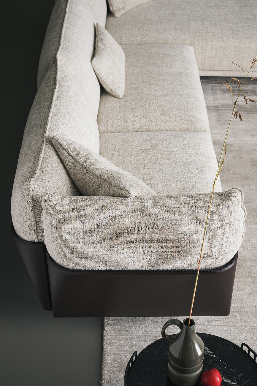 With "Blend", the Italian furniture manufacturer Bonaldo launches a sofa collection designed by the Italian designer Giuseppe Viganò, which skilfully combines design contrasts: "Blend" joins emery leather with fabric, whose interplay appears strict and playful at the same time. A support structure clad in core leather forms the back and sides of the sofa and thus encloses the generous seating areas made of fabric. It thus creates a strict frame for the elegant seating surface, which is simultaneously softened by curved fabric cushions. "Blend" also includes various end, corner, chaise longue and pouf elements that allow the respective sofas to be adapted to a wide variety of spaces. The collection is part of Bonaldo's Living 2022 catalog, in which the company introduces new sofas and armchairs as well as iconic pieces from its collection.