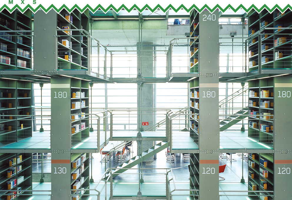From the sequenced spaces of the reading rooms along the sides you get a good view of the totality of the structure. The identity of each room or cubicle is not the product of its own particular characteristics, but of its situation with respect to the great central space that forms the central backbone of the library. Each item on both sides of it is subject to the same symmetrical rigor: the design is based on a transversal section. On the outside, the horizontal blinds protect the reading rooms from direct sunlight, while ensuring that they nevertheless are suffused with natural light. The sawtooth roof succeeds, both formally and effectively, in introducing sunlight into the very depths of the great central space.