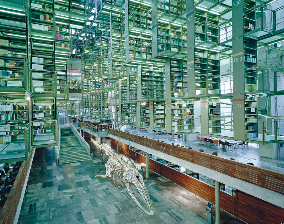 The edifice is essentially one great bookshelf designed as a standalone steel-and-glass structure suspended from the roof beams. In addition to this main structure there are three attached volumes integrated into the gardens: one contains office space, a second the bookstore, and a third, to the north, the auditorium. The skeleton of a whale–a contribution by artist Gabriel Orozco–hangs in the middle of this colossal space and reinforces the very essence of this imposing shed.
