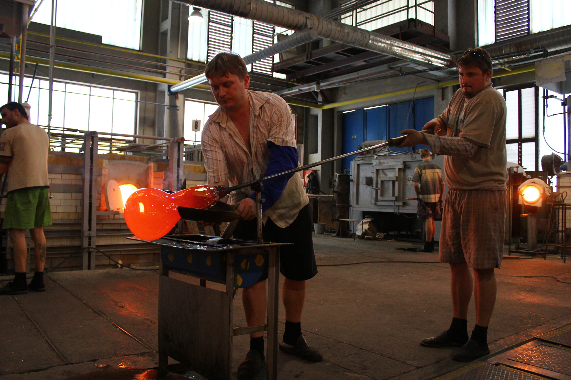 The hand-blown luminaires debuted in 2010 with the still bestselling “Muffins” and “Balloons” models by Lucie Koldova (now Art Director at Brokis) and Dan Yeffet – and “Memory” by Boris Klimek. Since then “Capsula”, “Shadow”, “Flutes”, “Nightbirds” and many other designs have been floated, as transparent as they are fragile. Nothing about these perfect items reveals that they first see the light of day in a rough-and-tumble workshop environment, and yet that is precisely their key quality. The process of manufacturing the luminaires involves a lot of heat, a truly impressive amount of background noise, and the substantial weight of the glassblowing rods – one reason why glassblowing at Brokis is only handled by men. In the furnaces, the molten glass reaches a temperature of about 1,400°C, and it gets blown into the right shapes at a temperature of about 700°C before cooling to approx. 550°C.