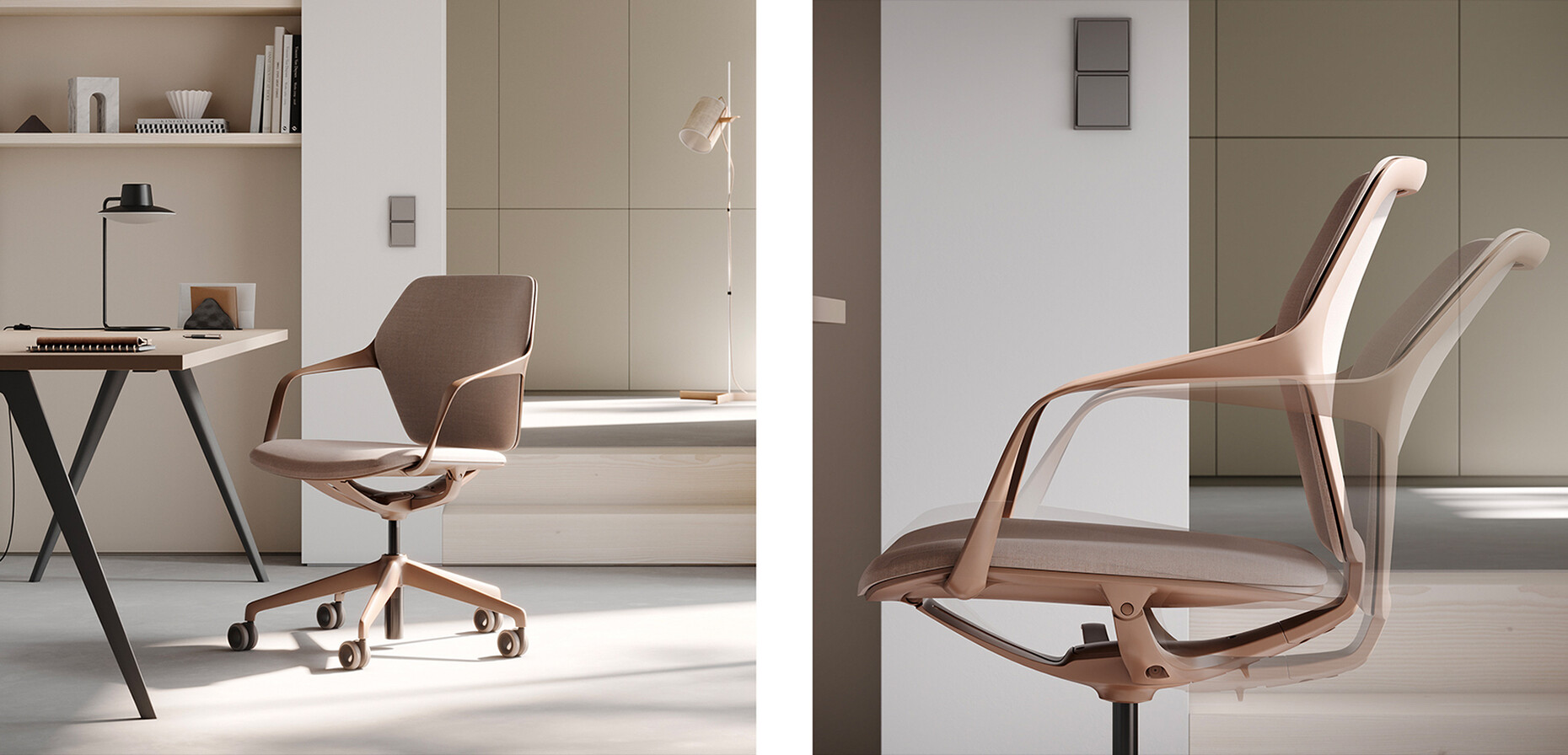 The longstanding collaboration between family-run company Brunner and jehs+laub has given rise to yet another innovation: the "ray work" universal swivel chair, which combines the creative skill of the Stuttgart design duo with the expertise of the Baden-based furniture manufacturer. With its mesh upholstery, synchronizing mechanism, and automatic weight adjustment, it adapts effortlessly to its users. Thus, ergonomics and elegance combine to form a particularly lightweight office chair that meets the high quality standards required for office furniture.