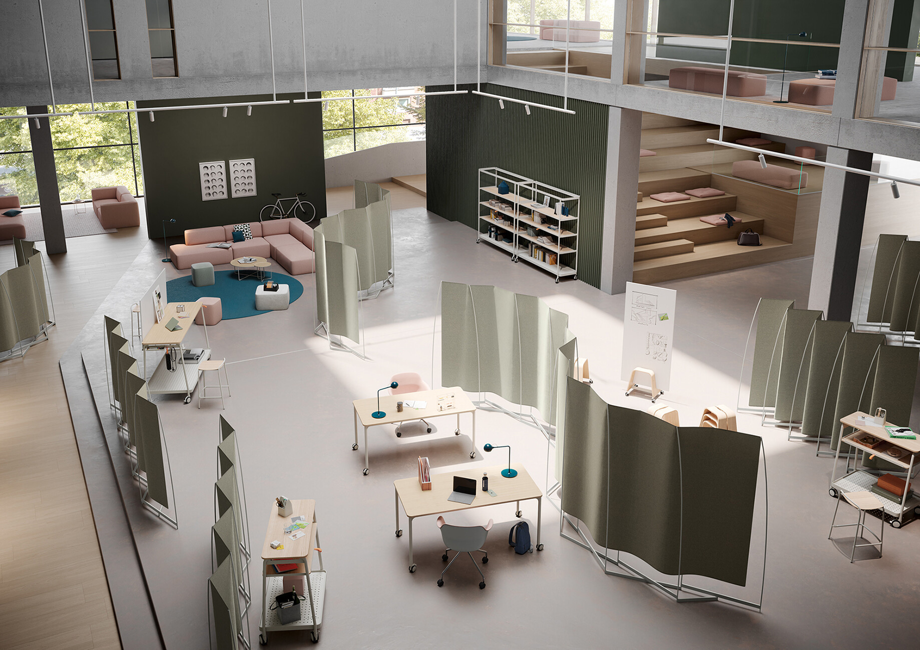 The "boards" mobile shelves from osko+deichmann can likewise function as flexible room dividers. With an extended range of functions, they meet all the requirements of New Work: as a media trolley, equipped with a new, magnetic whiteboard, or set up as a mobile coat rack. The stools in the collection feature rollers but function as stable furniture, as they can only be moved when bearing weight and remain firm while standing alone.