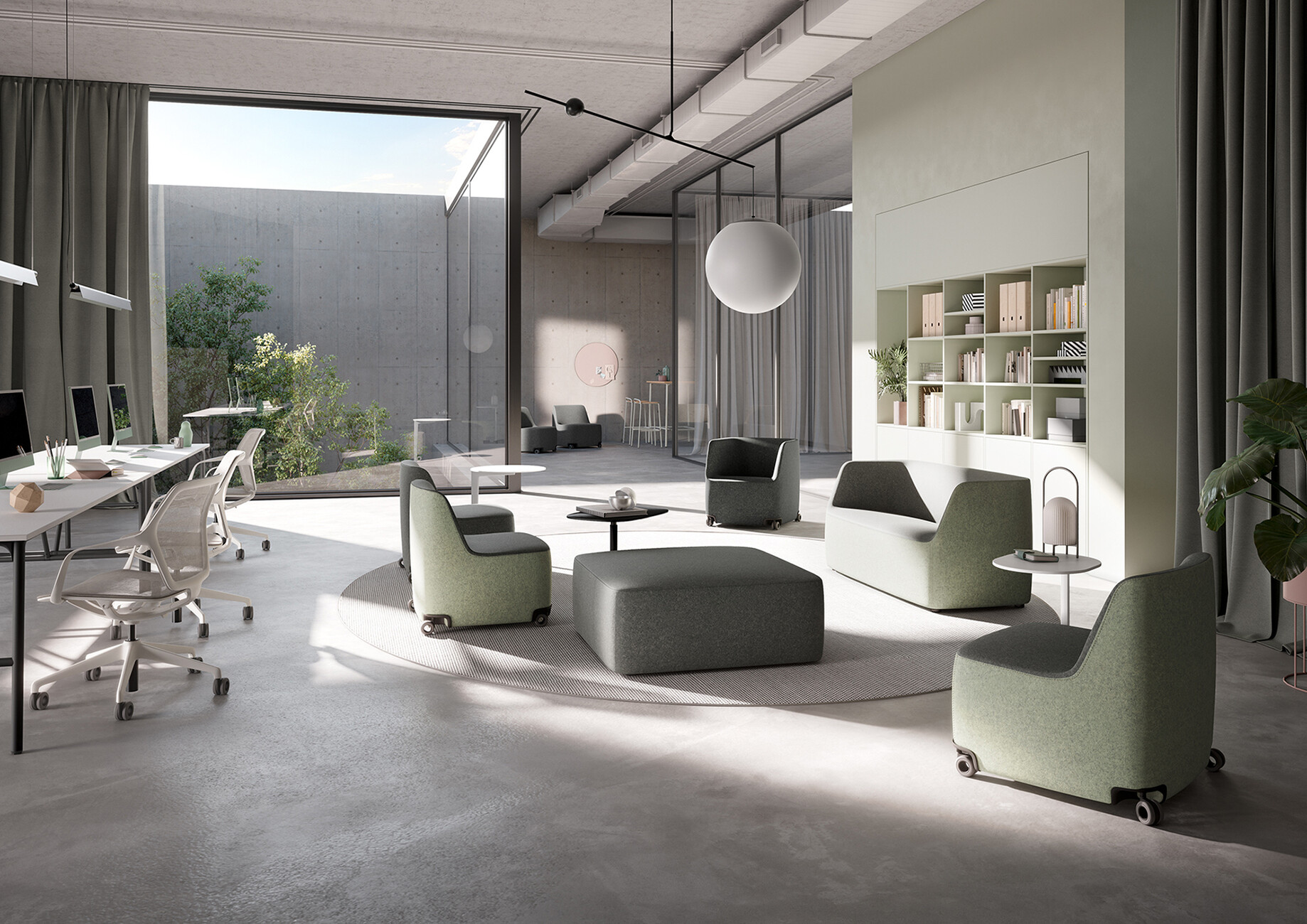 The ample expansion of the "pads" series to include a sofa and smaller armchair by jehs+laub, meanwhile, provides a great deal of design freedom in terms of seating options. The armchairs are now fitted with gliders or castors and thus ensure the utmost mobility in the office. With an optional writing tablet, they are ideal for informal meetings and casual discussions, or as an alternative workstation.