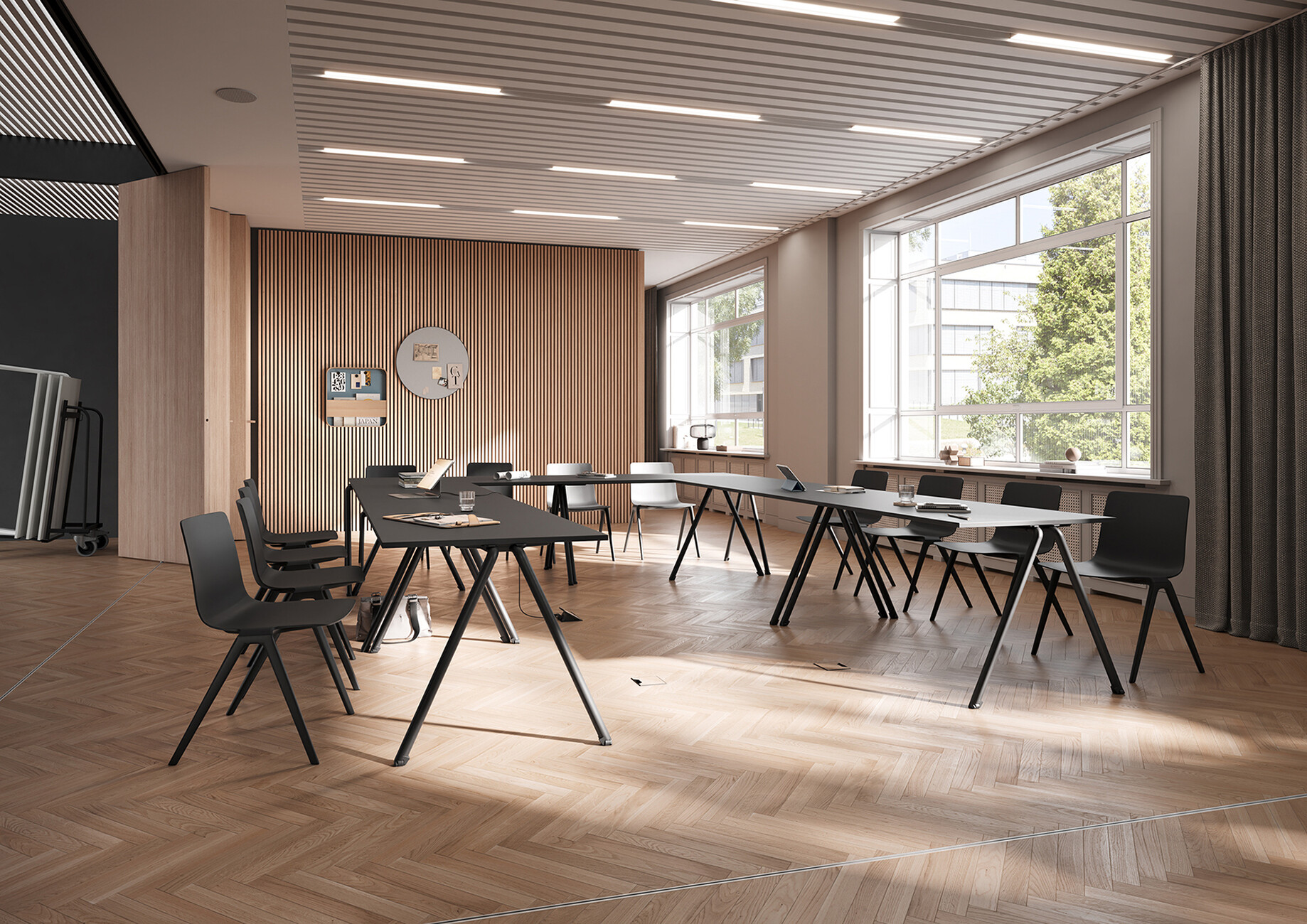 For its design, Roland Schmidt Design chose to focus on the technical attributes that simplify the changes involved in day-to-day goings-on at events and seminars. With "basic row", course scenarios can be set up in a practical, mobile, and permanently appealing design. The stackable conference table is extremely easy to handle and can be stacked effortlessly by just one person. Always ready for use, it is tilted by the matching transport trolley or lifted from the stack of ten. The castors discreetly integrated into the tubular steel frame mean the tables are positioned to protect the floor, while the underside of the slender tabletop hides a stacking buffer that allows the tables to be joined and separated without tools.