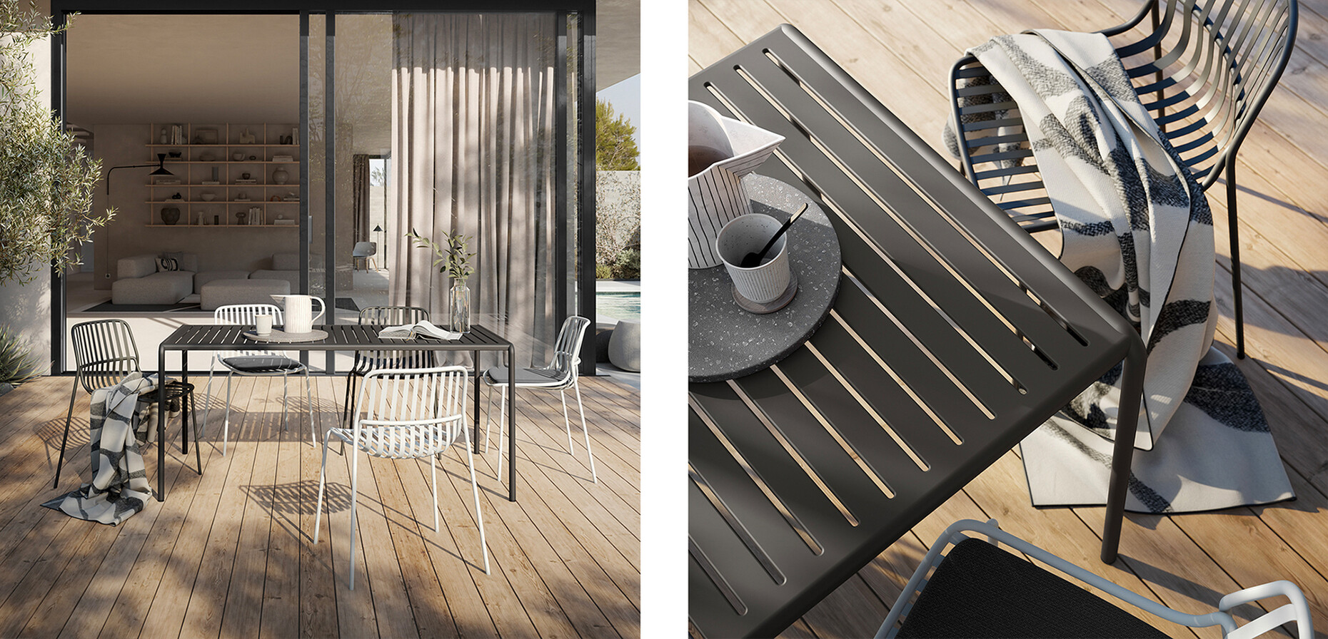 For "crona steel", too, Brunner has an innovation at the ready: Picking up on the lines of the successful outdoor series, tables with tops in an open flat steel strut design now complement the portfolio. Available in two heights, they fit perfectly into the outdoor collection as bistro or bar table variants.