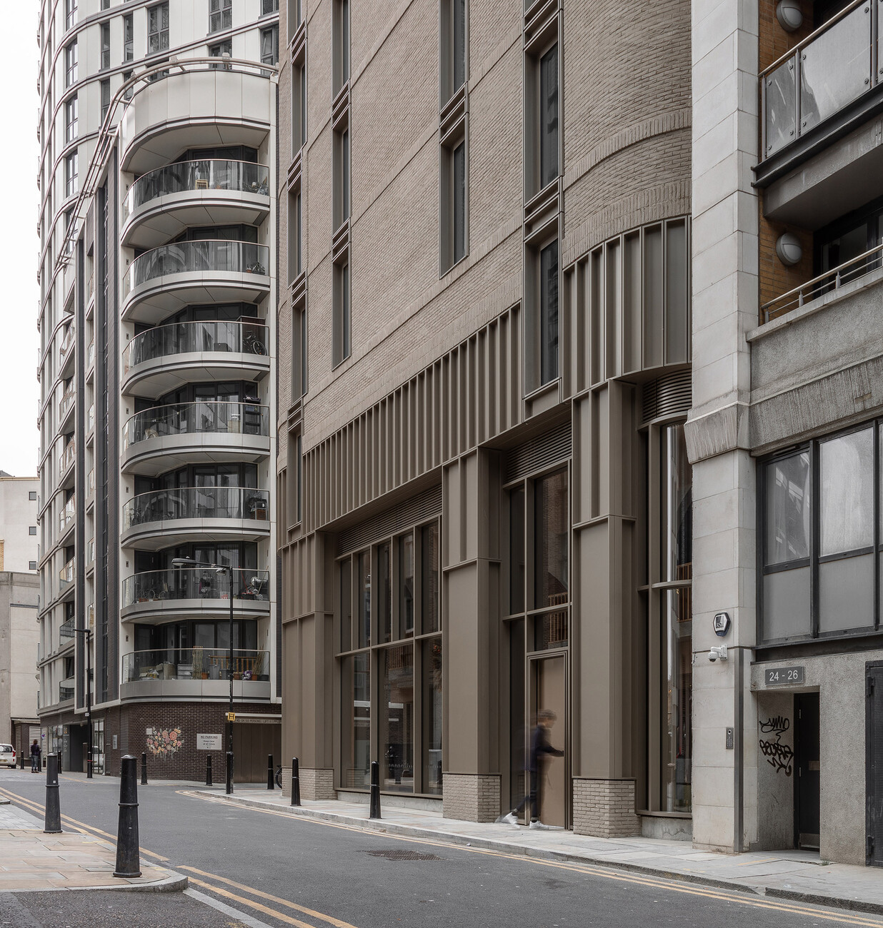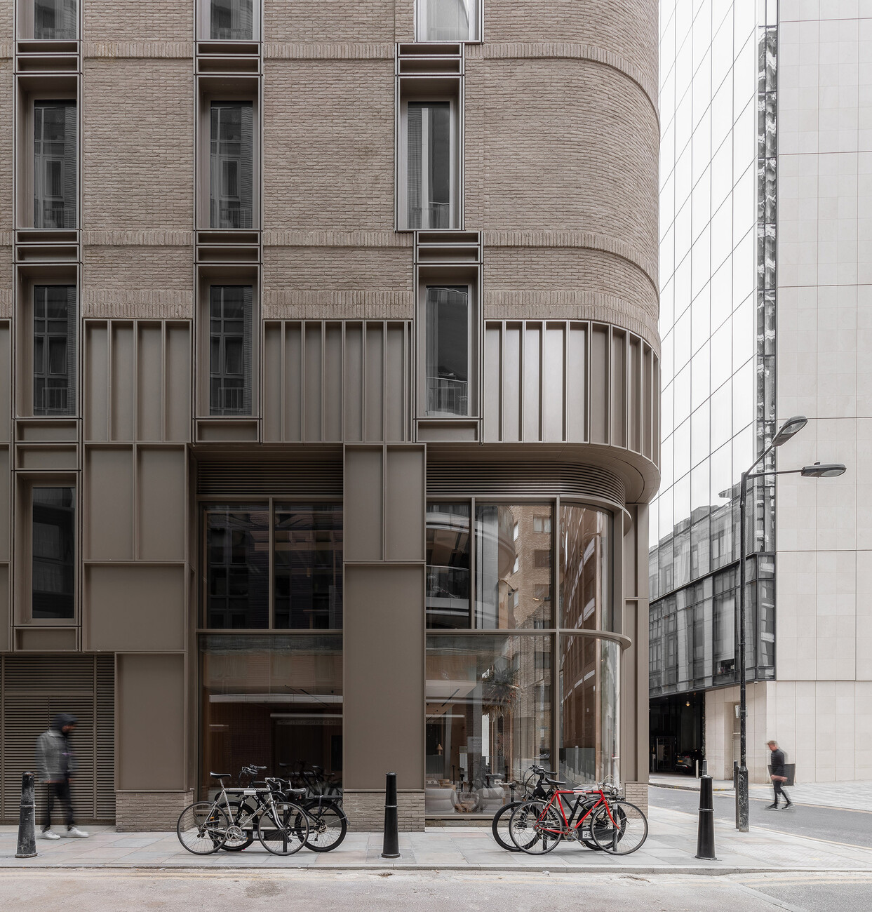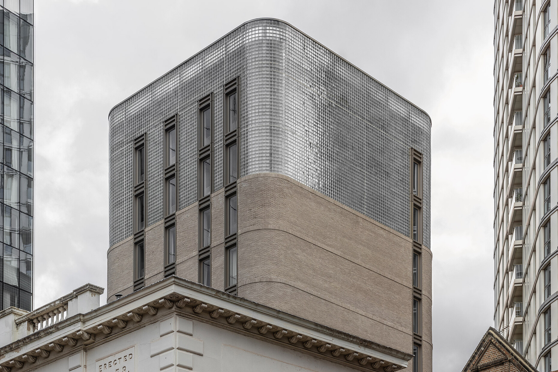 The district of Whitechapel is located east of the medieval city centre and north of the Thames in the so-called East End of London. Not only did Jack the Ripper once wreak havoc here, the working-class district is also a popular film location. Only a few years ago, the area was considered dangerous, but now it has developed into a hip, trendy district. In the course of this development, a wealth of architectural projects worth seeing have been created. The building of the Buckle Street Studios, with its striking round corners, fits seamlessly into the ranks of the new landmarks. Inspired by the round-arched windows, arched cornices and rounded bricks of the historic buildings on neighbouring streets, the architects transferred much of the structural loads to an expressionistically designed parabolic arch of double height. In order to make the building appear lighter and more transparent with increasing height, Grzywinski+Pons relied on a vertical, optical tripartition of the façade, which they achieved solely through the use of alternating materials. The plinth is clad with rustic, nickel-plated metal panels in cassette form, which function equally as parapet covers and artistic ventilation grilles. Above this, warm grey hand-made bricks with projecting pilaster strips were used. The final part of the building is the upper section, which has the same proportions as the plinth and is completely clad in glass blocks.