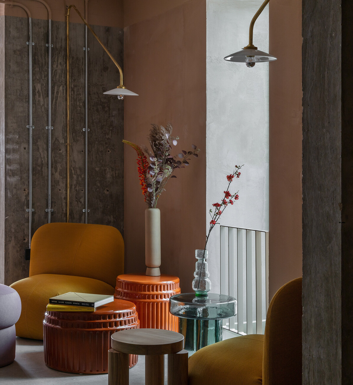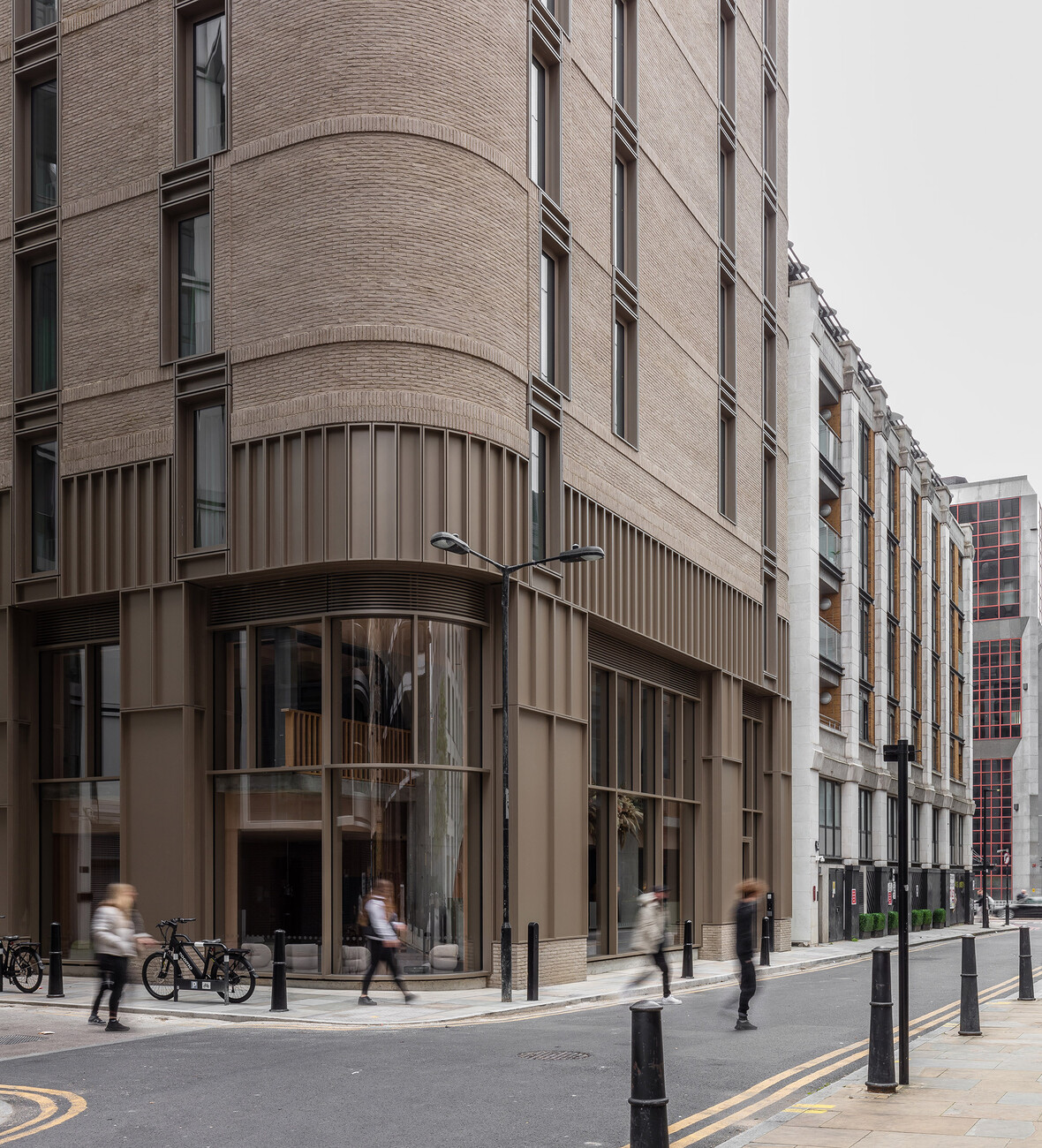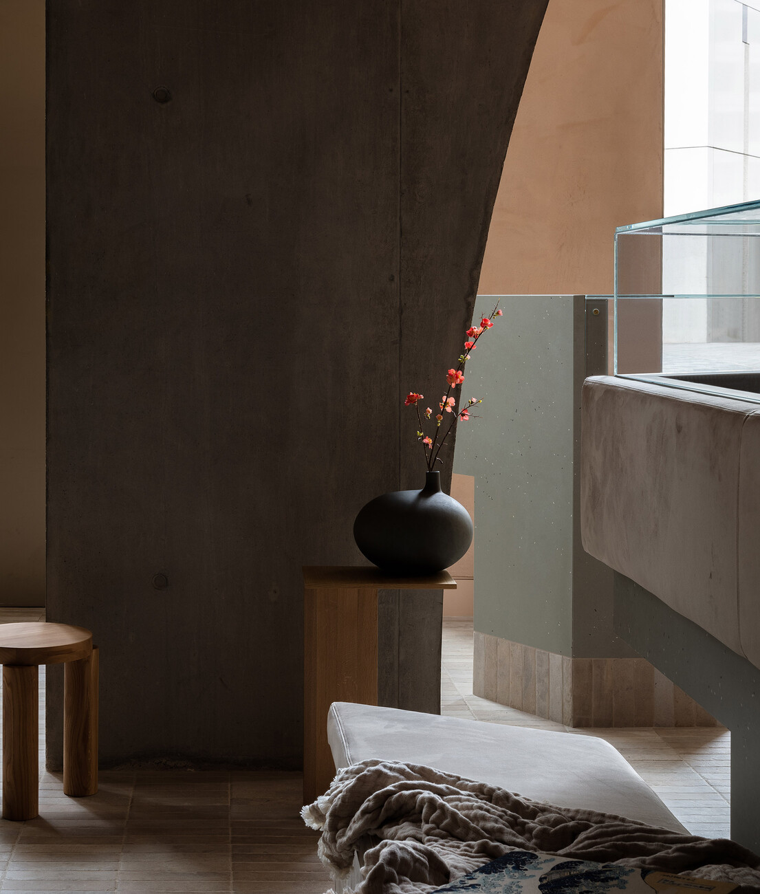 By activating and illuminating the interior, the hotel guests and visitors create a subtle, diffuse luminosity that makes the building's head seem to float lightly and fleetingly above the body of bricks, which is characterised by heaviness and permanence. A key element as a connecting unit between public and sheltered space is the parabolic structural arch, which is clearly perceptible from the street through the large-scale glazing. The impression of structural expressionism is softened by the use of an integrated wooden balustrade as well as fluted panelling, clay plaster, curtains and delicate furniture. The floors and skirting boards of the fixed joinery furniture were in turn clad in rough brick, in keeping with the façade.
