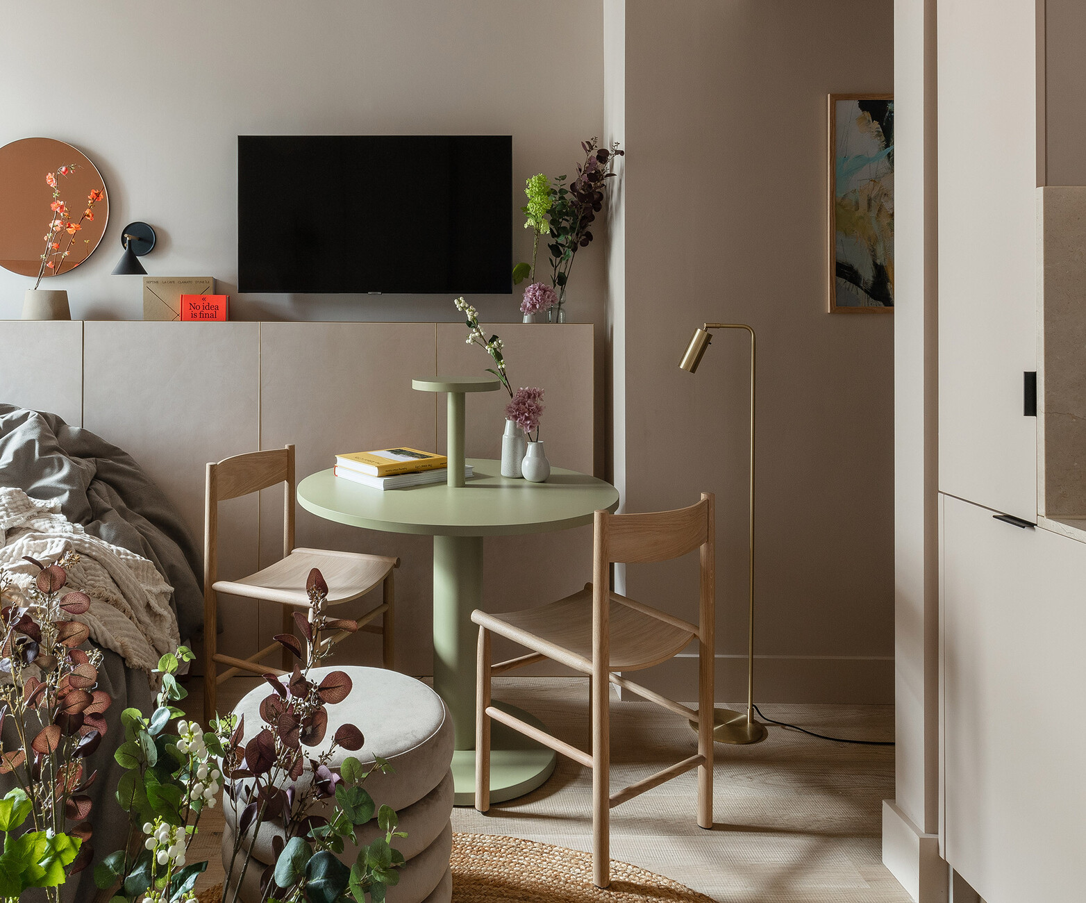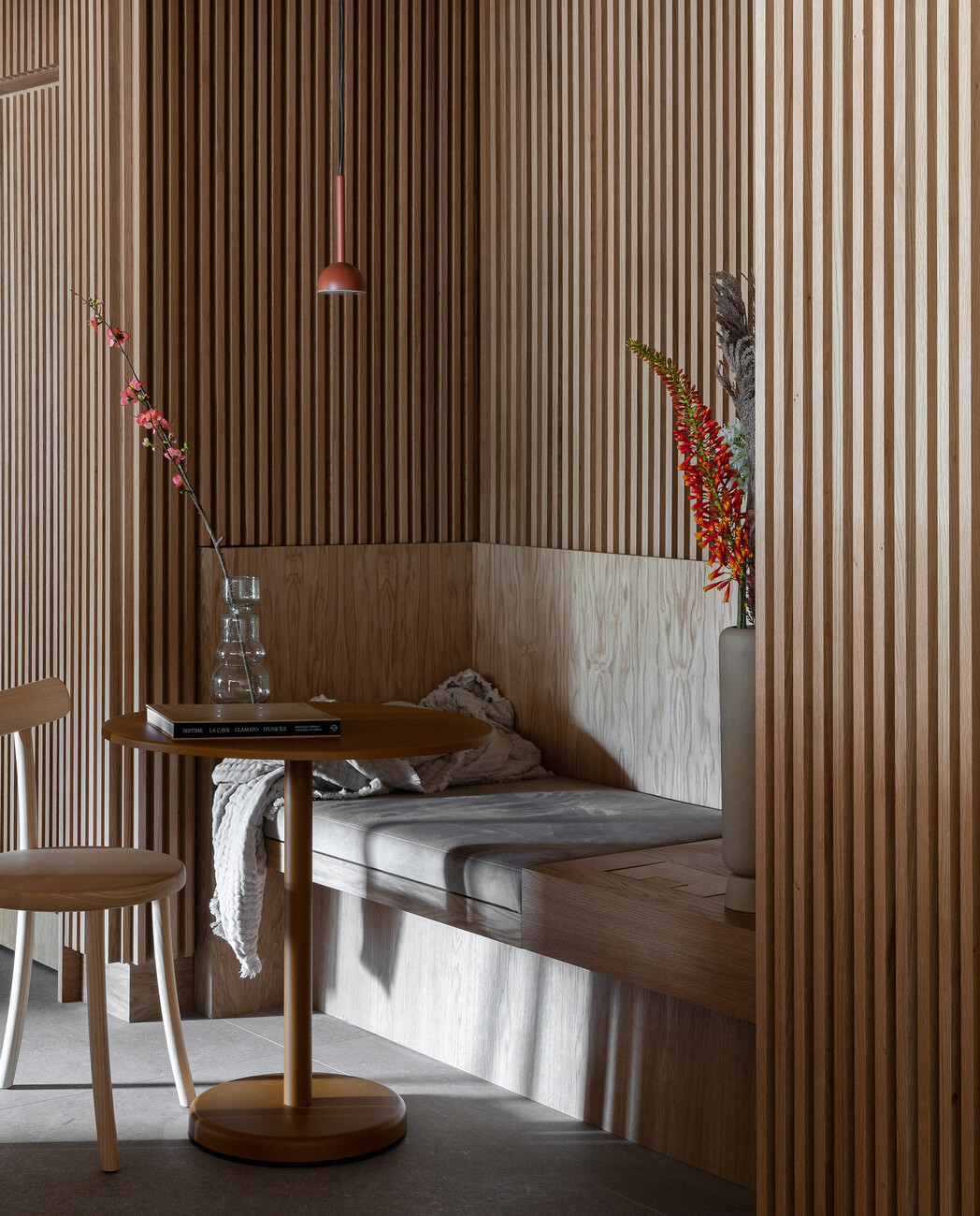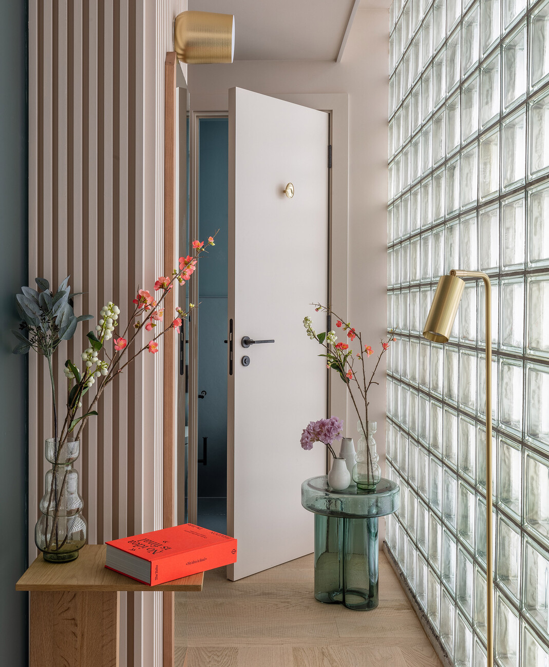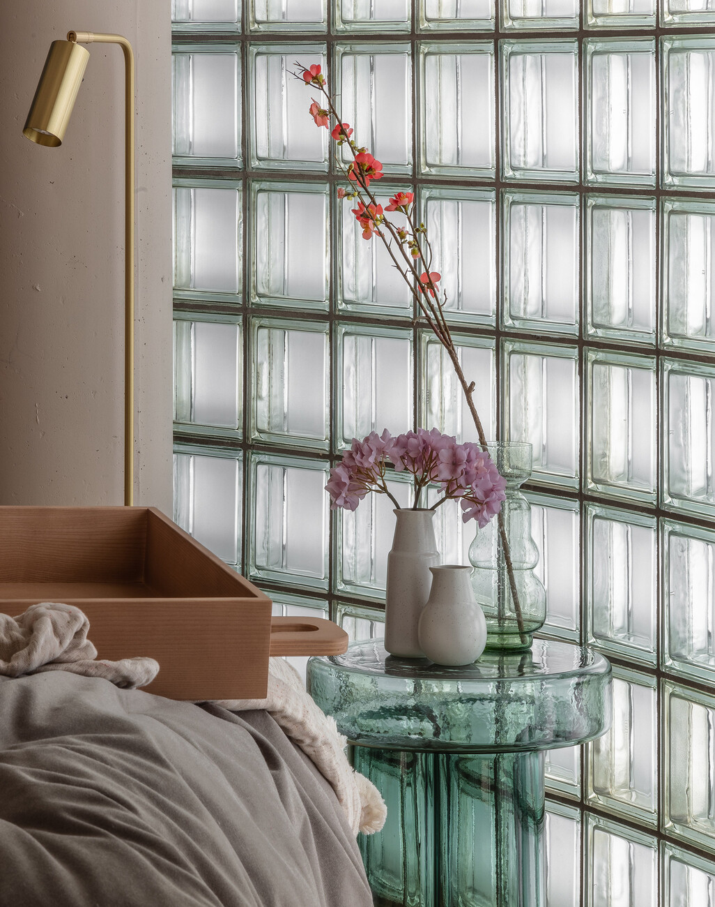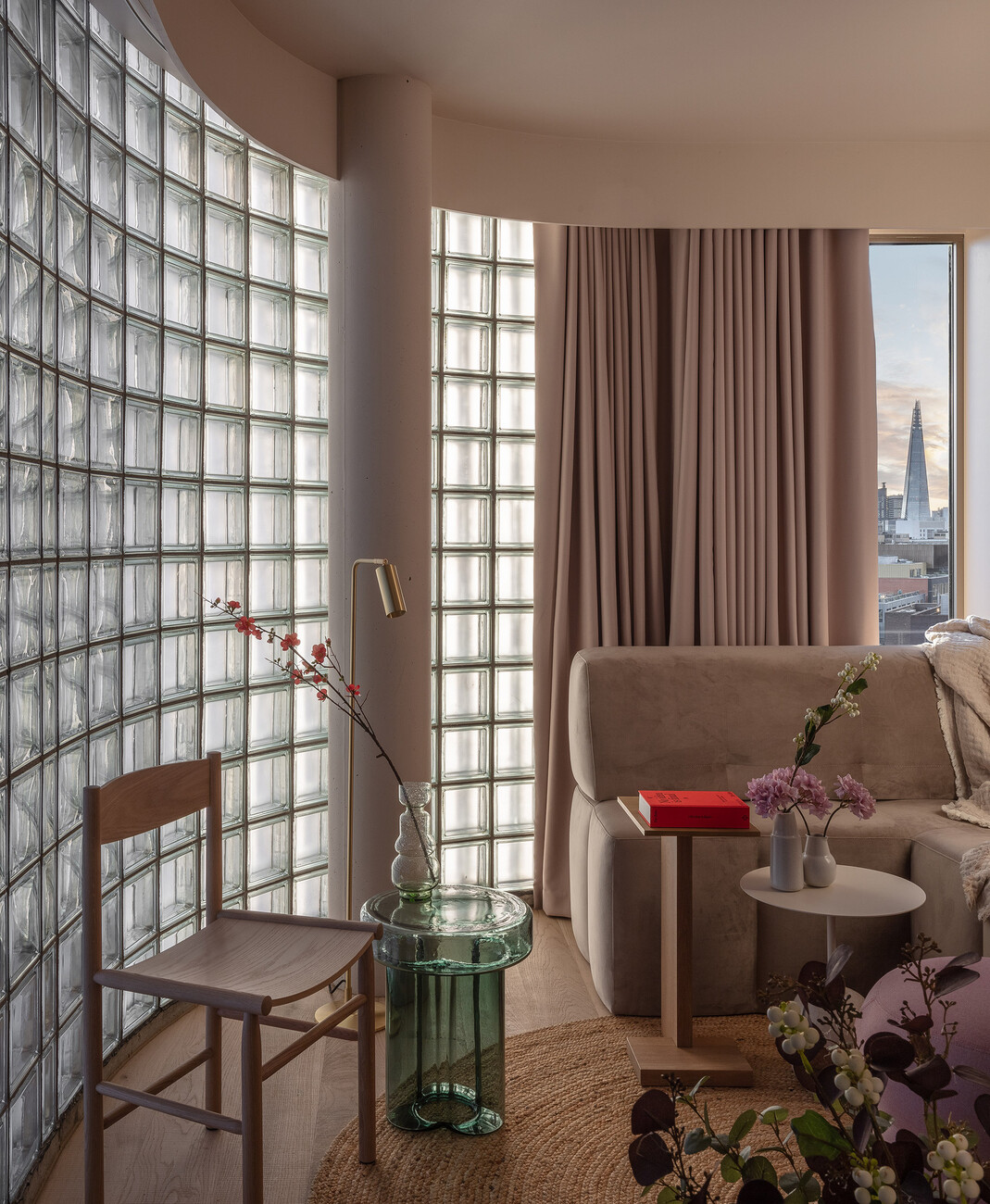 The upper floors, wrapped in shimmering glass blocks, are used for living and are characterised by their impression of light and warmth. Generous, flowing curtains and light wooden floors further emphasise the comfortable ambience, whose overall colour and material palette is characterised by earth-coloured clay plaster, sage and wood over jute, cream-coloured stone and velvety nude tones. Lush sofa beds, compact little tables, linear shelves and hanging wooden trays are just some of the functional measures taken to make the most efficient use of the limited space. Ship cabins served as inspiration, which score with quality and comfort despite their compact area.