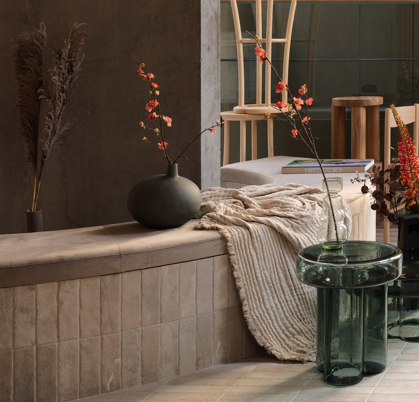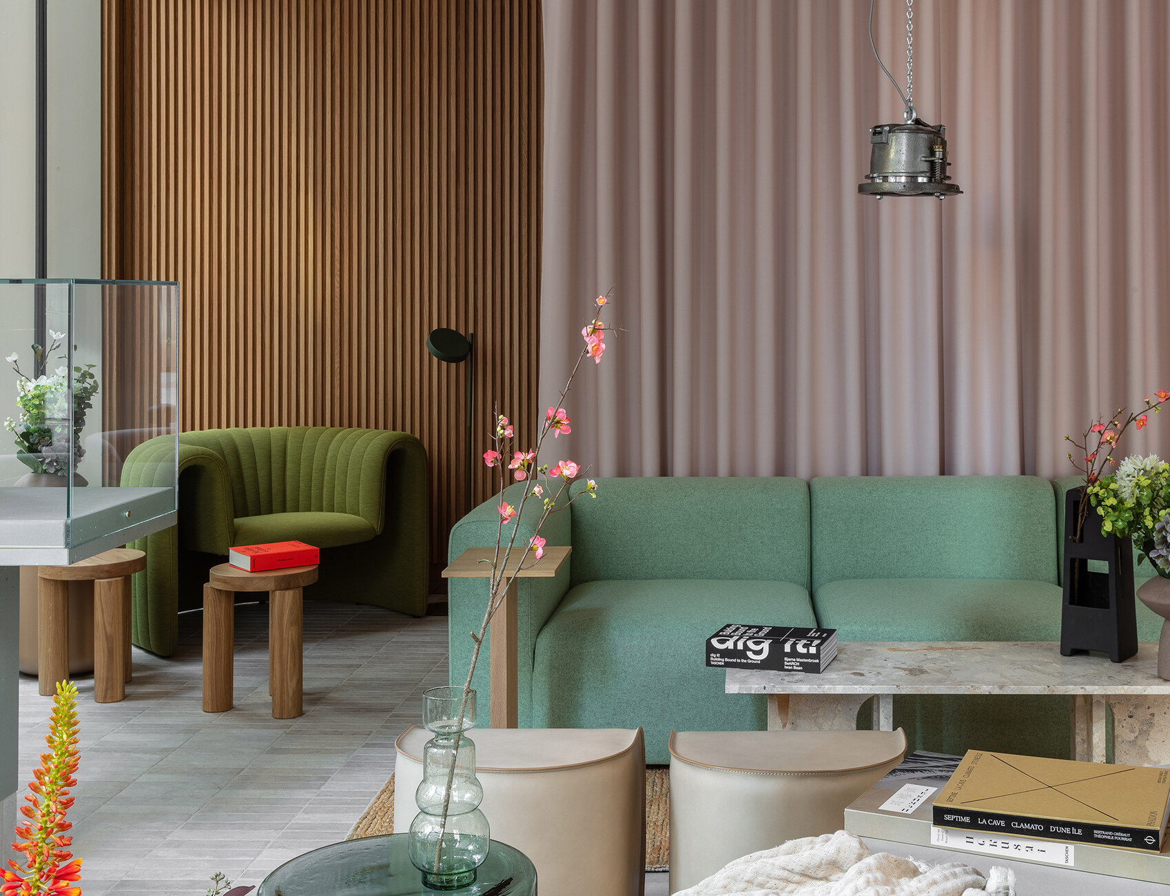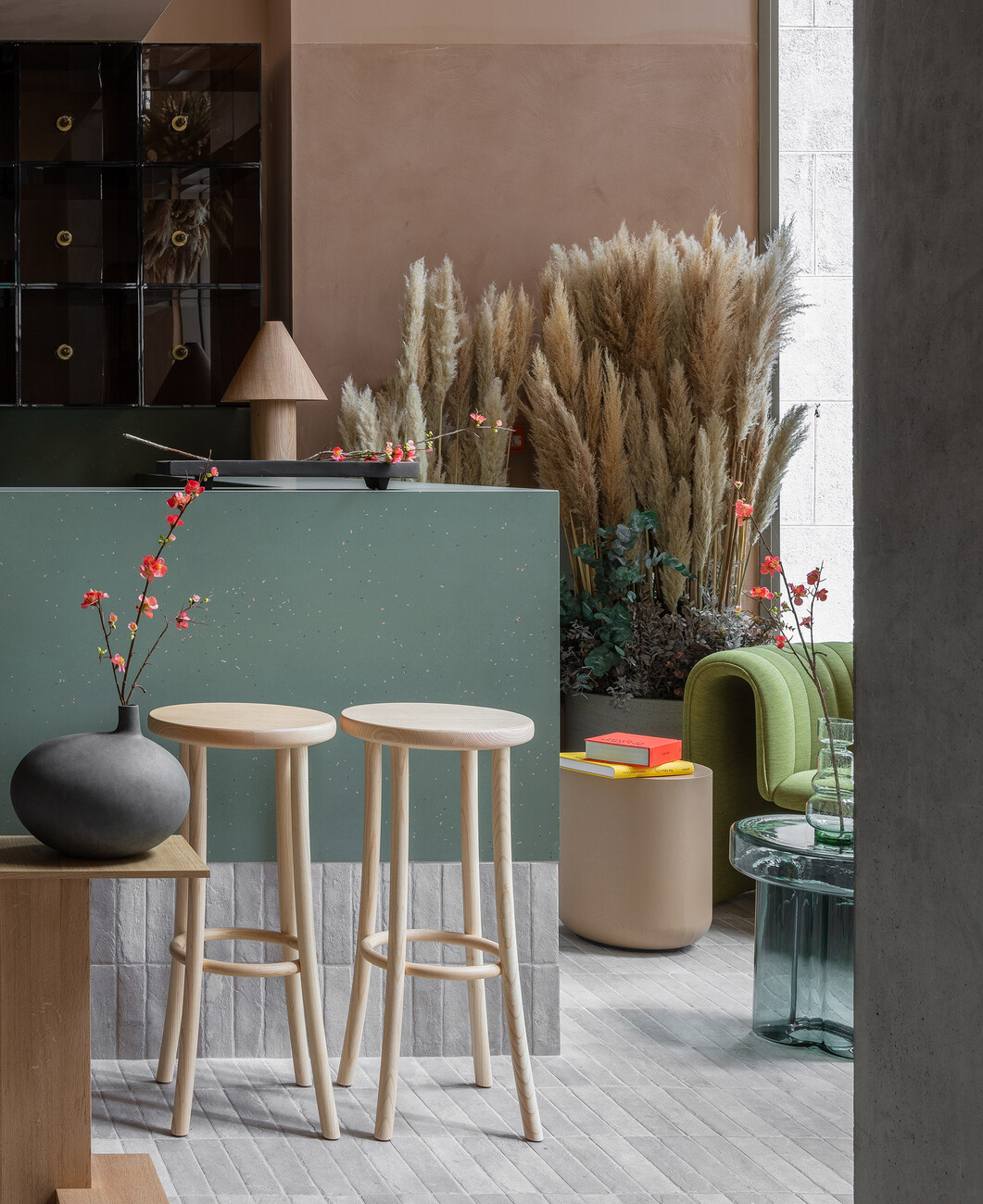 For the concept store on the ground floor, the architects opted for showcases made of diamond-shaped volumes clad in porcelain and glass to present the selected products in the right light. These are in turn surrounded by curved and upholstered benches, sofas and stools. Gallery, lounge, café, shop and living room at the same time, the space deliberately moves at the interface between art and commerce. Curiosity and the spirit of discovery are intended to invite passers-by to enter the space, to experience it with all their senses and to linger.