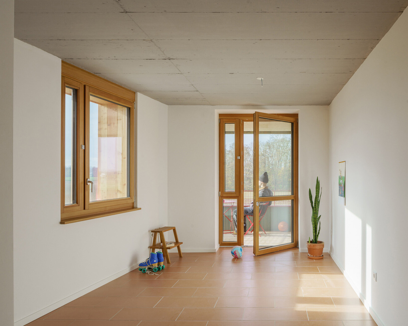 The outcome is a residential building that is actually quite conventionally constructed, stone upon stone with monolithic masonry, clad on the outside with green-glazed boards. Office 2226 from Vorarlberg, a spin-off from BE, which in turn emerged from the Baumschlager Eberle office, ran simulations for months, harmonized a 3D model of the building on the computer with the weather in Ingolstadt, and presented in a comprehensive calculation that the building would be warm enough through use alone and even without heating, as the normal amount of household appliances and the residents themselves generate sufficient heat. “The residents warm up the architecture, which is a beautiful, poetic image,” says Chris Neuburger. As the name of the building suggests, there is an emergency heating system: a thin “heating paper” is embedded in the floors. “Simply to bring the rooms up to operating temperature,” as Neuburger explains. “The residents moved in on a freezing cold November day. So it was important to be able to heat the building up. Some people may want the bathroom to be warmer than others in winter, and we can now achieve that freedom.” Paradoxically, the building had to be exempted from the Building Energy Act, and an energy consultant had to issue the relevant certificates. All this questioning creates additional work, Neuburger admits, but he also says with a laugh: “But it opens other doors for the planners. And when you walk through that door, you suddenly find yourself a little bit in the Shire and not so much in Mordor.” The rooms in the apartments are remarkably large, and the planners did not have to “worry about all the technology,” as Chris Neuburger notes: “For us, the ‘e’ stands for emancipated.” And so he concludes: “The ‘building type e’ gives builders breathing space and planners room for maneuver.” A promising constellation, he believes.