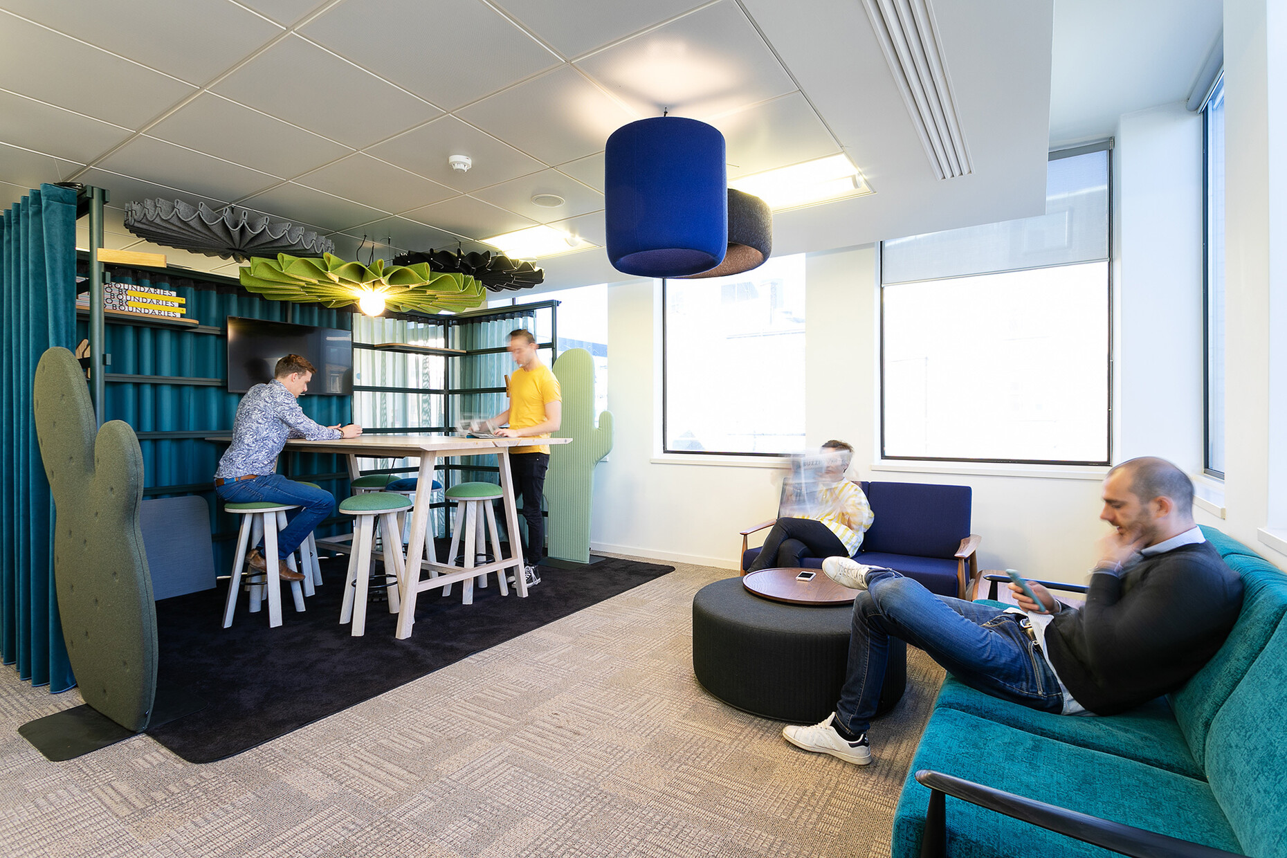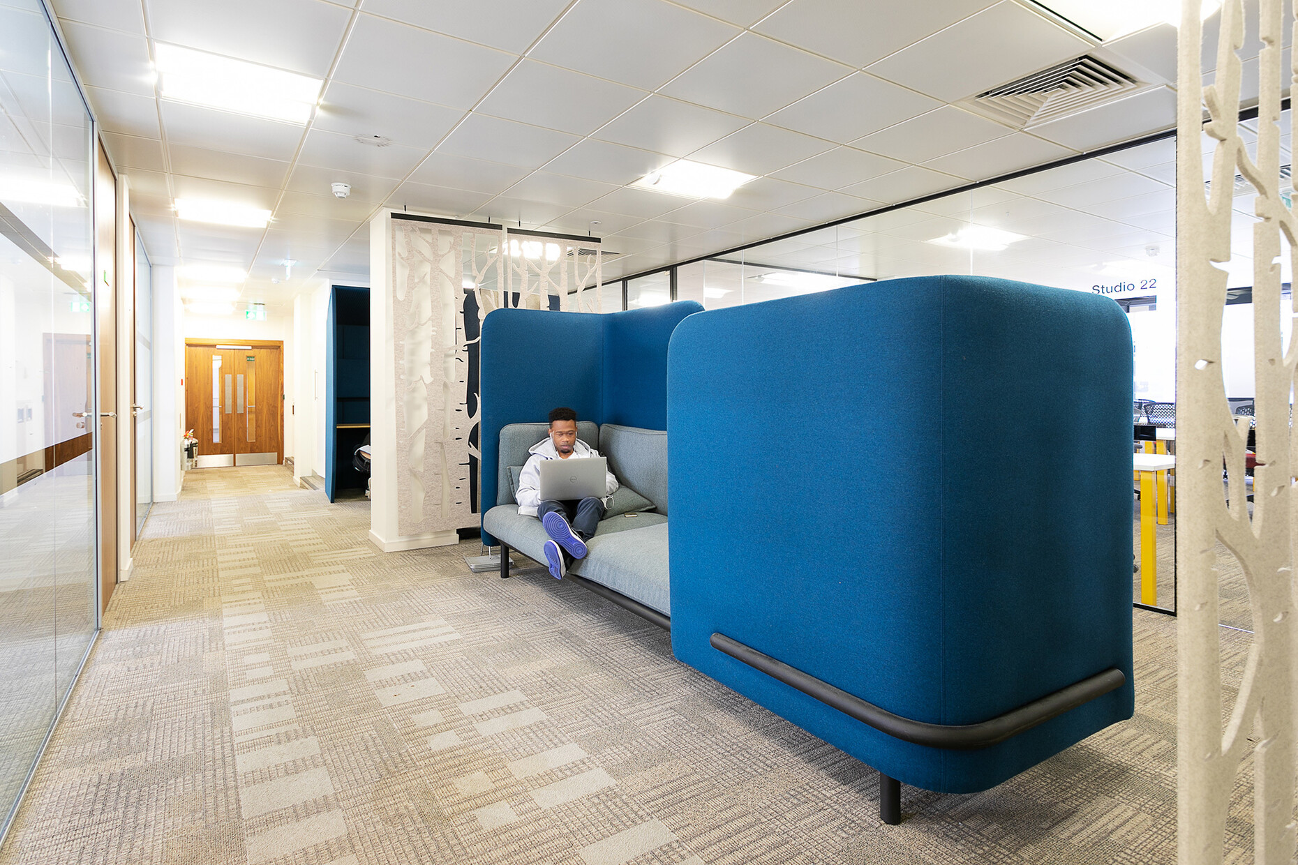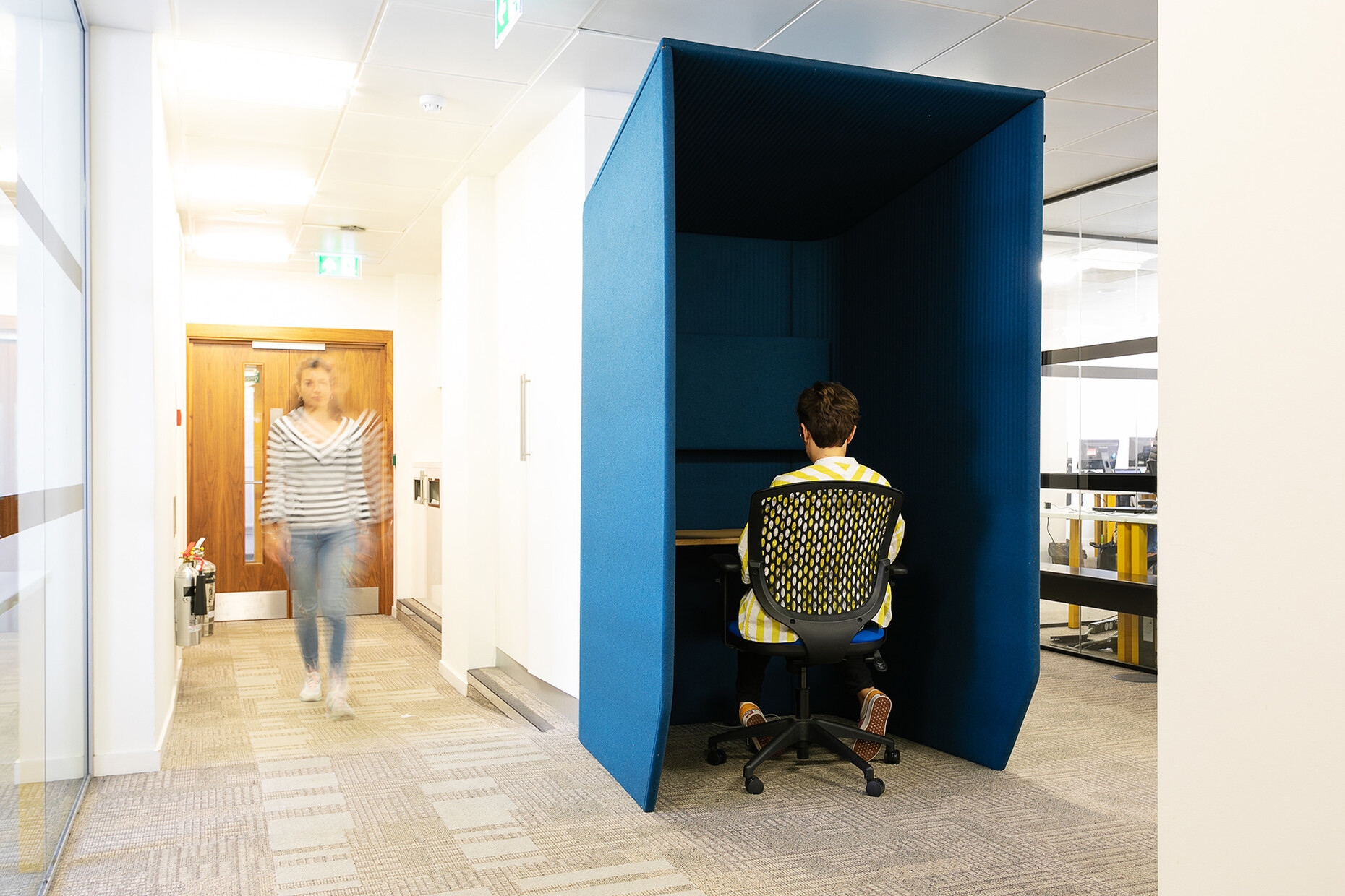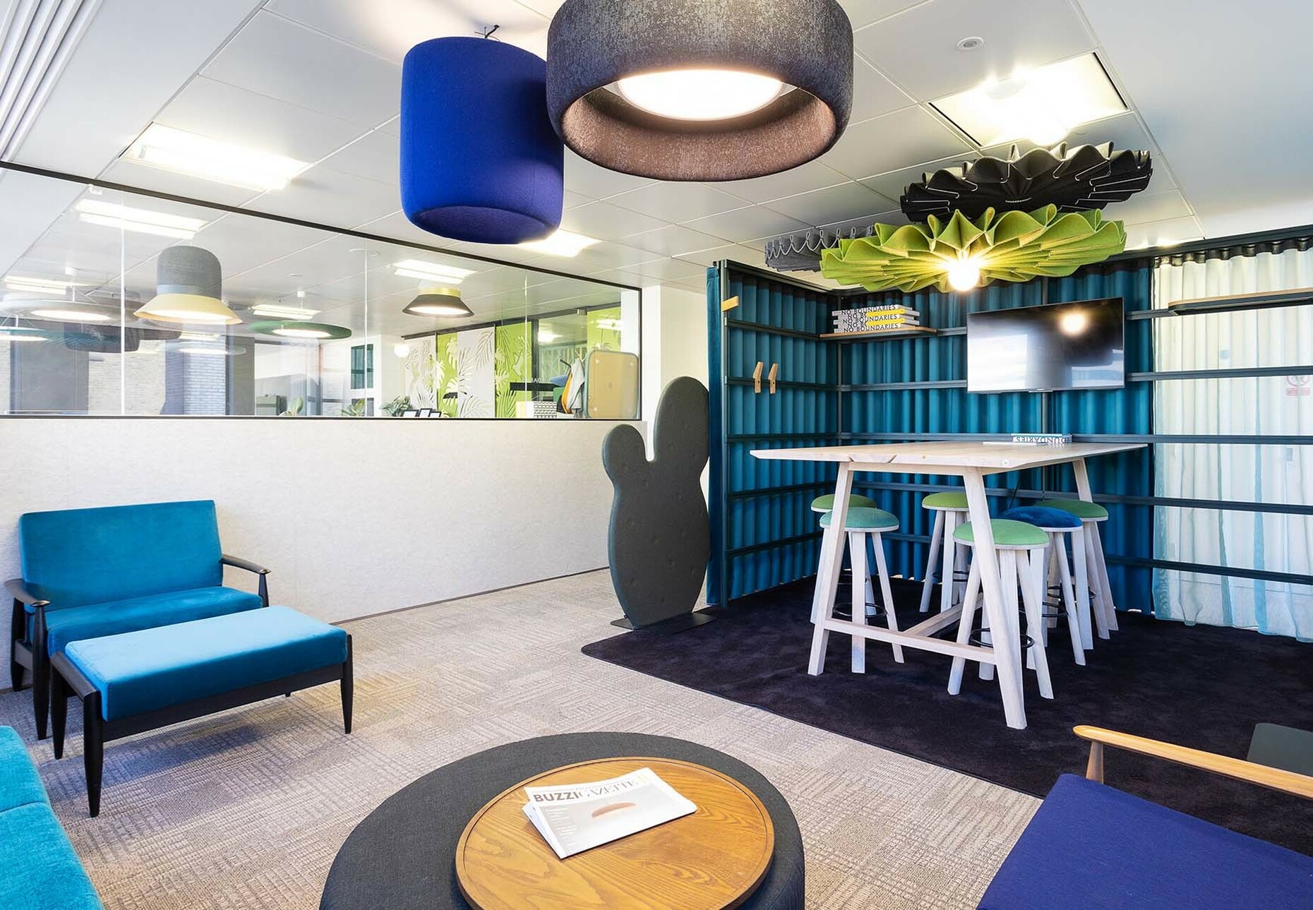 The acoustic solutions in the offices of Buzzispace UK don’t end at the workstations: The lampshades too consist of sound-absorbing, ecological felt that offers plenty of options for room design with their different colors and forms. This is the case with the round “BuzziMoon”, the funnel-like “BuzziShade” or the cylindrical “BuzziProp LED”. The slender, artfully ruffled lampshades of “BuzziPleat” also make good wall decorations, and can be both decorative and functional when combined with the “BuzziMood” acoustic panel, which uses the sound-absorbing properties of preserved reindeer moss and combines this with fabrics and geometric forms.