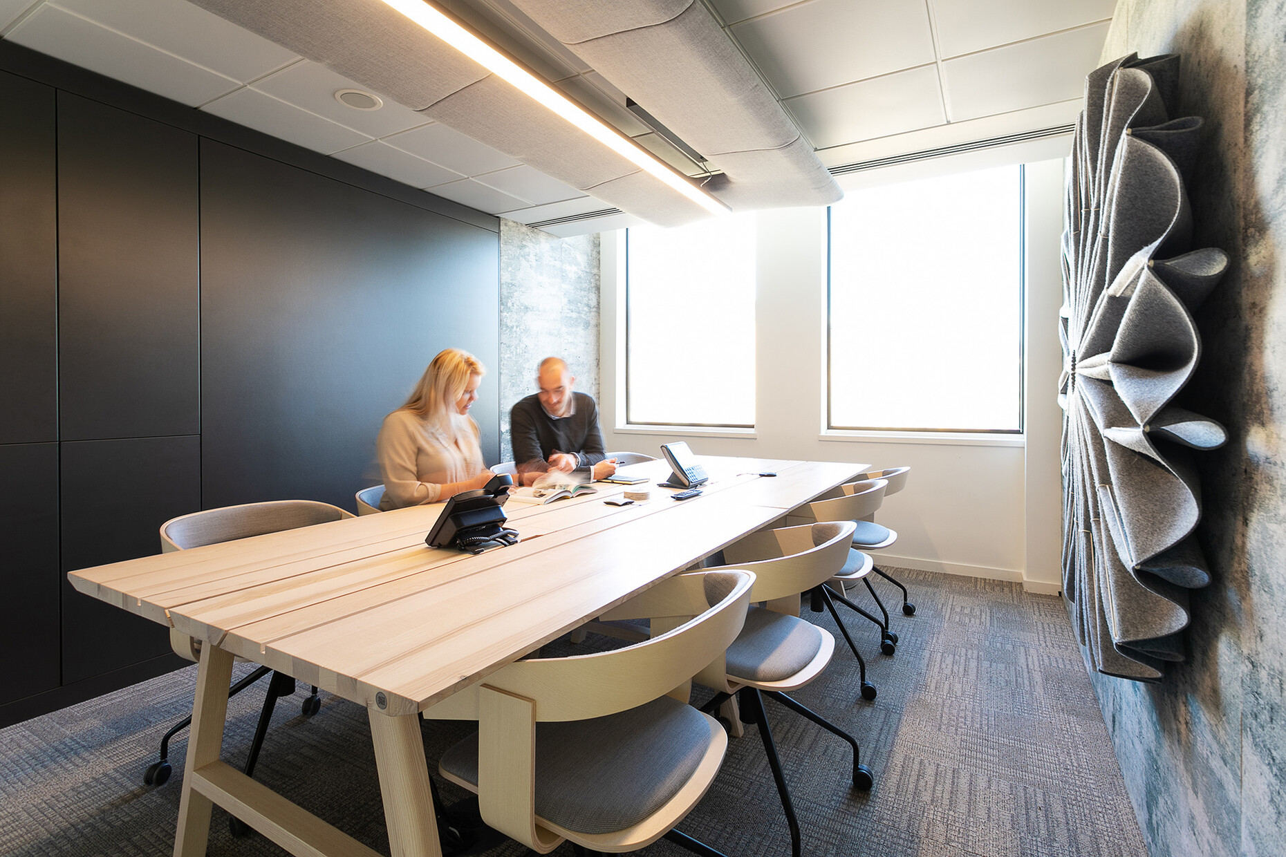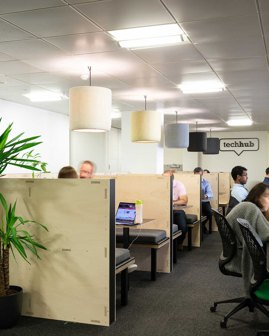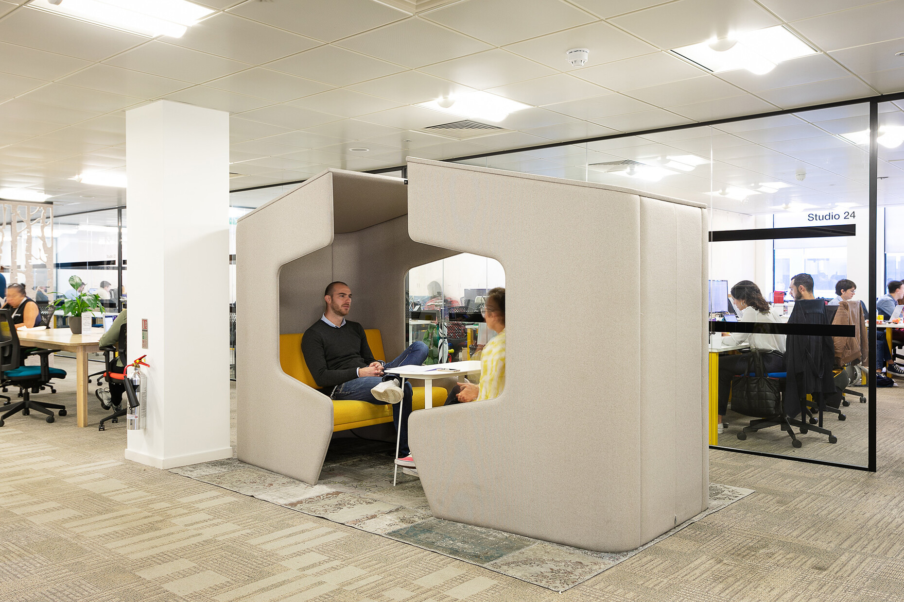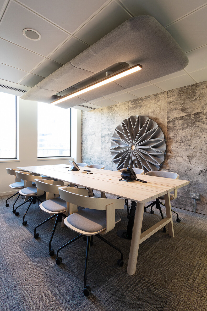 The acoustic solutions in the offices of Buzzispace UK don’t end at the workstations: The lampshades too consist of sound-absorbing, ecological felt that offers plenty of options for room design with their different colors and forms. This is the case with the round “BuzziMoon”, the funnel-like “BuzziShade” or the cylindrical “BuzziProp LED”. The slender, artfully ruffled lampshades of “BuzziPleat” also make good wall decorations, and can be both decorative and functional when combined with the “BuzziMood” acoustic panel, which uses the sound-absorbing properties of preserved reindeer moss and combines this with fabrics and geometric forms.