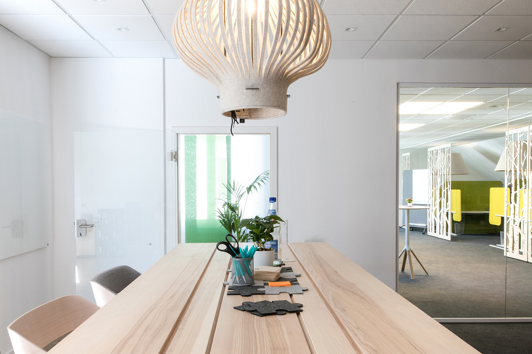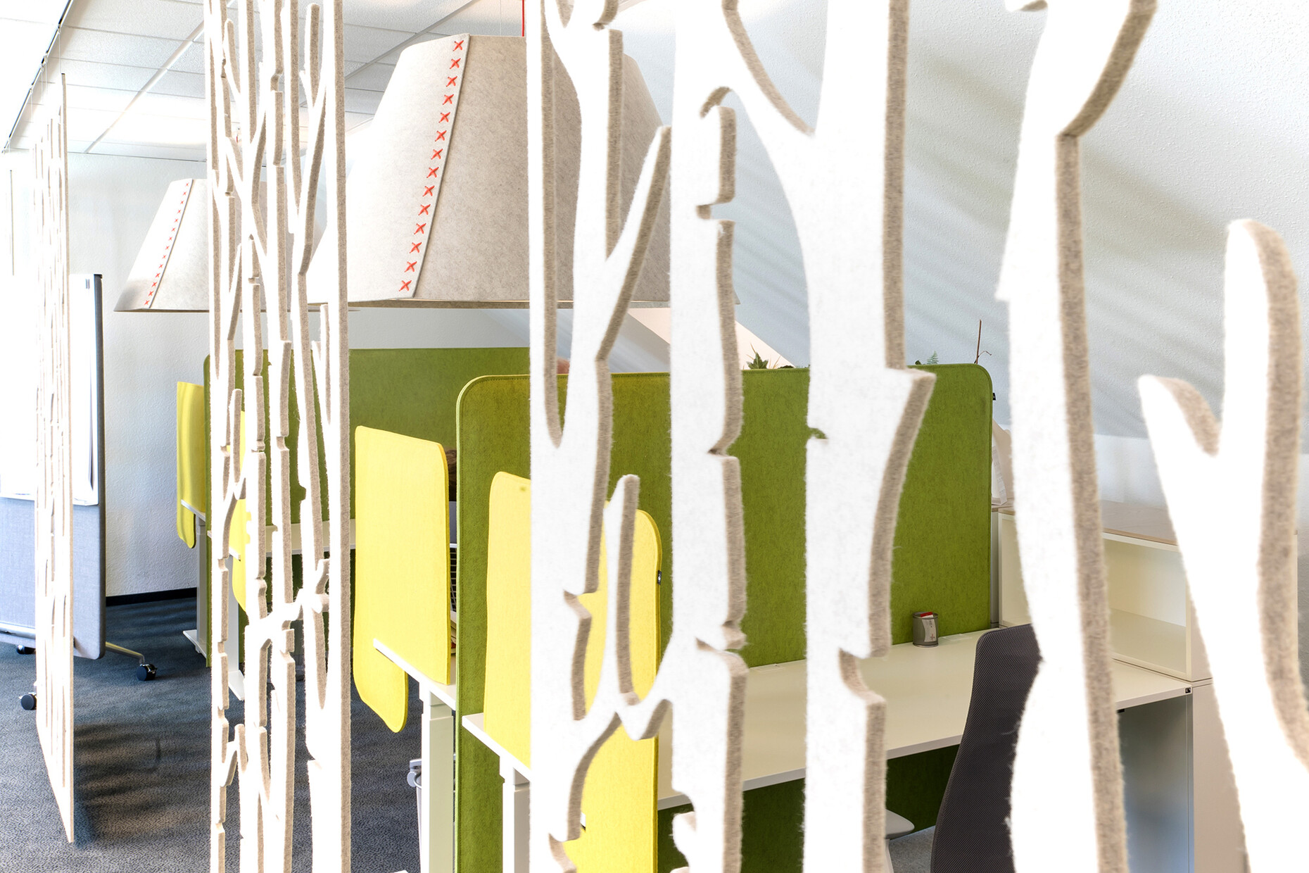 As an open space, the room next to it provides several staff members with an area for focused and quiet work. Therefore, levels of background noise level had to be taken into consideration all the more here. To this end, textile desk partitions from the “BuzziSplit” range were utilized, while “BuzziFalls” dividers that imitate a birch forest also provide added privacy.