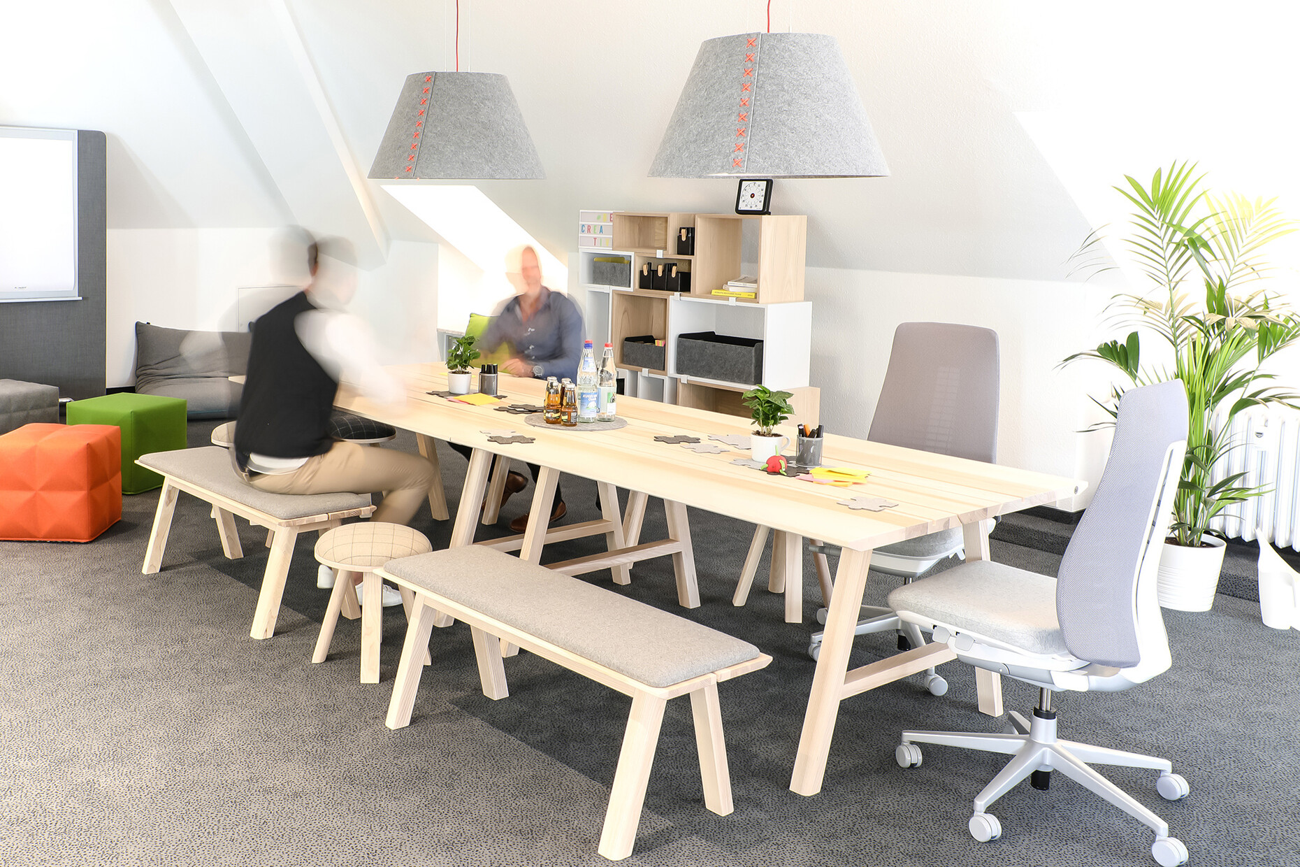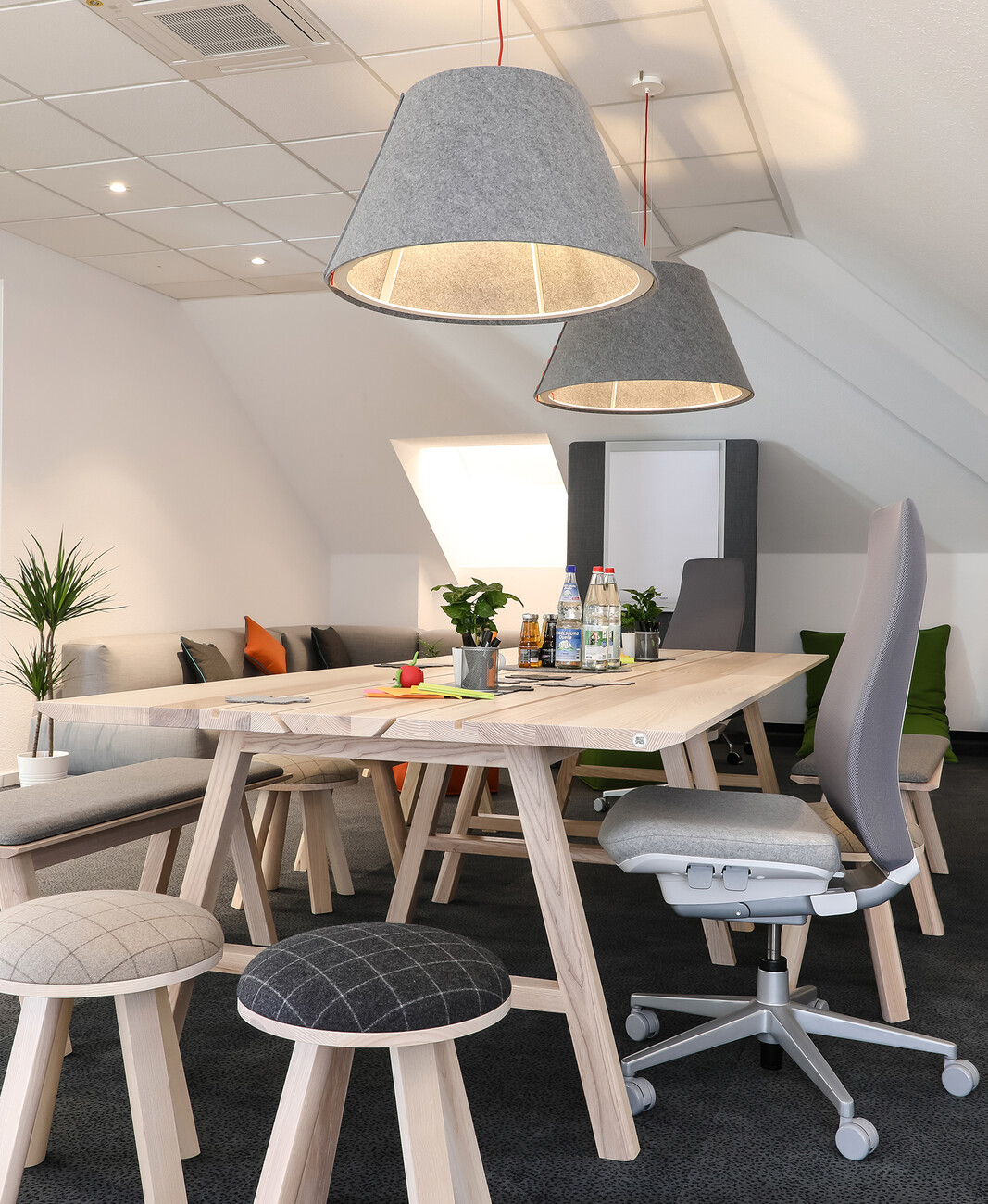 In order to create the right environment for each and every requirement in the development process and in consultation with the clients, three functional zones were set up: one for concentrated work, a space for interactive presentations, and an area for creative work. Here, choices were helped by the office furniture expert BuzziSpace, which for collaborative work processes recommended for example, alongside lounge-type upholstered furniture, large desks and benches from its “BuzziPicNic” range. Colorful stools from the “BuzziMilk” and “BuzziCube” ranges, as well as “BuzziBag XL” beanbags provide relaxed seating. There is an informal living room character, not just thanks to the large sofa. The suspended luminaires “BuzziShade” and “BuzziLight Mono” are a source of pleasant ambient lighting and also enhance the acoustics.