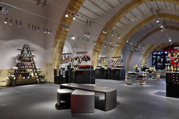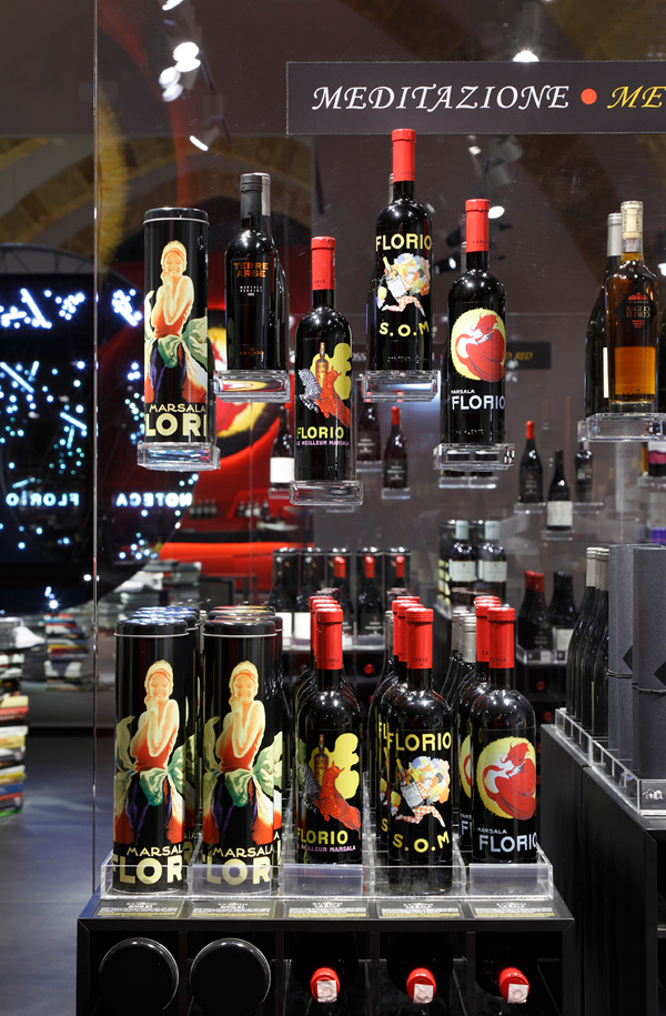 It was in 1833 that the Florio clan, a prosperous Sicilian family, established the “Donna Franca Florio” winery, and it has remained on the outskirts of Marsala ever since. The town is famed for its rich dessert wines, which at first were mainly exported to England. In line with the buildings on the neighboring and rivaling estates, which were in English hands, Donna Franca Florio winery was built in a style that most Italians consider to be Anglo-Saxon. As such, more than 100 pointed arches were lined up to form the huge vaults of the winery. An architect, a scenographer and a light designer have now created the “Enoteca” in a side aisle of the wine cellar, which is illuminated with a range of different luminaires by Reggiani. Architect Franco Marabelli engineered the interplay between the various design elements with perfect precision: “For the Enoteca I let myself be inspired by the colors and traditions of Sicily: a red background with protruding elements that is enriched with a mosaic that references one of the historical Florio advertising posters and holds a great presence over the entire space; the black floor is like the lava of the volcano … I have arranged the bottles such that they seem to float in a vacuum thanks to the use of transparent frames, thus I was able to open up the room and make it spacious and airy.” The luminaires could not be installed on the historical walls directly, which is why lighting designer Lorenzo Bruscaglioni from studio Luminae opted for conductor rails of four or five meters in height; the shorter ones extend along the entire length of the room. These were fitted with Sunluce LED lights and ZeroZeroUno metal halide lights by Reggiani, and furnished with additional dimmers. The scenographer used them to spotlight the exhibition zones and accentuate particular details in the architecture. The result is a “magical and captivating place” for the Florio Concept winery, which infuses the historical building “with new energy”.