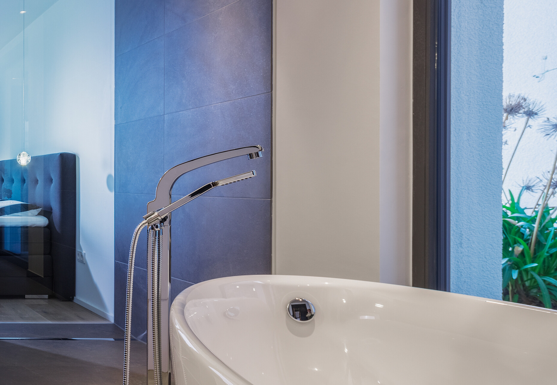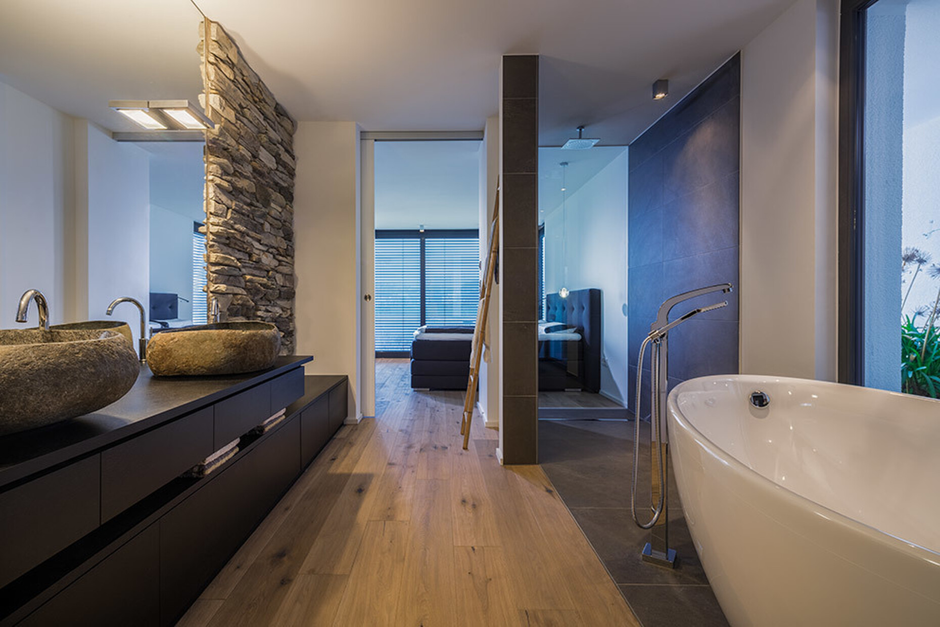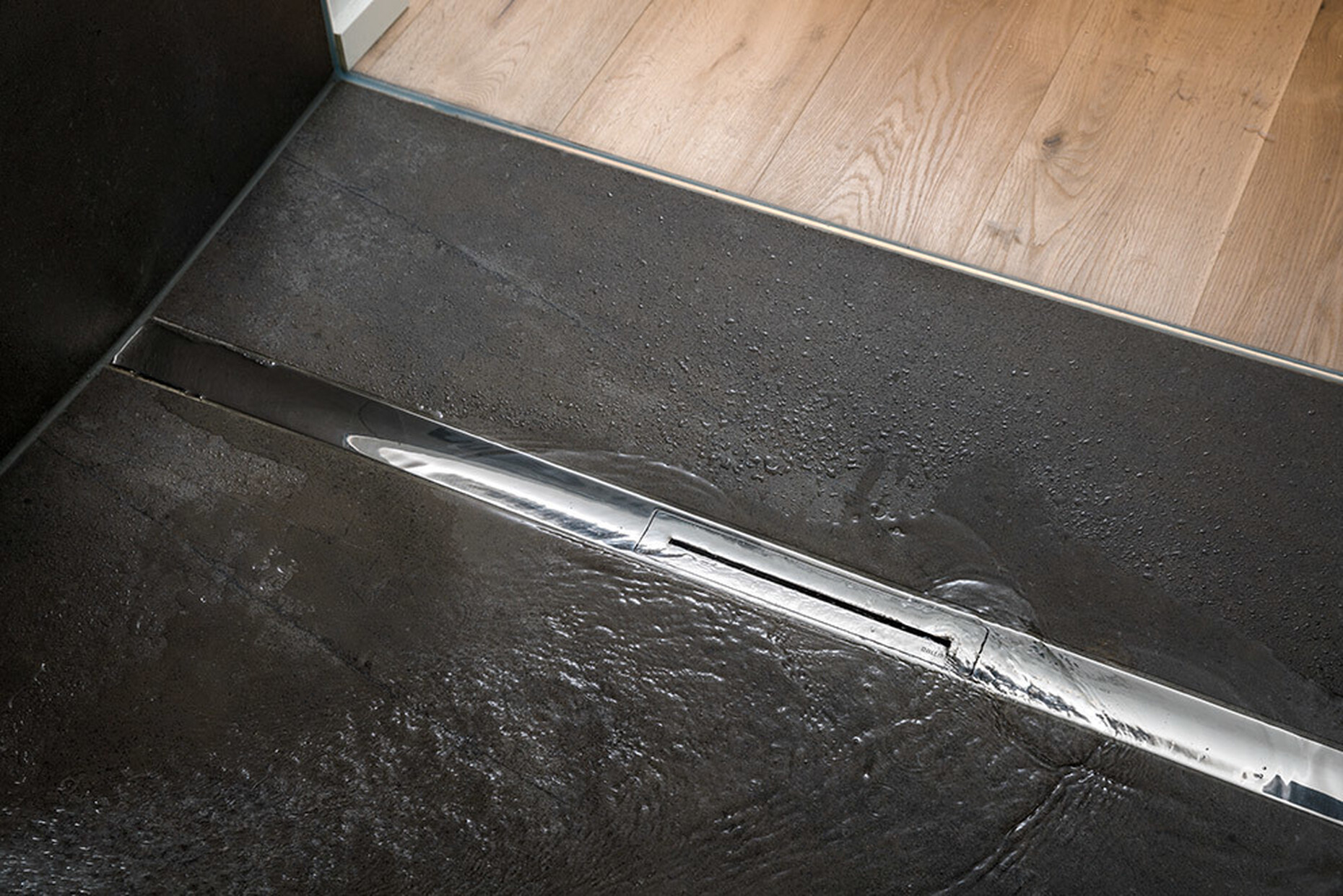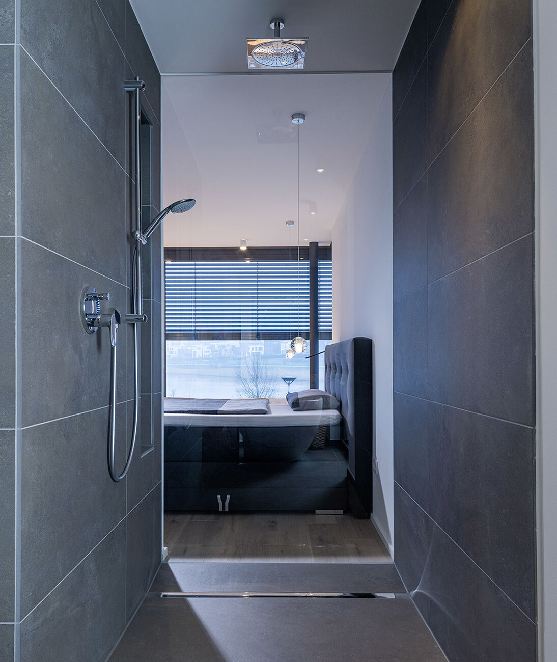 The concept on the garden level of the building is particularly special. With its view of Lake Phoenix, this level has become a residential space in which sleeping and wellness zones meld. The decision to do without classic room layouts and dividing walls and to install floor-to-ceiling windows that open up wide means that the sleeping area and the floor-level shower area appear to be one unit. The open location in the space demands a shower solution that is as visually appealing as it is practical. The architects therefore opted for the “CeraFloor” shower drainage strip from Dallmer. The solid drainage channel milled from 8-mm stainless steel stretches from wall to wall with millimeter precision and looks like a high-quality design element in combination with the tiles. Thanks to the new “DallFlex” drain, it can take up to 0.8 liters of water a second with a construction height of just 90 mm. The stainless steel rail is unbendable, solid and extremely resilient and durable.