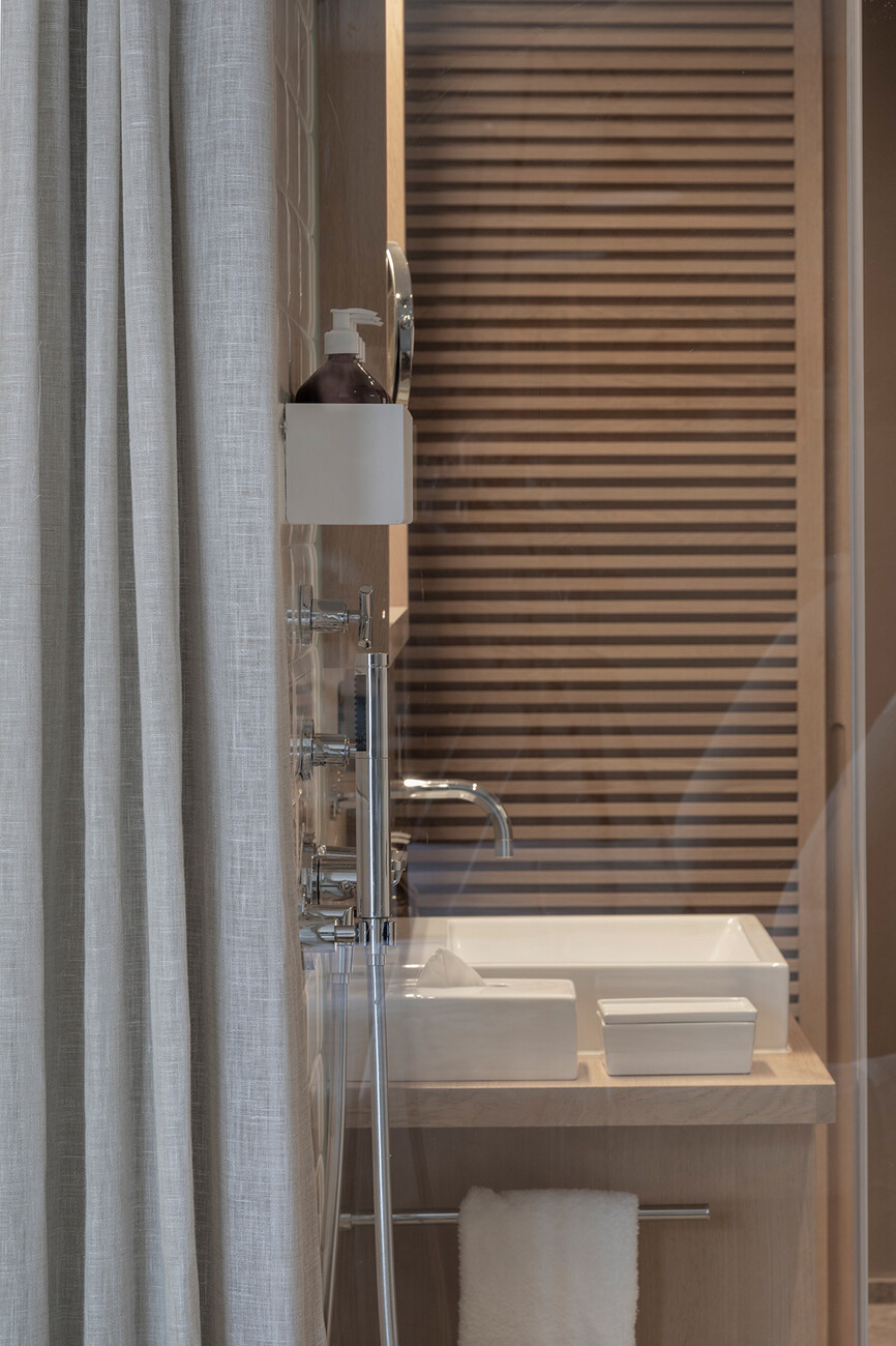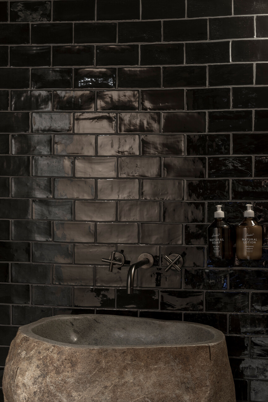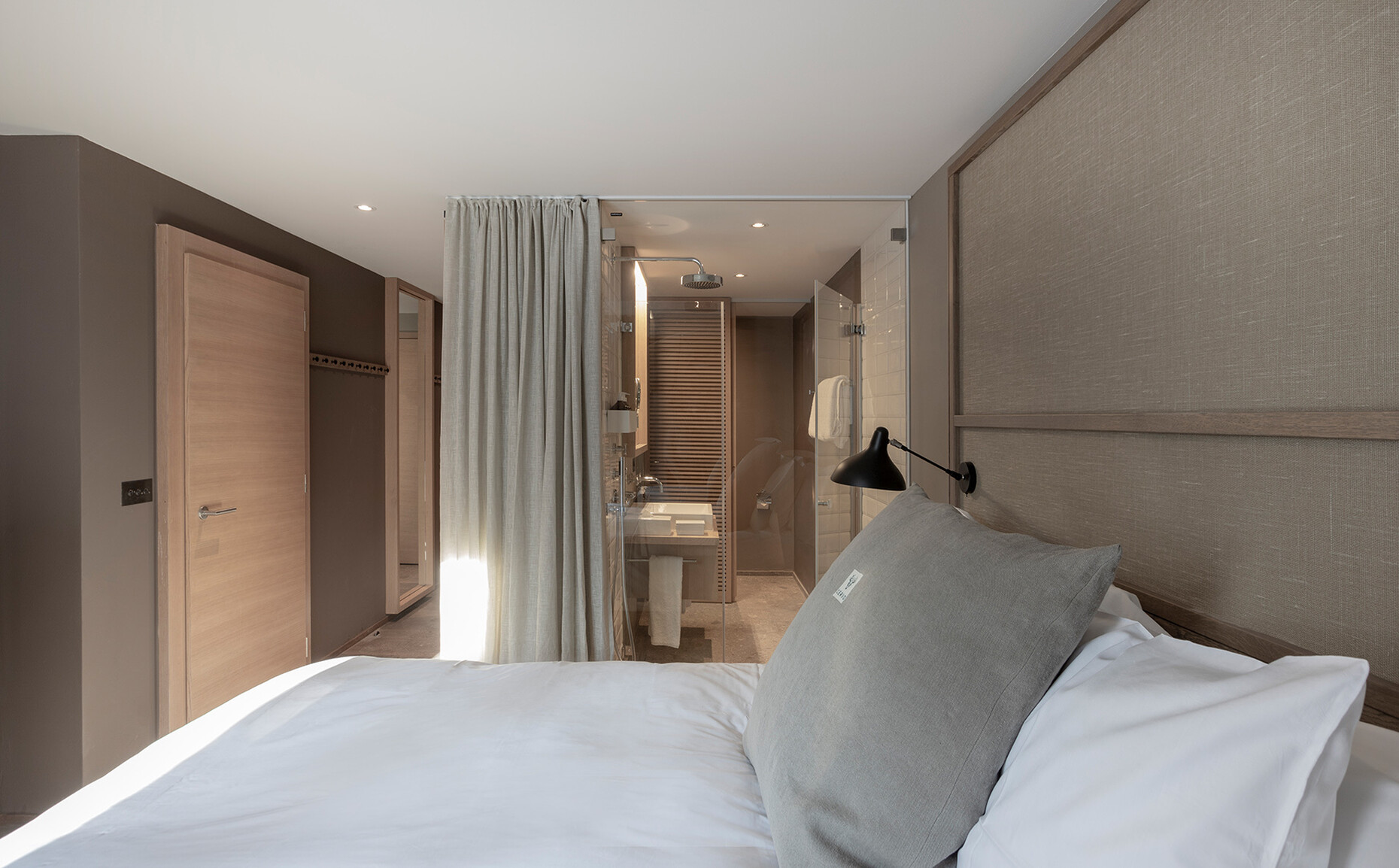 Dreimeter met the challenge of creating a holistic image which involved adapting the existing building and fitting out new ones. “Regardless of their classification we see the rooms as places of retreat, as safe havens. Which is why their design is calm and pared back. The focus is on warm, earthy colors, wooden surfaces and natural materials. Bedspreads and curtains are made of linen and in most rooms the walls have a cladding of braided linen,” says Andrea Kraft-Hammerschall from Dreimeta. Be it timber from the region or the granite flooring from the Alps, the high-quality materials are thoughtfully deployed and convincing but without seeking to impress. Processed using craft skills from around the world such as the charred wood in the spa-, yoga- and meditation area that is treated using the Japanese shou sugi ban technique which underscores the mystic character of the rooms and also makes the timber fireproof. “The new concept is aimed at people who act and travel consciously. A central principle in Cervo is ecological responsibility and a strong environmental awareness,” explains Kraft-Hammerschall.