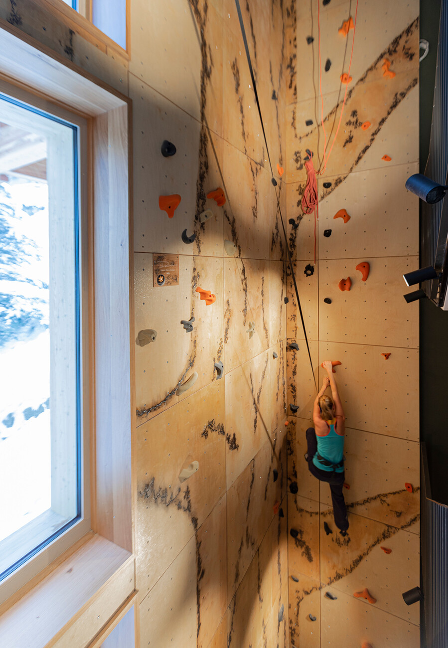 Sustainability is all well and good but there are also practical aspects to consider: “Especially in the 'Nomad' category rooms we have provided plenty of storage space and shelves,” the interior designer reports. Perfectly tailored to backpackers’ fittings include long hook rails while the rooms themselves have a spacious feel to them thanks to the combination of double and bunk beds. In the self-same building guests can test their mountaineering skills on the climbing wall extending over four storeys in the staircase of Lodge VI.