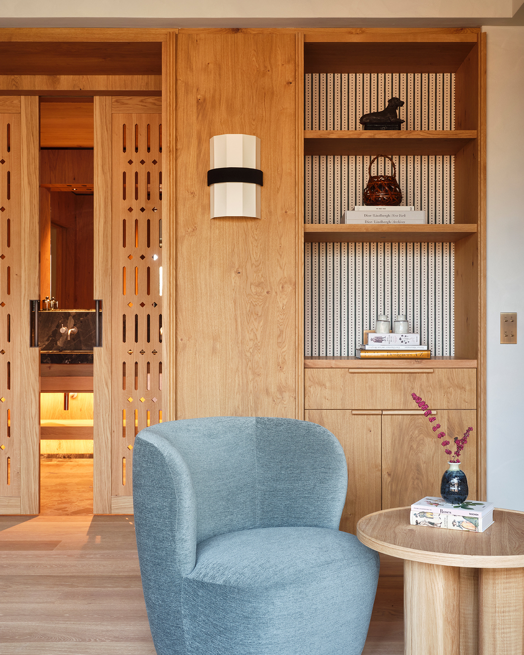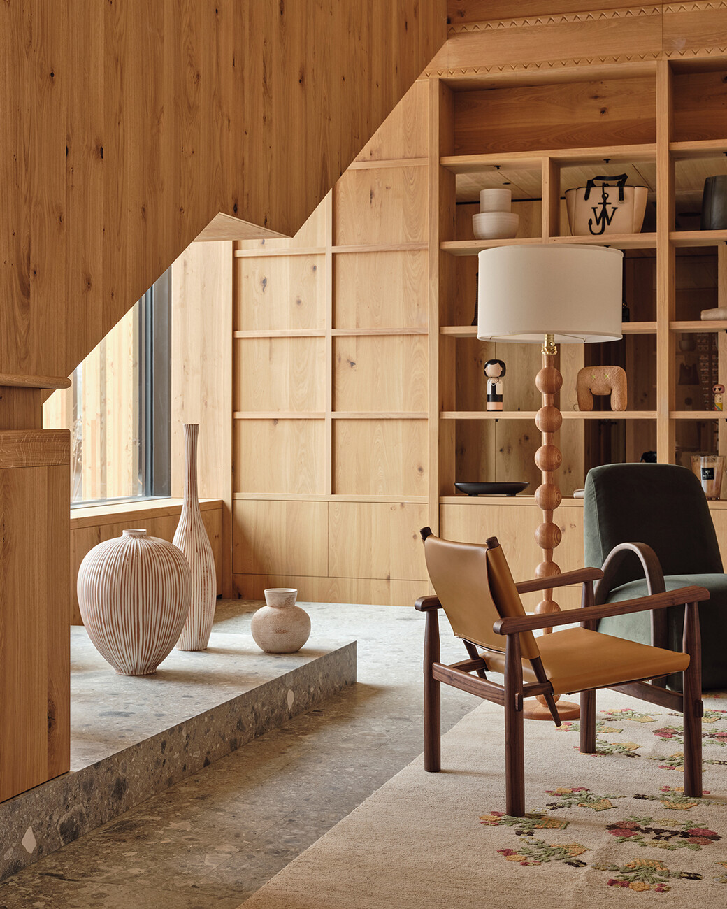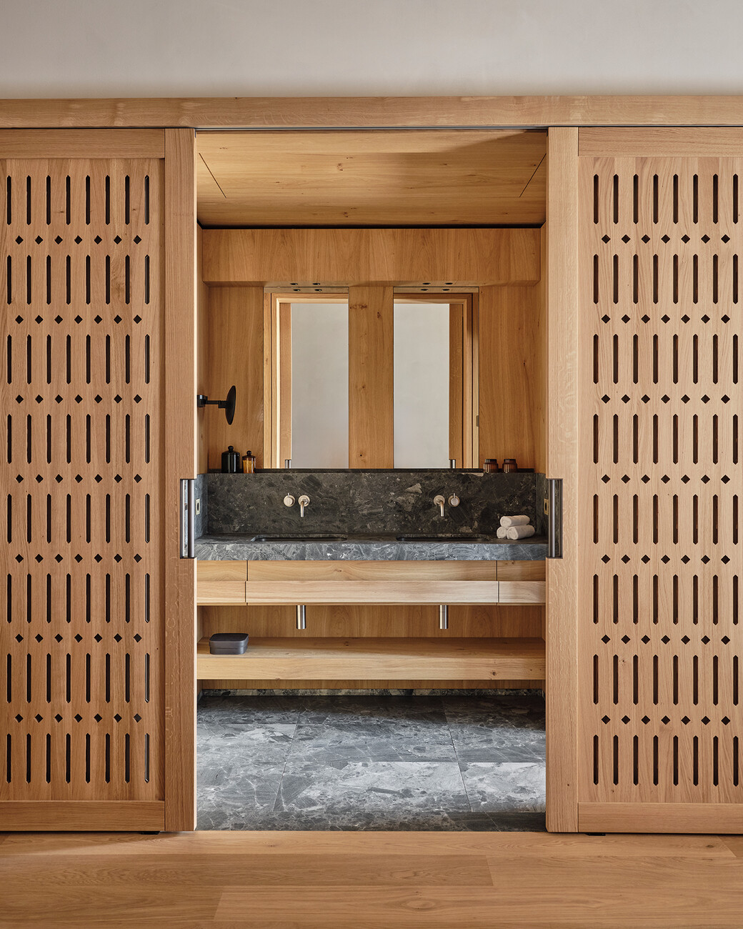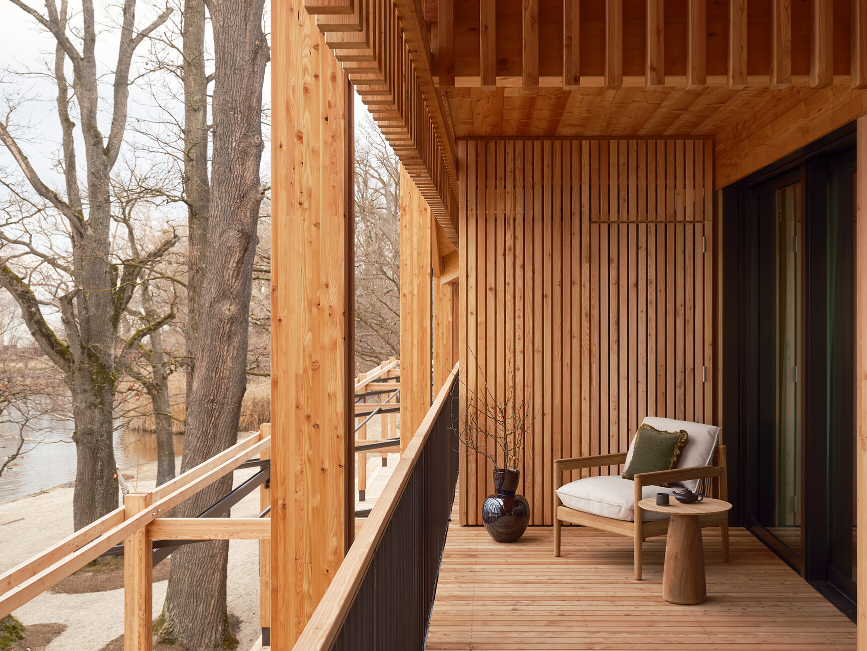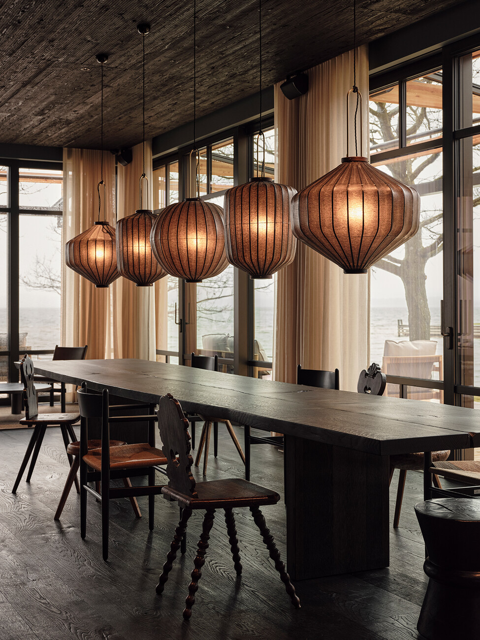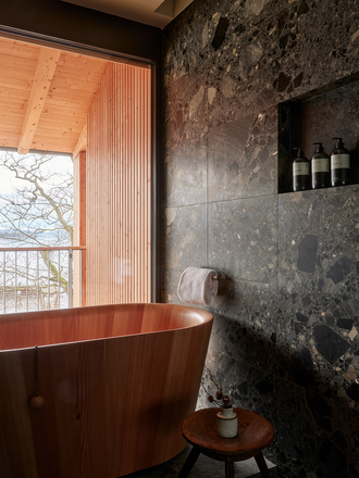 Carefully placed wooden wall panelling, floors and cabinets, also made of oak, transform the rooms into cosy retreats that open onto a loggia facing the lake. Carefully selected wooden furniture curves into the space and is complemented by soft textiles such as hand-woven recycled carpets and sheep's wool blankets from LPG Studios in nearby Aschau. The bathrooms are lined with elegant dark Nagelfluh stone from the Alps, while the freestanding Ofurò bathtubs made of larch wood, designed by Matteo Thun and his partner Antonio Rodrigues for Rapsel, bring the Japanese bathing tradition to Bavaria. The boathouse on the lake shore is also in the Japanese tradition, with a dark outer shell made of flamed wood and interiors featuring a large fireplace in dark metal and stone. The pavilion with a bar and tearoom can be used for a variety of festive occasions.