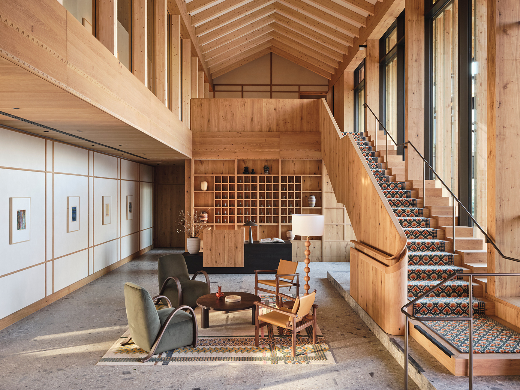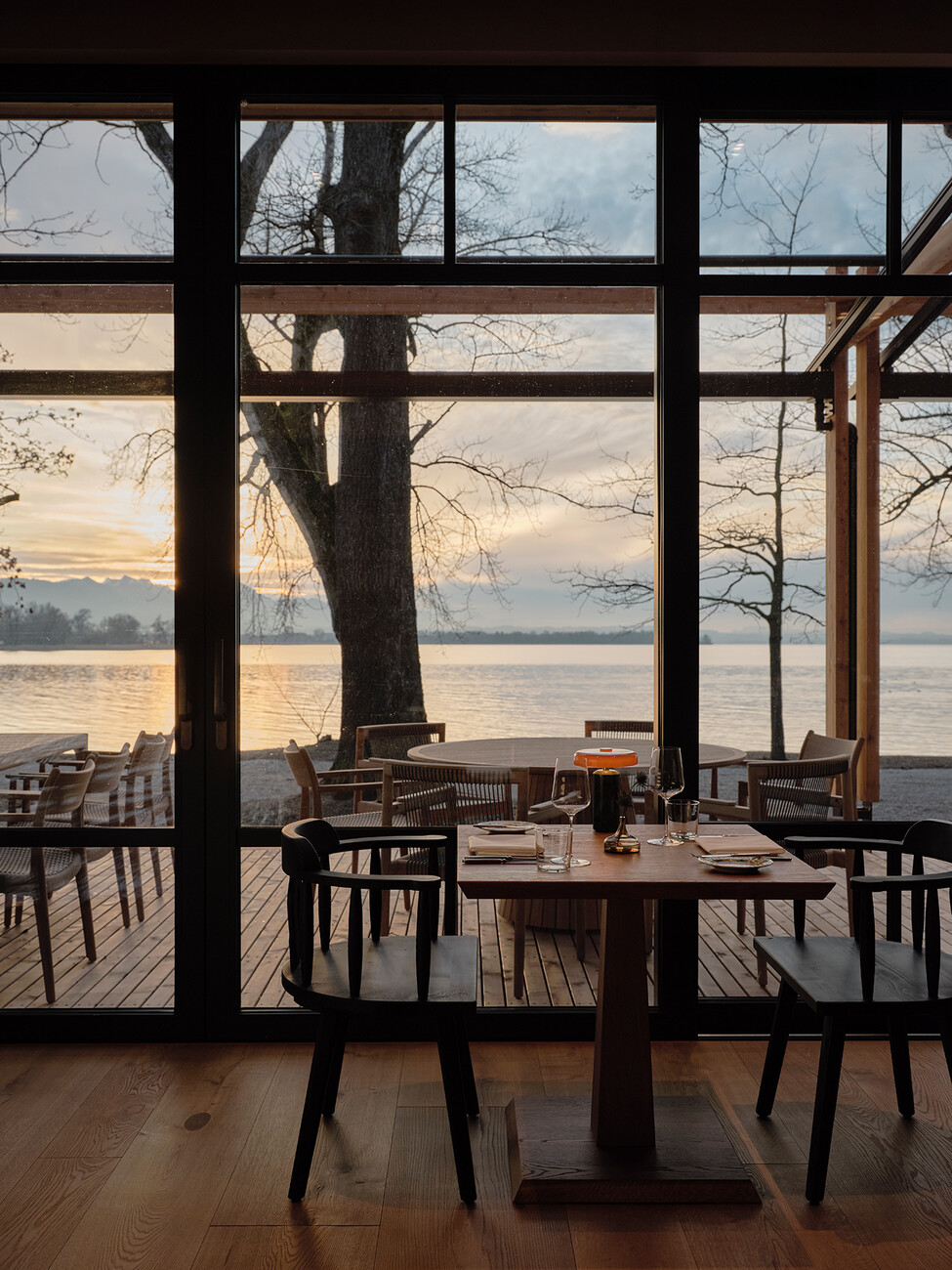 The central hotel entrance leads into a spacious lobby that extends up to the roof. From here, guests can enjoy a view of the lake through the front area as soon as they arrive, while two wooden staircases on either side lead up to the gallery and the rooms on the upper floor. The carefully selected range of materials used in the interior is limited to a selection of natural materials with regional woods. The stone floor made of Alpine Nagelfluh slabs alternates with oak parquet in the communal areas such as the lounge and the parlour on the lake side. There, the building opens up with floor-to-ceiling windows onto a pergola and the hotel's own Chiemsee beach with its own wooden jetty and landing stage.
