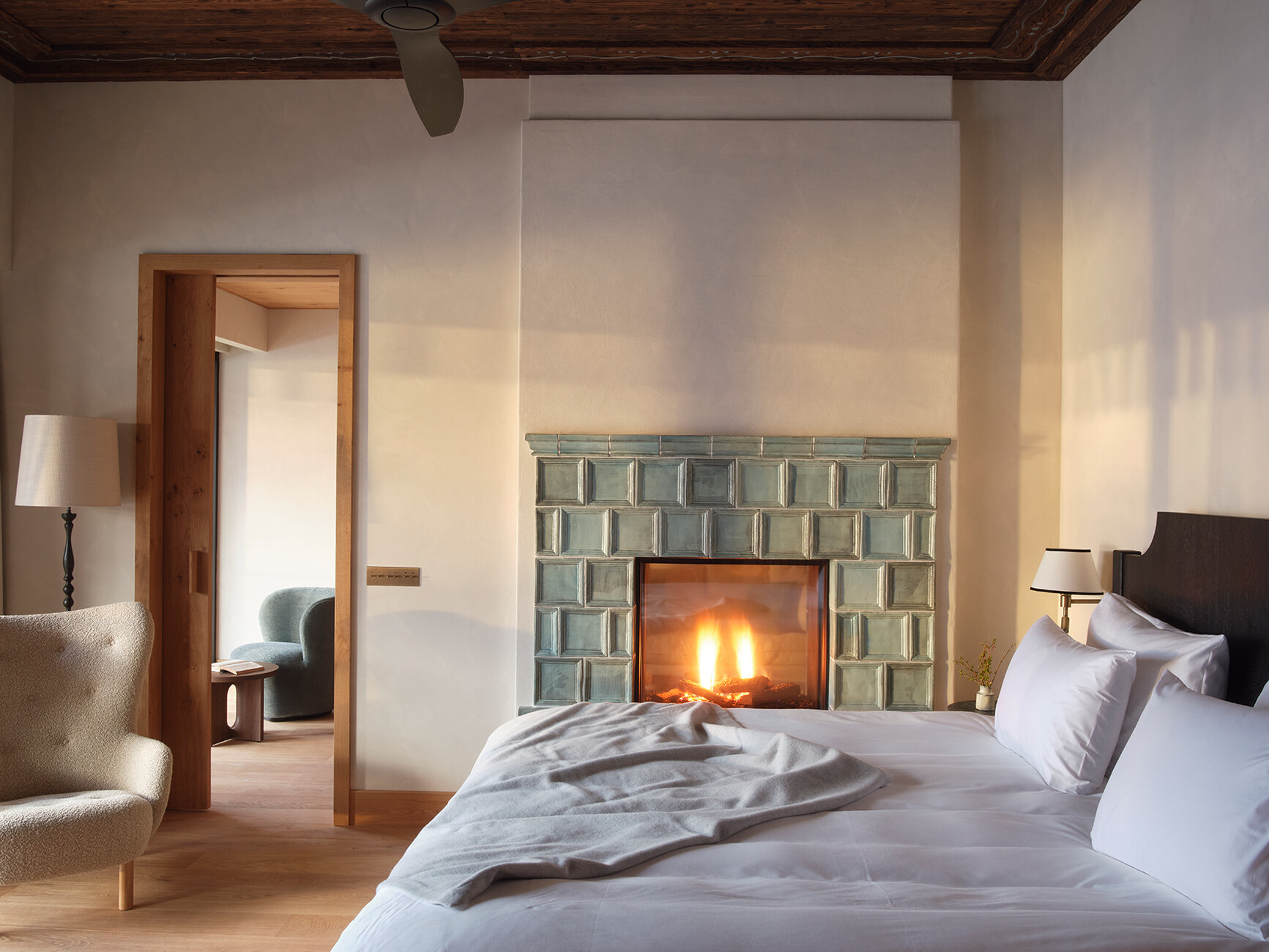 Inside and outside blend together on the ground floor on the lake side, where the pergolas in front of the house and the old trees are incorporated into open, light-flooded areas. Timeless upholstered furniture is grouped in the lounge around a cosy central tiled stove, which was laid with tiles from the Kampfleuthner pottery on the island of Frauenchiemsee. Historic furniture from the region, such as the large painted wooden chests, complements the contemporary design of the furnishings, some of which were designed especially for the Chiemgauhof by Matteo Thun & Partners. This blend of regional ingredients and contemporary design also characterises the rooms and suites.