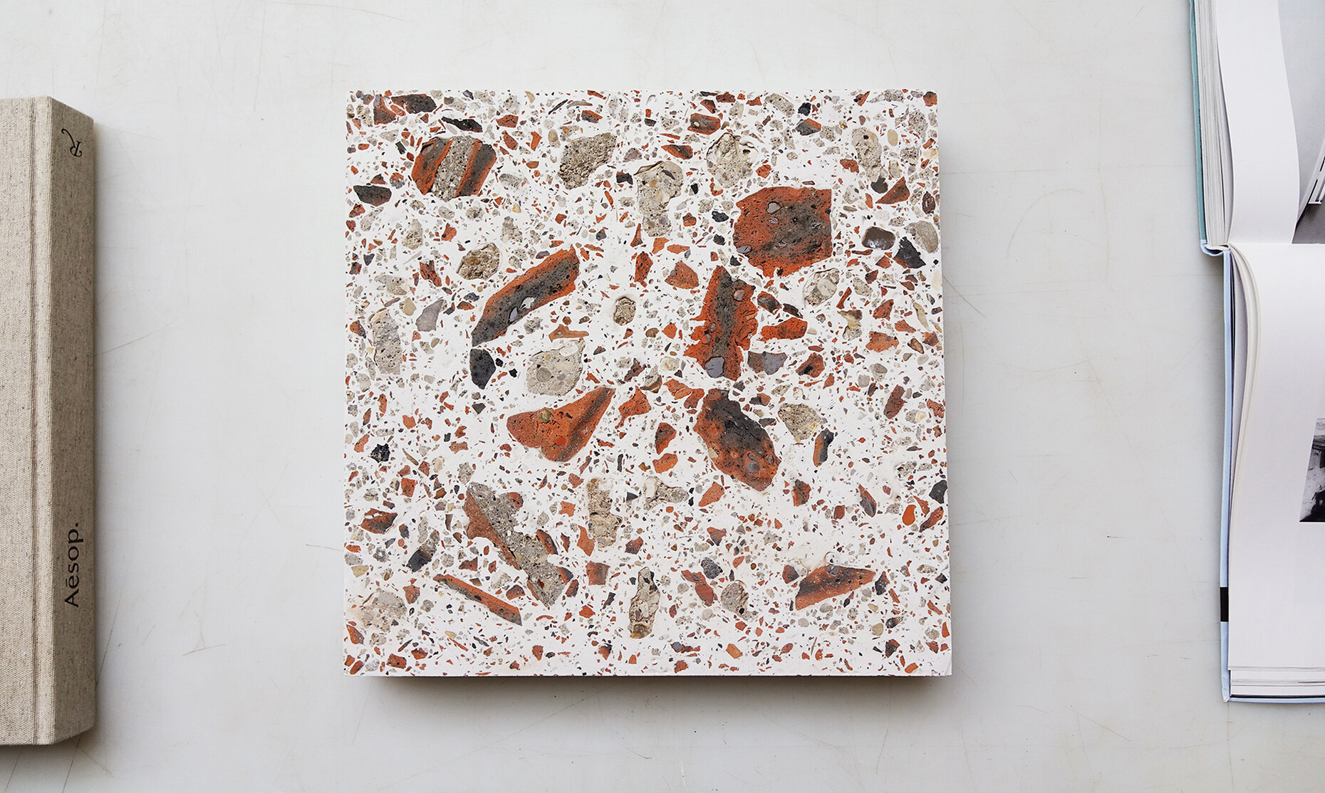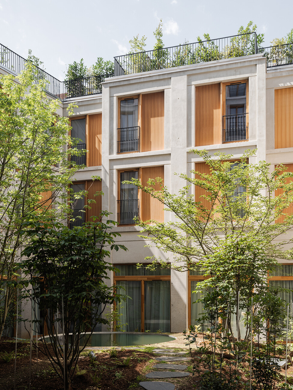 Alphonse Sarthout: Yes, for example, we used brick in the foyer, enamelled lava stone, natural stone, terrazzo, and brass. The concrete ceilings in the rooms bear the imprint of the wooden formwork used in construction—a nod to the making-of process.