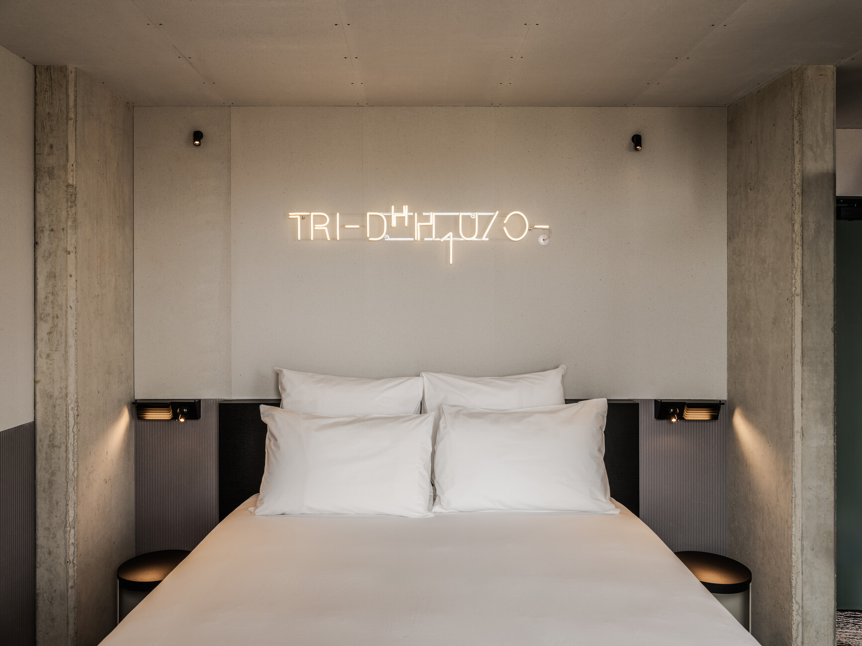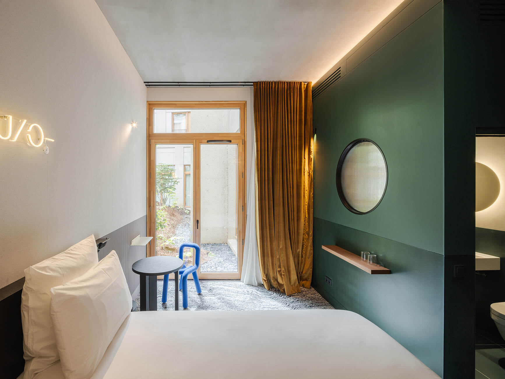The interior of Hotel Tribe Clichy also incorporates craftsmanship, referencing the industrial history of this Parisian suburb.