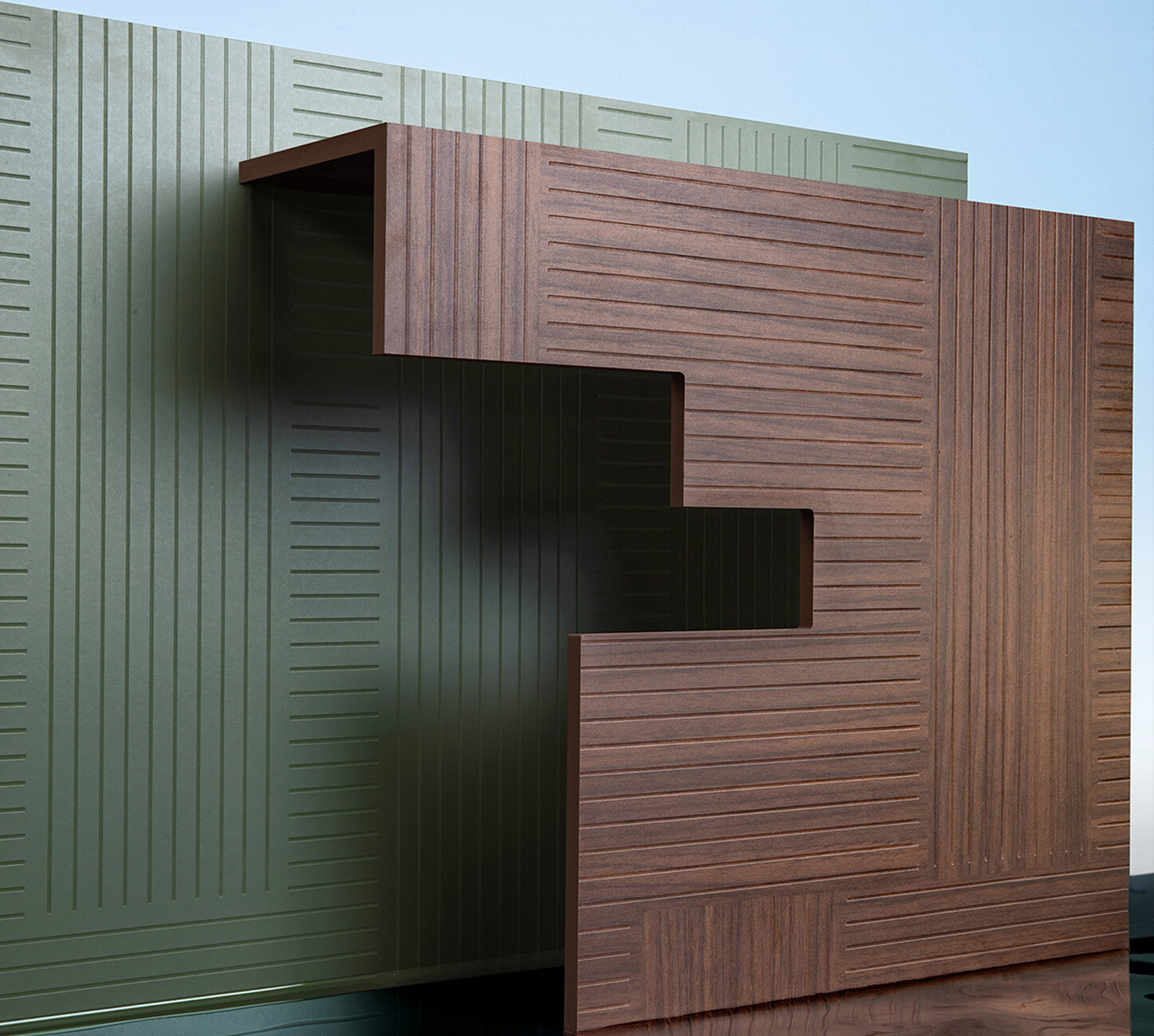 Cleaf, the Italian manufacturer of coated panels, laminates and edgebands for furniture as well as interior design found the inspiration for the "Jiometori" texture in a unique place: the impressive tomb in San Vito d'Altivole, which Carlo Scarpa designed in the 1970s to honour the industrialist Giuseppe Brion. With an interplay of geometric forms and the skilful use of decorative materials such as Murano glass, gilding and lime plasters, the building made of reinforced concrete has a sculptural character that remains fascinating to this day. Cleaf has translated the composition of the geometries into an artistic texture collection for "Jiometori", which is available as a top board, laminate and ABS edge. In combination with decorative papers, plain colours or metal and stone effects, a wide range of exciting surfaces can be created with "Jiometori". Due to the 3D structure, the texture can also be experienced haptically. (am)