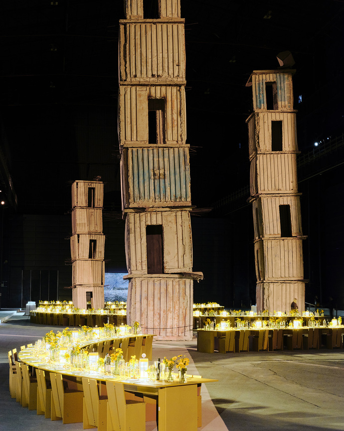 Calvi Brambilla & Partners: The installation was imagined as a space to live in, not just something to look at. Instead of a traditional setup, it feels like a shared landscape — something you move through, sit down in, and become part of it. Inside the dramatic setting of Anselm Kiefer’s "The Seven Heavenly Palaces", a long, curved table cuts through the space, inviting people to gather, talk, and stay together. Around it, 300 chairs — all made with Cleaf surfaces — feel like a quiet audience, ready to join the conversation. Light and scale play a big role too. Out of the darkness, the bright yellow phone booth stands out, surrounded by a hundred small lanterns inspired by its shape. In the end, the whole setup feels like a kind of stage for connection — where materials, memories, and ideas all come together.