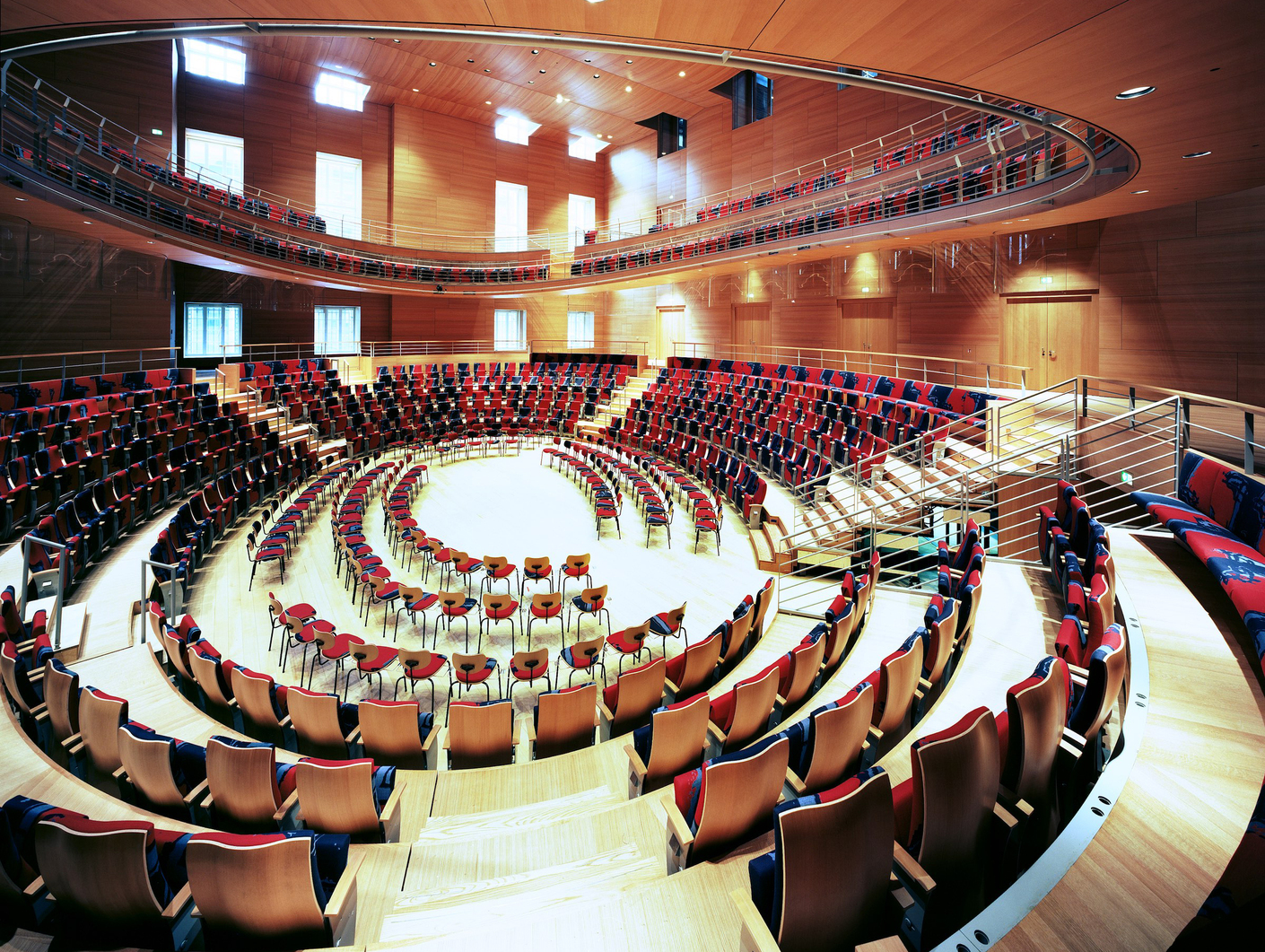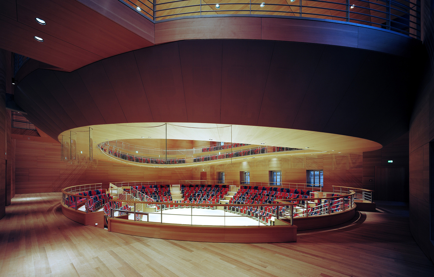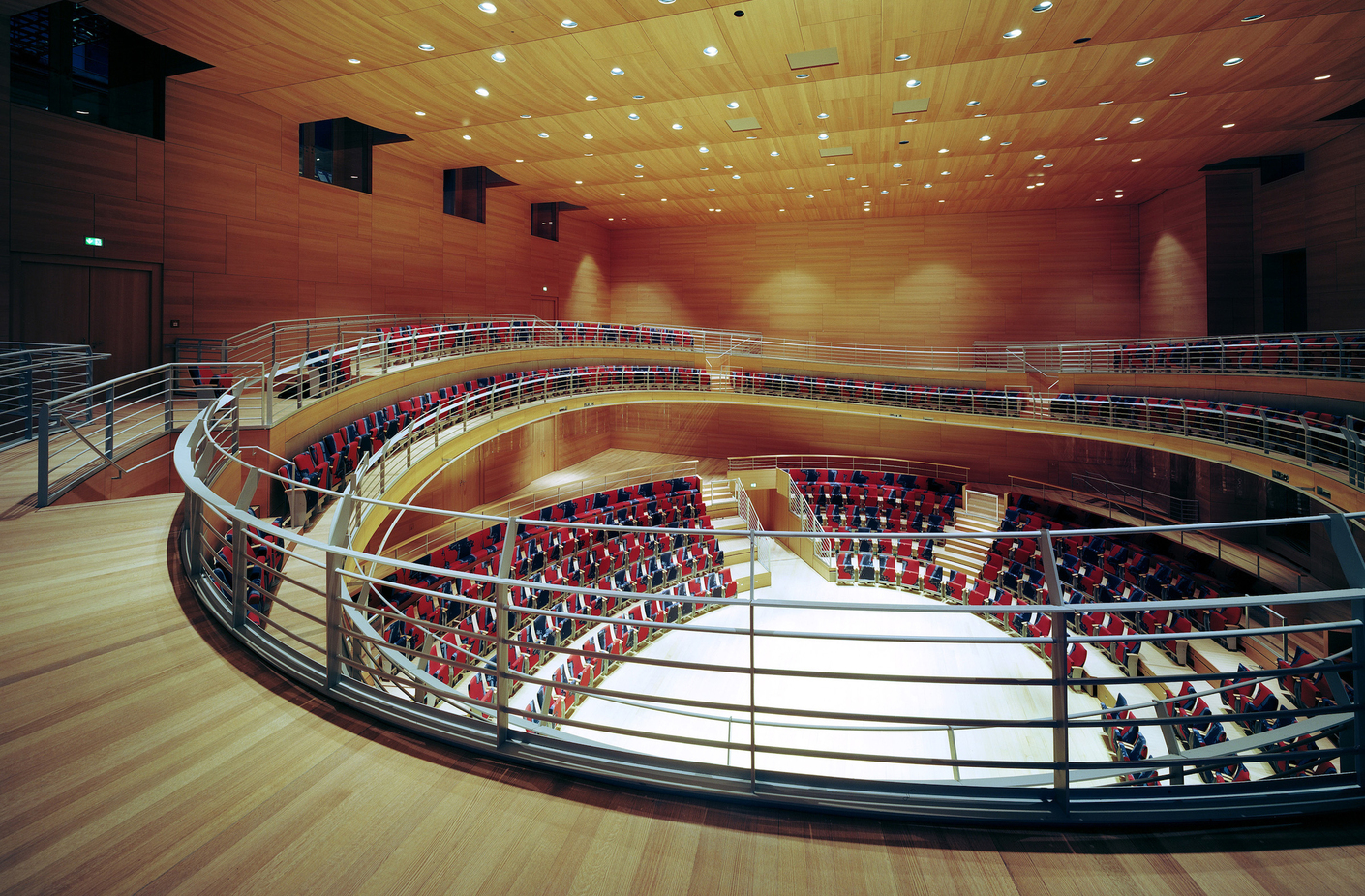 The vast majority of the maximum 620 visitors will sit in the stalls, where the seating can be varied and can therefore be adapted to the particular concert or lecture setting: The audience may sit round the orchestra, or simply in orderly rows facing it. The gallery is home to only two rows of seats and the viewers in the rear row would probably have to sit on bar stools if they really wanted to see the orchestra. But it is this gallery that creates the hall’s vibrancy. The basic orthogonal pattern evaporates here and becomes merely the skin, the home for a freer form. It is almost as if the entire space oscillated slightly, started to dance. One is almost wistful on leaving a concert and stepping back out into the angular foyer.