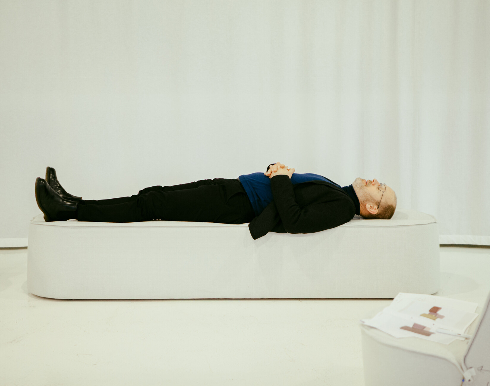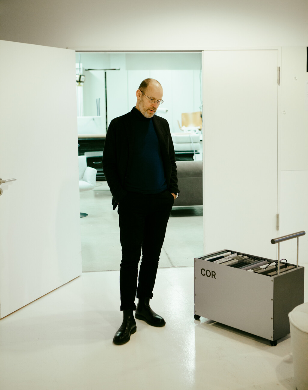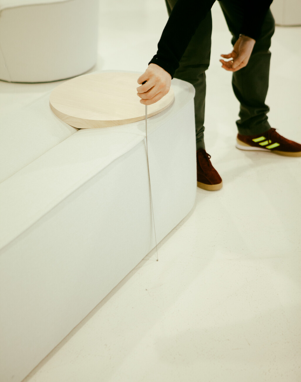 Various decisions still have to be taken prior to the premiere in Milan. For example, the colors for the zero-series of the furniture. Because the white covers for the prototypes was not a design decision. “It is simply the most honest of fabrics. You immediately see everything. No mistakes get pardoned,” says Christian Erpenbeck, explaining why all designs at COR are initially in white. Moreover, you can simply take a black felt tip to mark any changes planned on the white surface. Thus it is that at the end of the afternoon, what had been white furniture is now covered with all sorts of marks, lines and notes. “We’ve spent more than two years driving this project and we’re now taking it to Milan to present,” muses Leo Lübke. This year, the company will be present in its own showroom in the city centre for the first time during the Salone del Mobile. A decision Lübke also took because he is so firmly convinced that the “Nenou” is worth it. The time taken to develop the series is something he sees a bit as the call of Destiny: “Had we been quicker than we would not now be heading for Milan.”