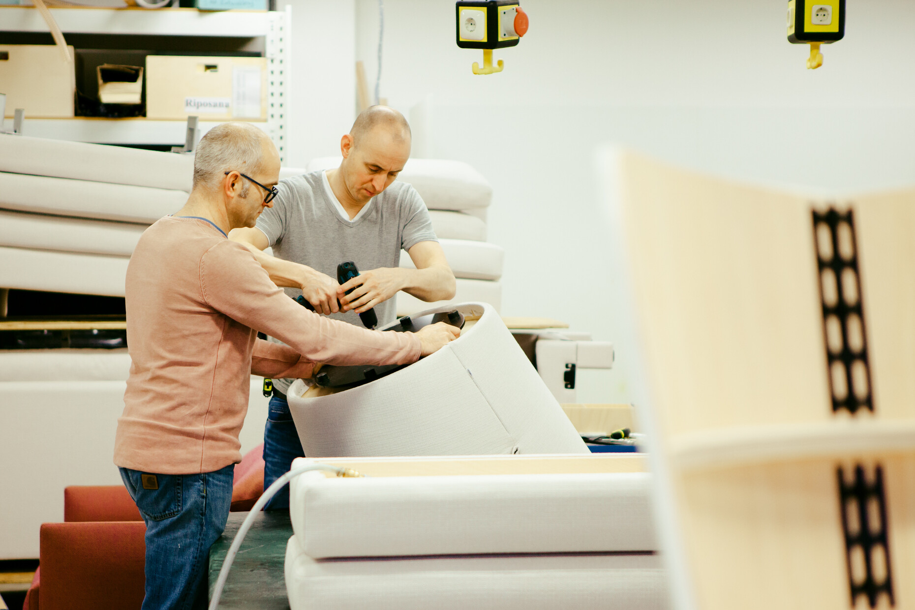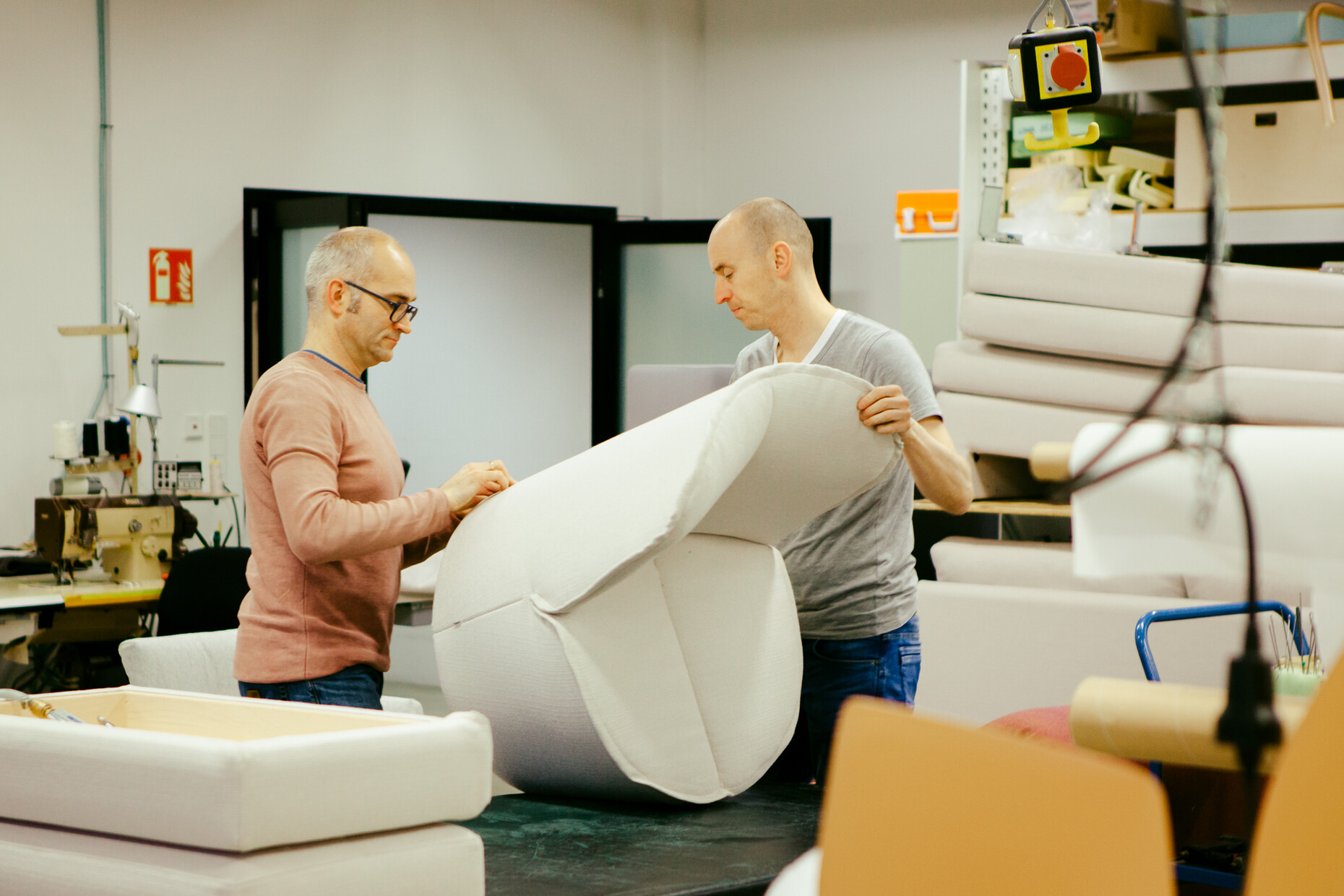 “I’m always happy when you need an elaborate process to make our furniture. Because then it is far harder to copy them.” Leo Lübke is standing in the large studio of his company’s R&D section and has between his fingers a panel of cloth – a broad ready-sewn edge of cloth. In the large, almost completely white hall stand a good dozen pieces of upholstered furniture – all of them boasting the same bright upholstery fabric. The new collection that the COR director is just carefully checking out together with designer Jörg Boner and product manager Christian Erpenbeck will be called “Nenou”. COR, based in Rheda-Wiedenbrück in central Germany, will be presenting it in Milan at the furniture fair this April. Boner has just arrived from Zurich to inspect how the COR engineers, cabinetmakers and upholsterers have translated his drawings and renderings into three-dimensional objects.