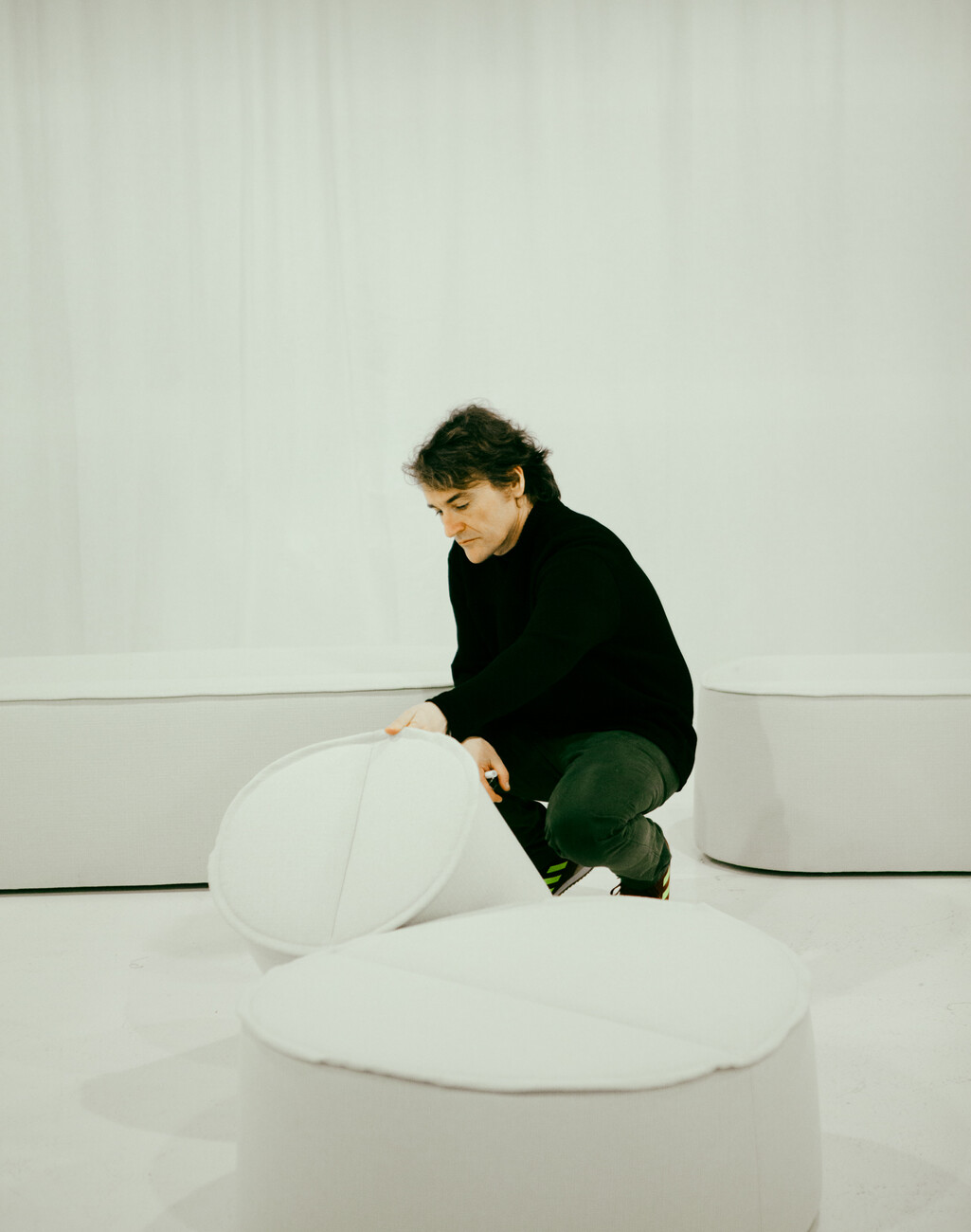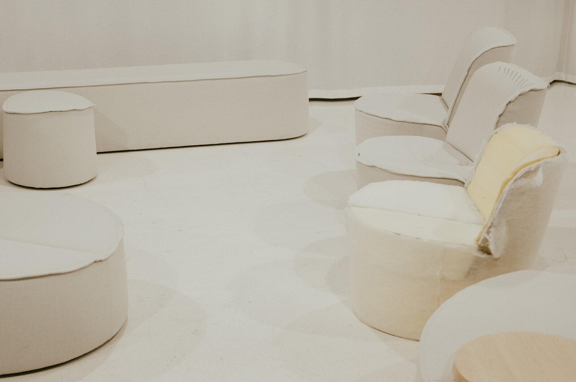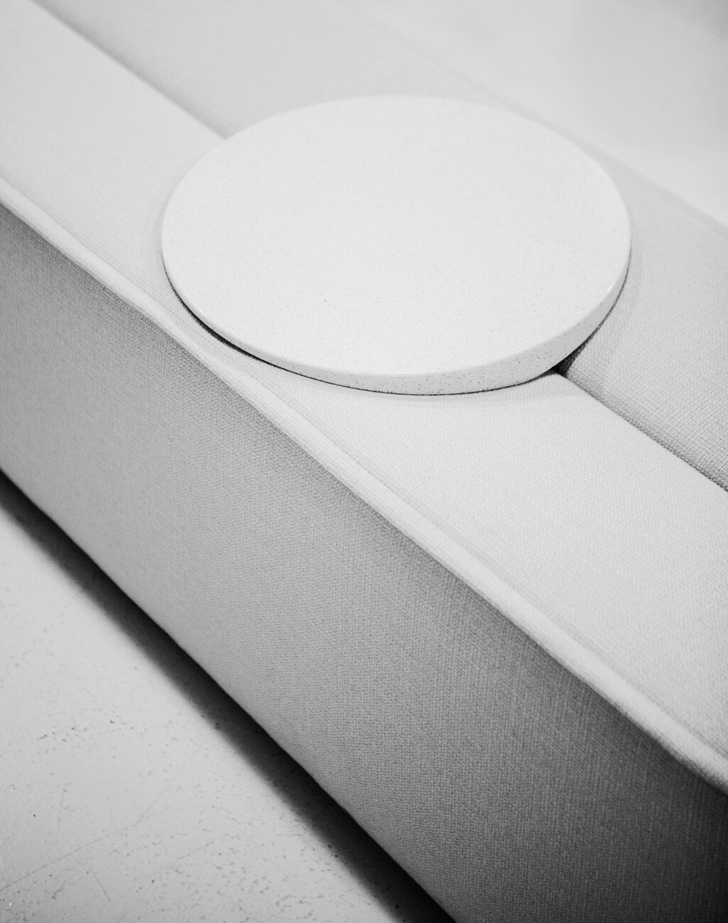 "COR had back then already for some time wanted to place a new design for an armchair, that could be used at a dining table instead of a chair,” is how Erpenbeck describes the original brief. And it was he who proposed that COR contact Jörg Boner. He has known Boner since their early days together at a small Swiss furniture maker, and really likes his work. “The briefing actually mentioned a small armchair,” Boner remembers. “We then drew a footstool, too, so you could put your feet up. At some point the project simply took on a life of its own.” As a result, the high armchair, the lower variant, and the footstool ended up accompanied by three seating isles – two of them oval, one narrow and longer. They all feature the characteristic wrap-around fabric panel. The seats of both the footstool and the islands boast a powerful central seam. As a result, the inspiration provided by the lily leaf becomes all the more apparent. Boner made use of this seam in the upholstery to create the actual trick in the tail of the series. He designed a small, tray-like table-top that can be placed on poufs and the bench. A spine on its underside join it to the seam. And the tray’s intrinsic weight (it’s made of marble, stone or solid wood) ensures it hardly moves if people sit down on the upholstered section – or stand up again.
