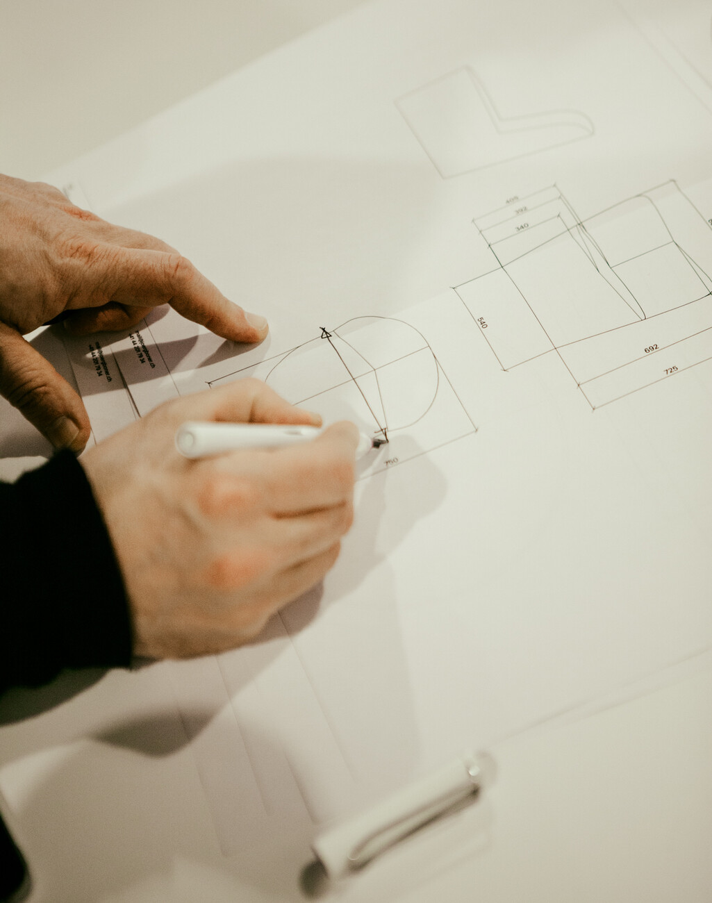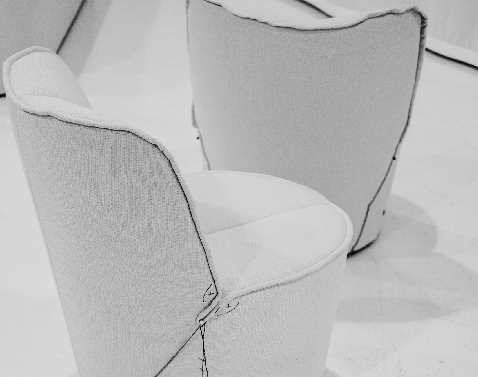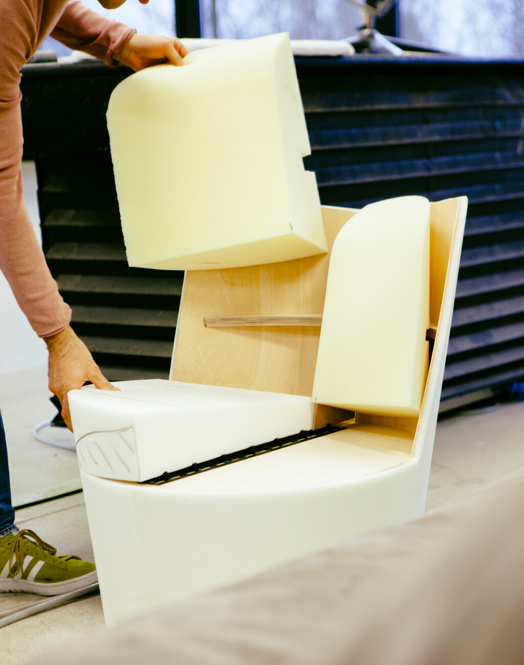 The use of prototypes is still indispensable to the joint of by designers and technical specialists. By no means everything can be decided by phone or email. Sometimes electronic communications are actually counterproductive. “We decided not to send Jörg any more photos of prototypes,” Christian Erpenbeck recalls. “They always give a ghastly impression of things and their value thus tends to be zero.” So it is that the trio moves from prototype to prototype, armed with a measuring tape, pins and a felt-tip, hunting for the ideal proportions, the right run of the seams, the best compromise as regards the seat length. “You gradually work your way forwards,” is Christian Erpenbeck describes the process. “In the final instance you keep on meeting until everyone is happy and everything is decided.” In the case of “Nenou” the process started as long ago as 2016.