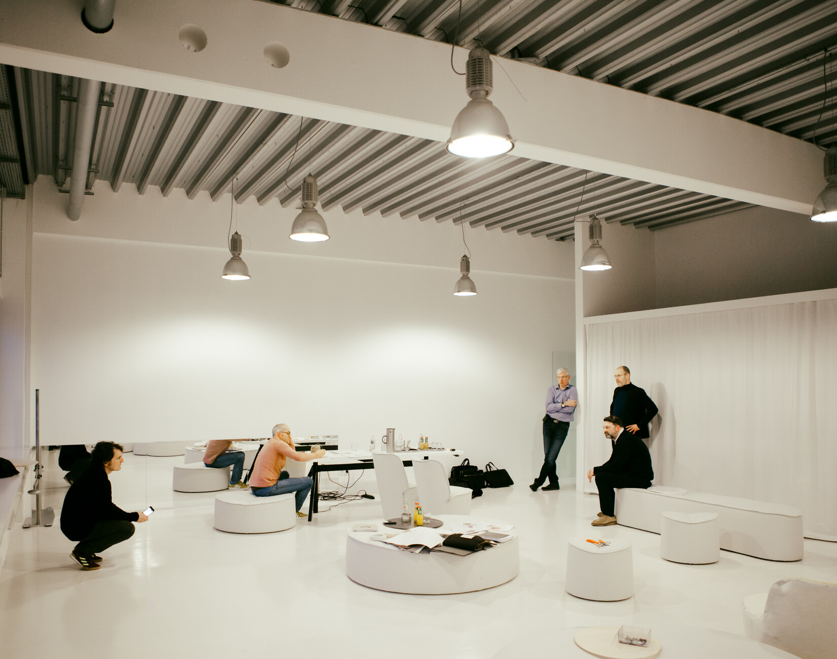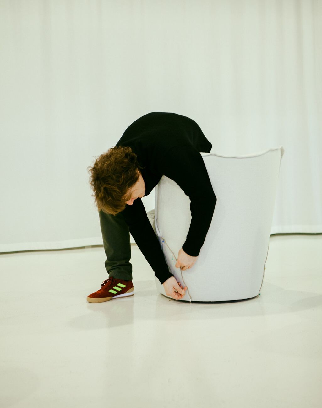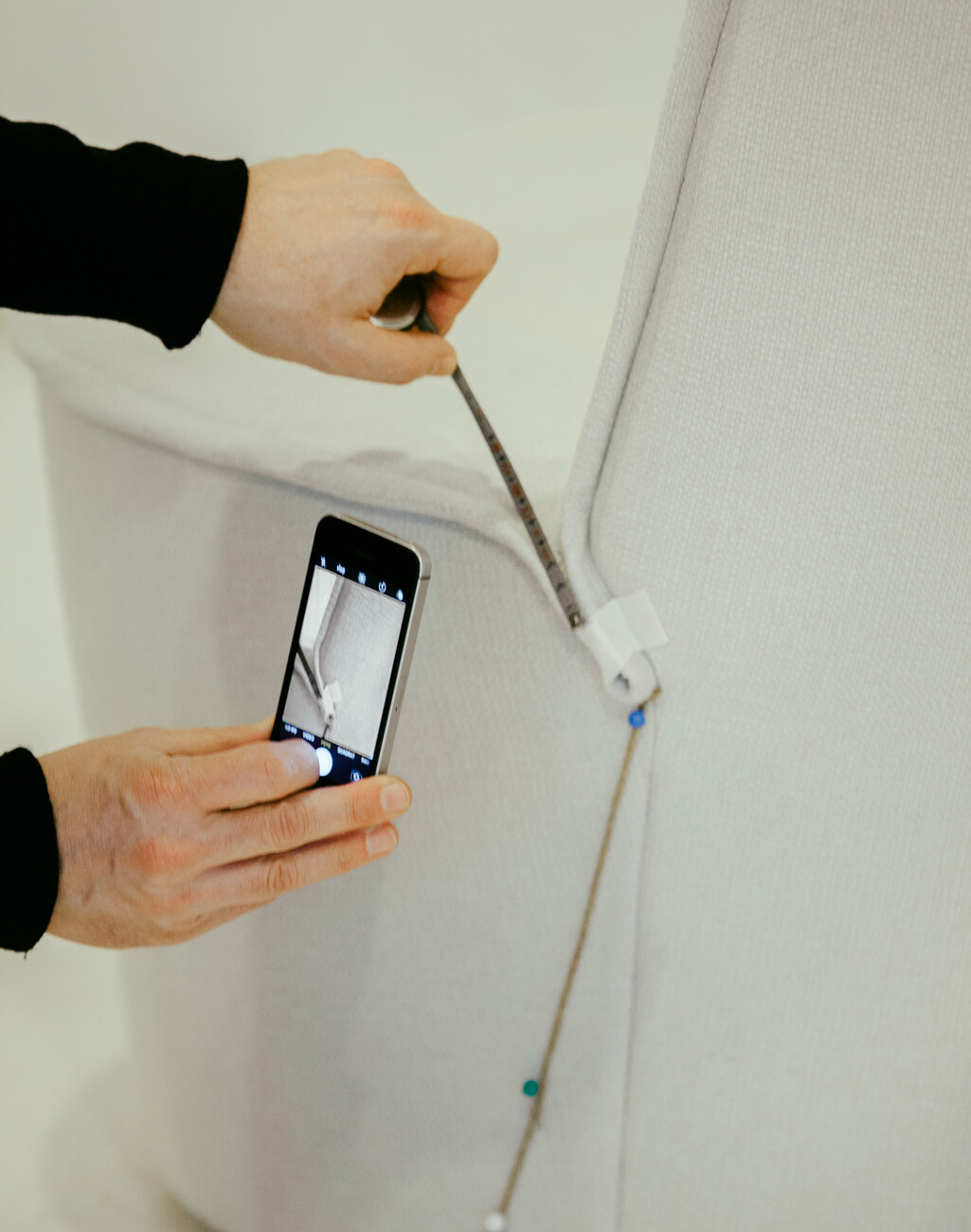 At the last meeting a few weeks earlier it had transpired that the fabric panel that Leo Lübke is just examining so closely could be a real deal-breaker. Because it plays a very decisive role in the design: It will embrace all the furniture in the collection and give them the characteristic appearance somehow reminiscent of a lily leaf. At the same time, the textile has a fine shadow to it that will lend the objects a greater sense of depth. So how wide will the strips of fabric need to be exactly? That is something that Leo Lübke, Jörg Boner and Christian Erpenbeck try to work out using a measuring tape. The three agree on a new version. “Here, the sewing workshop has sewn in a so-called lower flap,” Christian Erpenbeck explains. “As a result, the panel is stiffer and this minimizes bulging.” It may be elaborate to make, but it is simply better. Everyone concurs that the version with the flap will be used.