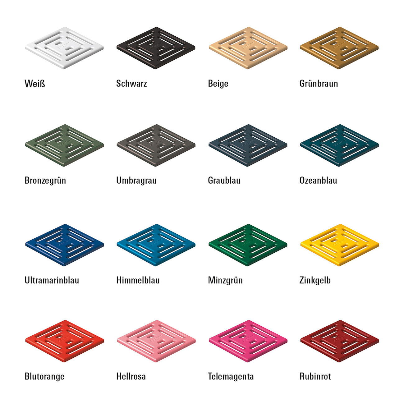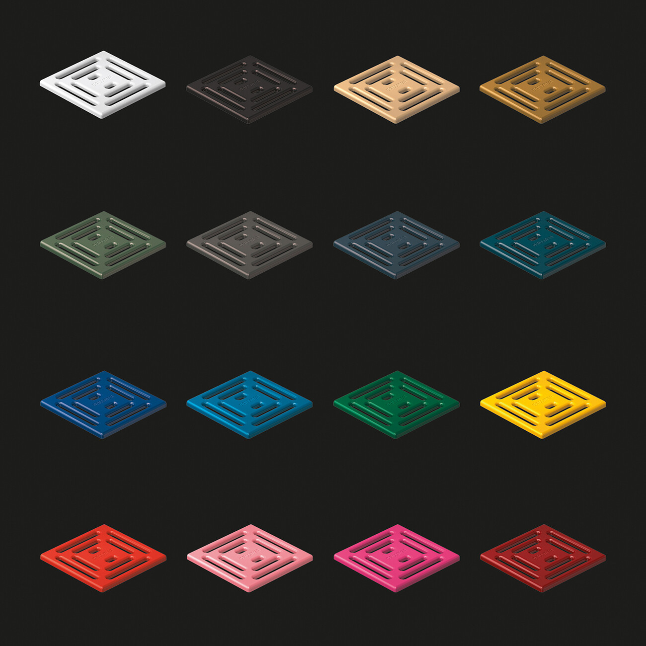 The square stainless steel grates of the new "ColourCollection" by Dallmer bring colour into the bathroom and give designers the opportunity to play with contrasts and colour accents. This makes them suitable for hotels, companies or public facilities, among others, in order to precisely reflect the corporate identity of the respective building owner. The matt lacquered grates of the "ColourCollection" have a striking perforated pattern and are available in the colours black and white as well as the 14 RAL colours beige, green-brown, bronze-green, umbra-grey, grey-blue, ocean-blue, ultramarine-blue, sky-blue, mint-green, zinc-yellow, blood-orange, light-pink, telemagenta and ruby-red. In addition, they can be individually painted in the desired colour and are available in the sizes 100 x 100 millimetres and 120 x 120 millimetres. The "ColourCollection" is compatible with Dallmer's "DallDrain" floor drains. They expand the "DallDrain" system family, which offers a flexible and easy-to-install floor drain that can be used in flush-to-floor showers and other surfaces that require drainage.