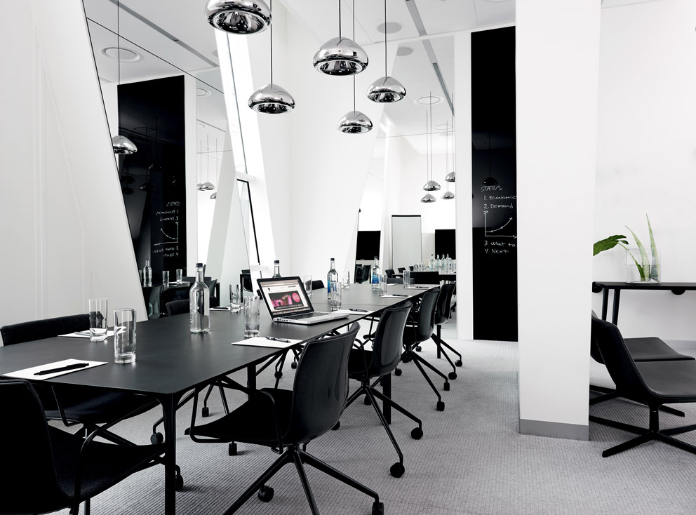 Detailed monochromatic color concept: The architects play with sharp black/white contrasts in the conference rooms. Photo © Salva Lopez