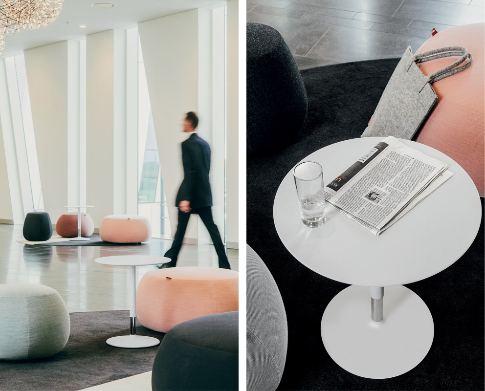 Soft colors in the public zones: The Poufs from the “Pix Mini” line create color accents and provide comfy seating into the bargain. And for a short coffee break – use a “Pix” round side table. Photo © Salva Lopez
