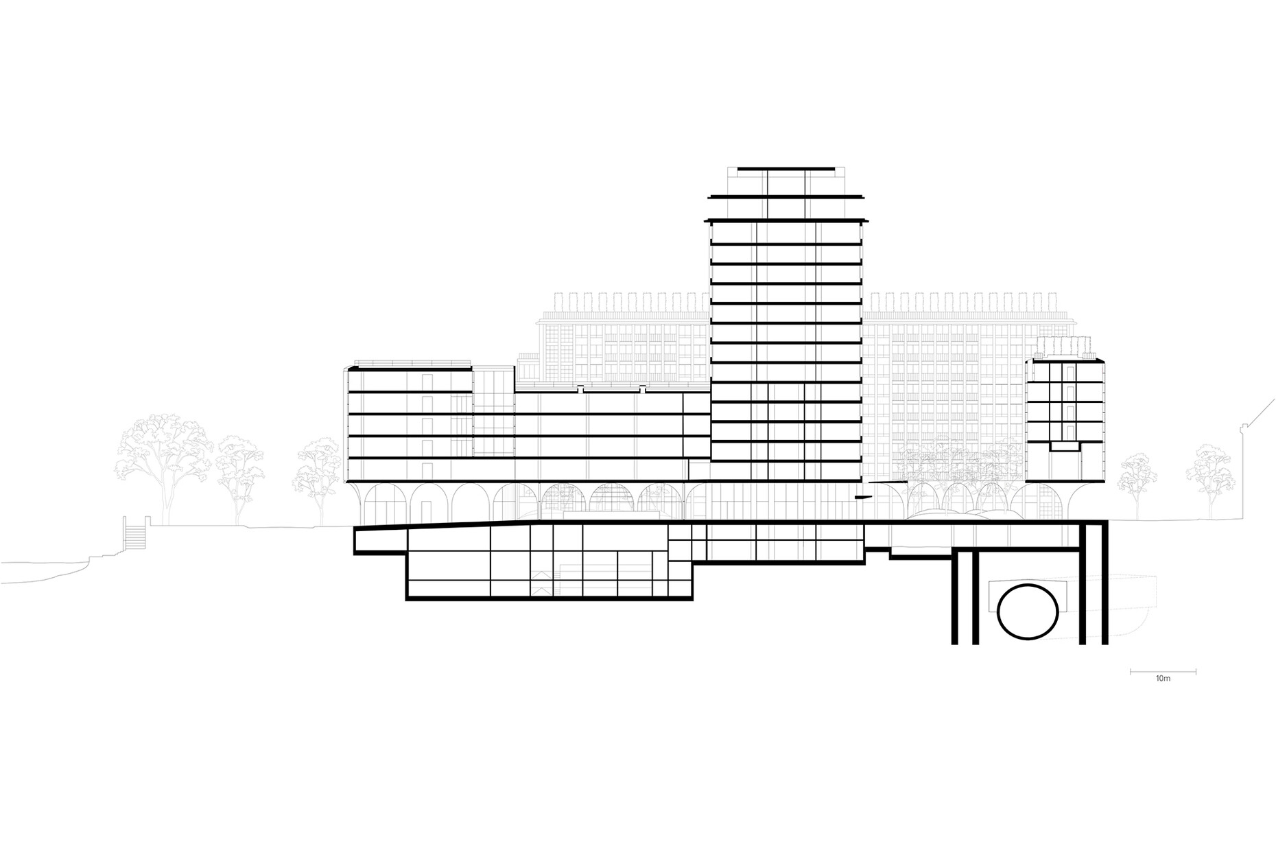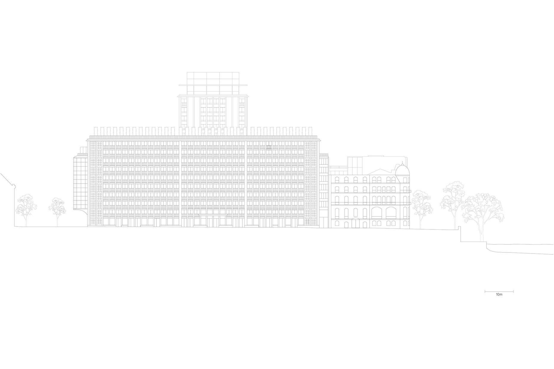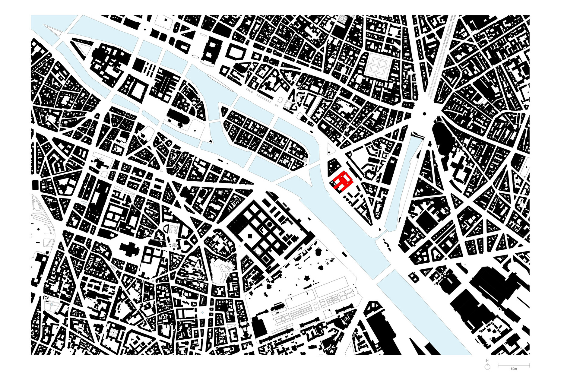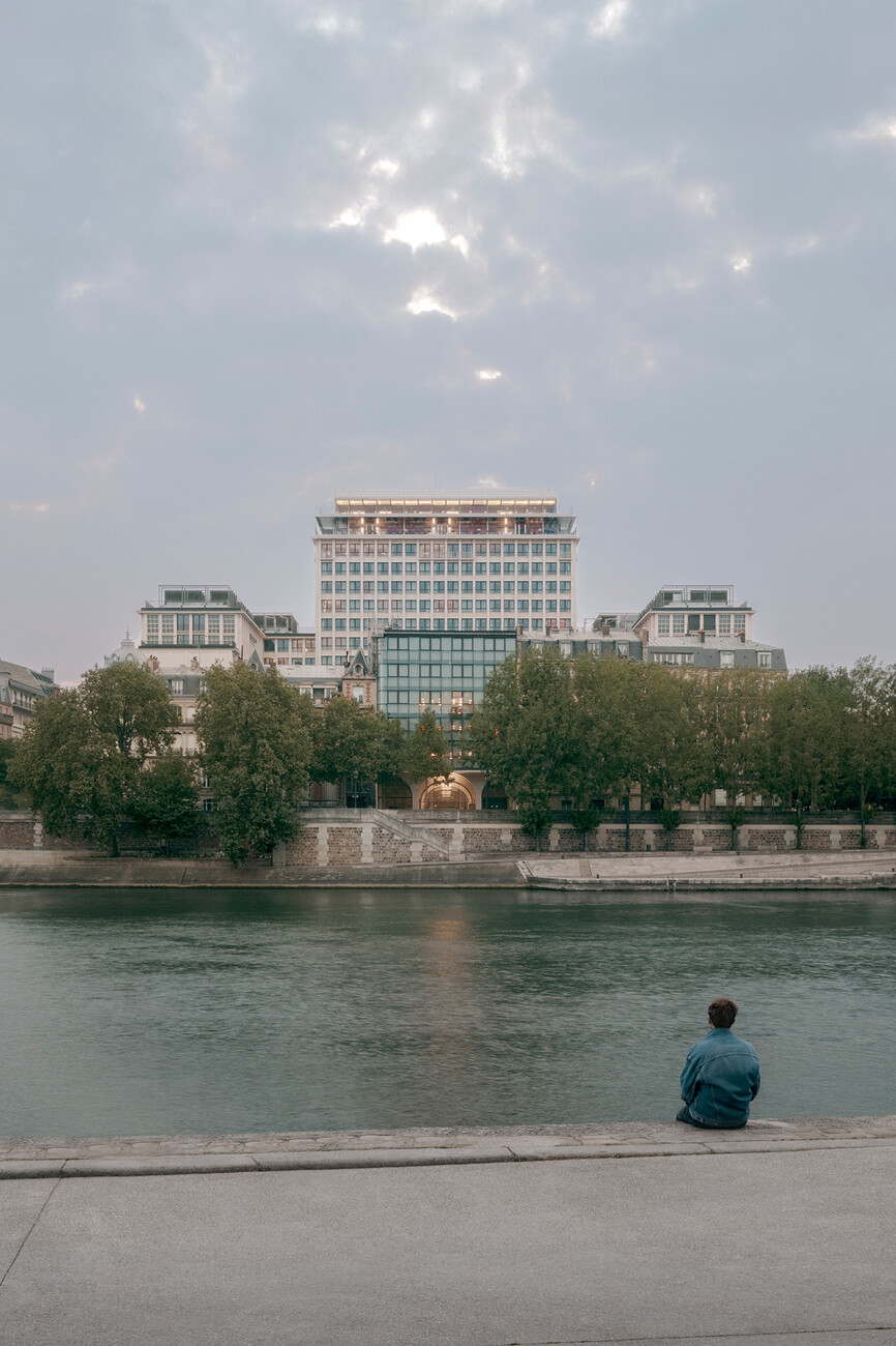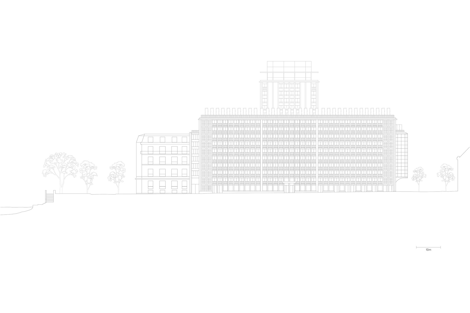 The project goes back to the Réinventer Paris competition, in which various teams consisting of architects, project developers, landscape architects and artists were asked to propose new concepts for 23 sites (squares and buildings) in Paris. The focus was on themes such as mixed use, urban density and sustainability. David Chipperfield Architects developed the project as a kind of campus, which was created in collaboration with Ólafur Elíasson and Sebastian Behmann from Studio Other Spaces and the landscape architects Michel Desvigne Paysagiste, among others, and which is intended to serve as a beacon for the surrounding district. To this end, they added two annexes to the existing 16-storey, H-shaped building, one towards the Seine at Quai Henri IV and the other along the Boulevard Morland on the other side. The first fills a gap between the existing buildings that connect to the Morland Mixité Capitale, while the second extension on Boulevard Morland is an elongated rectangle that delimits the previously open forecourt.