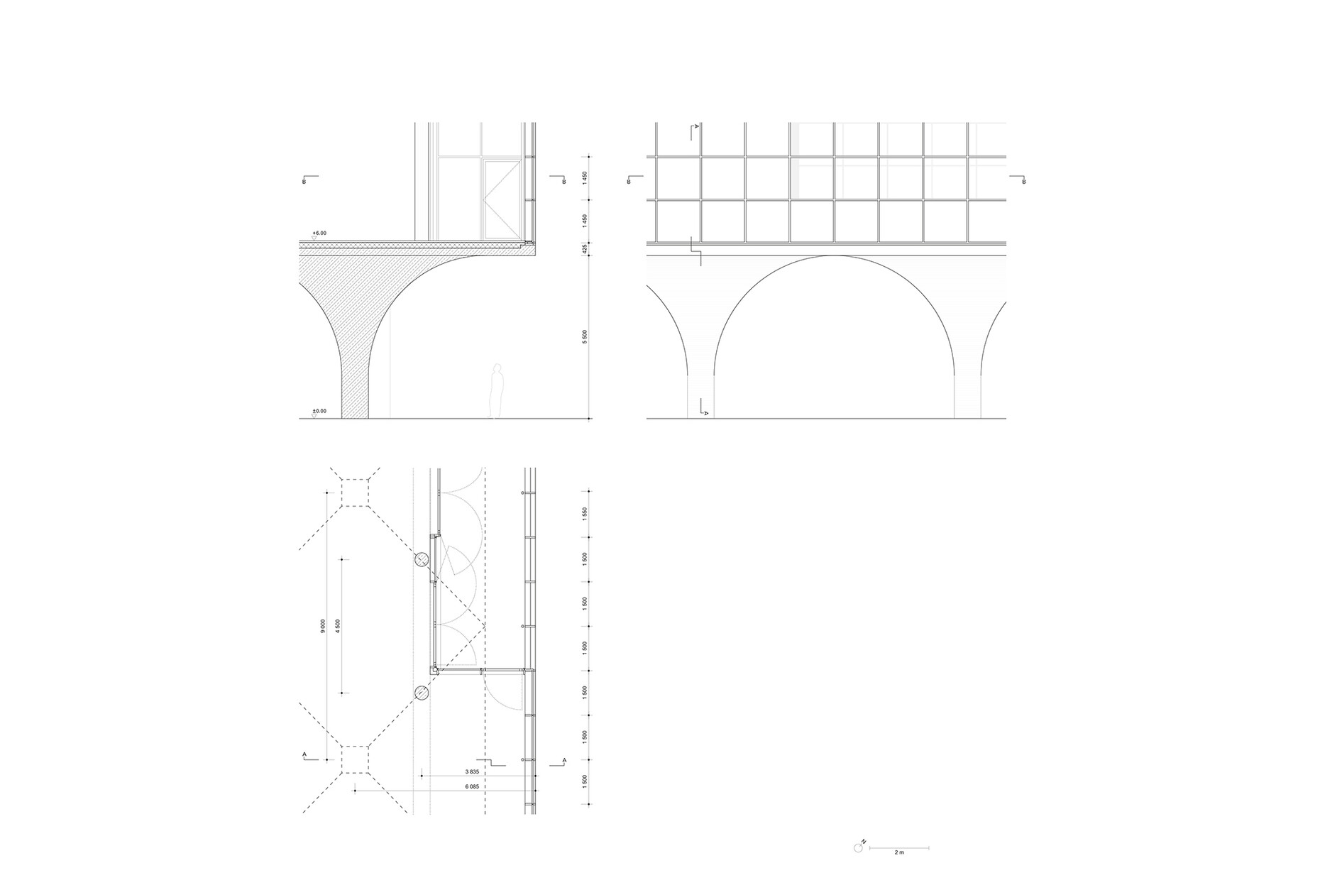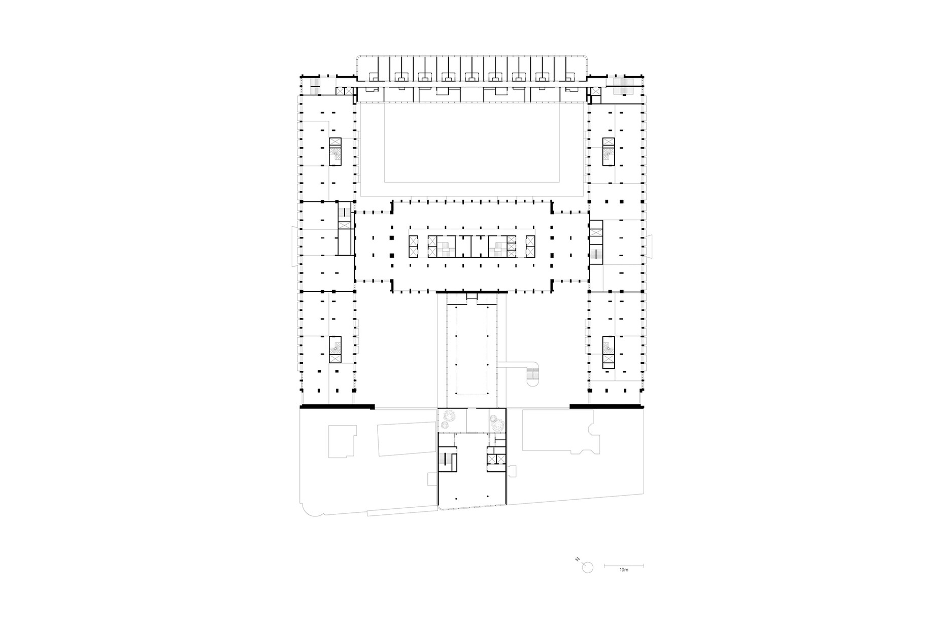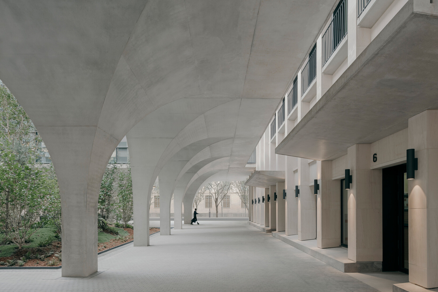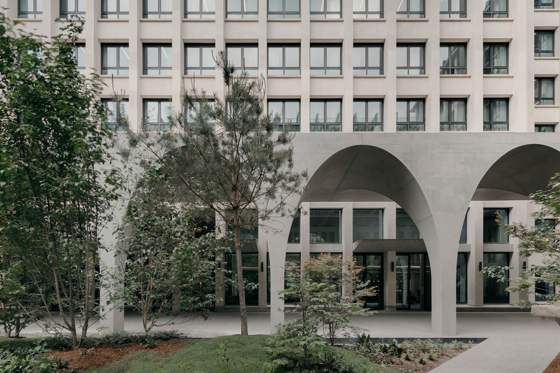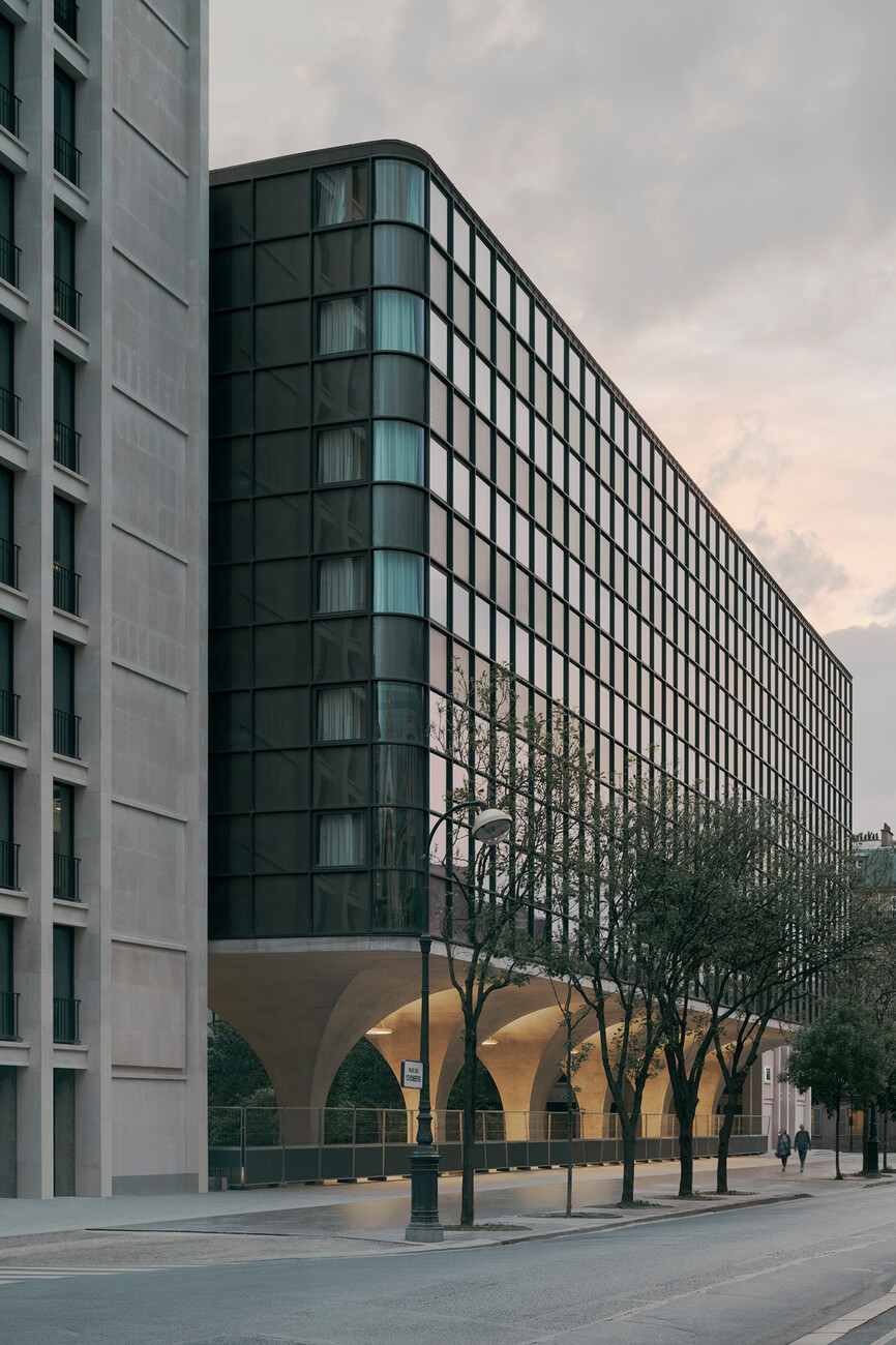 In addition to integrating the new building volumes, the existing buildings, which are structurally based on a skeleton of in-situ concrete with supports and façades clad in cream-coloured natural limestone, were also renovated. For this purpose, the natural stone cladding of the façade was cleaned and repaired, and damaged cladding replaced. David Chipperfield Architects responded to the call for a new mixed use of the Morland Mixité Capitale by designing open-plan floor plans that can be flexibly adapted to later conversions. This also applies to the vaulted arcades on the ground floor, which can be converted into indoor space if required. As the heart of the ensemble, the arcades create a new spatial zoning that on the one hand picks up on the strict grid of the existing building, while on the other hand is clearly recognisable as a new element due to its sculptural appearance. The landscape architectural design by Michel Desvigne Paysagiste and The Seeing City installation by Studio Other Spaces both create a subtly playful note that pleasantly counters the abstract monumentality of the buildings. A few additional elements in the same vein would certainly not have done any harm. The project is nevertheless a good example of how existing buildings can successfully be transformed into something new by means of a clear architectural concept and precise interventions – in order to enter into a dialogue with the surrounding city.