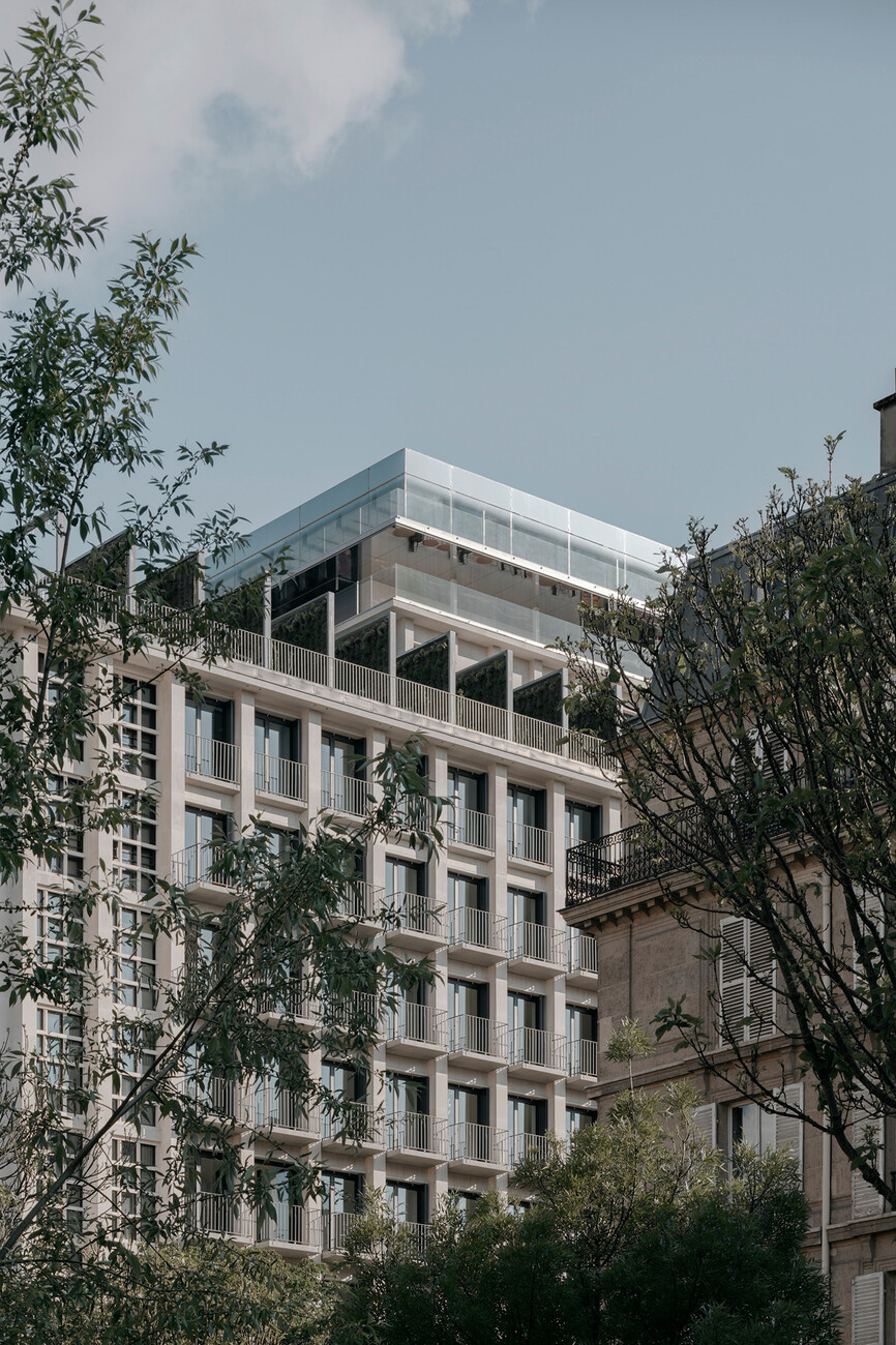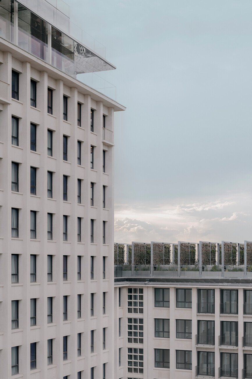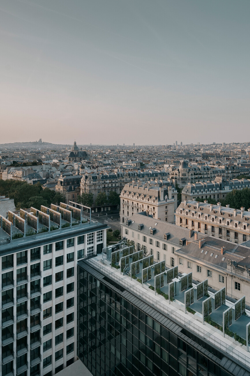 Both structures float as tightly rastered glass volumes above vaulted arcades made of in-situ concrete on the ground floor. The arcades form passageways, serving as new public access that opens up the interior of the complex to the outside and, among other things, provides direct access to the rooftop bar on top of the tower in the centre of the ensemble. In the process, the architectural interventions reorganise the outdoor space of the Morland Mixité Capitale by dividing the large courtyard on the Quai Henri IV side into two smaller inner courtyards and giving the forecourt on Boulevard Morland a more intimate character. Taken together, the result is a landscaped green area divided into three sections, interspersed with organically arranged paths. Both the green courtyards and the roofscapes serve as water reservoirs, the latter having vertically planted beds for urban gardening. These appear as green panels on the roof terraces and, due to their layout, enable 2,300 square metres of cultivation space on a roof that is only 590 square metres in size.